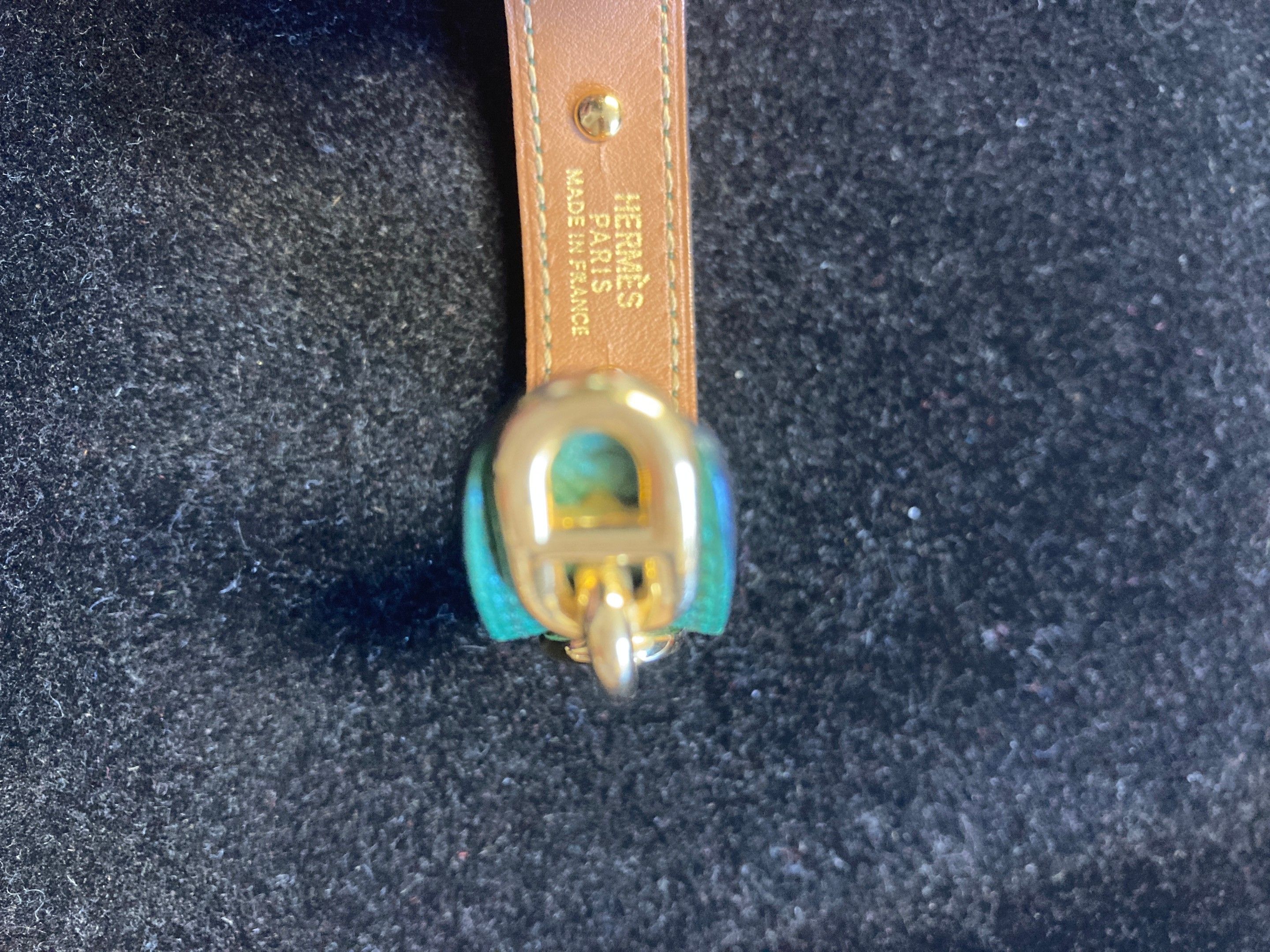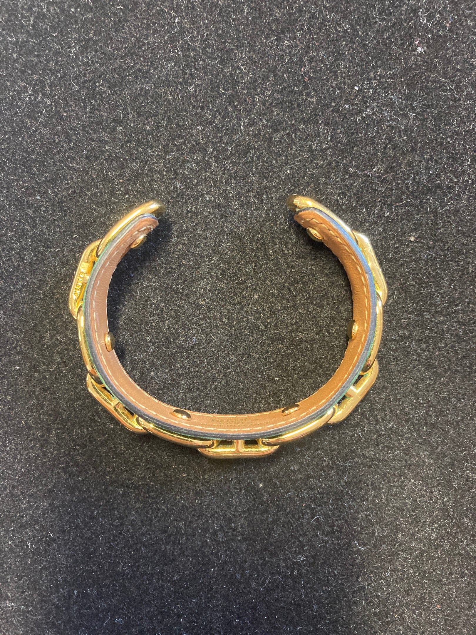 HERMES. Un bracelet rigide chaîne d'ancre en cuir vert et métal doré. Dim. : 7 x 5,5 cm.