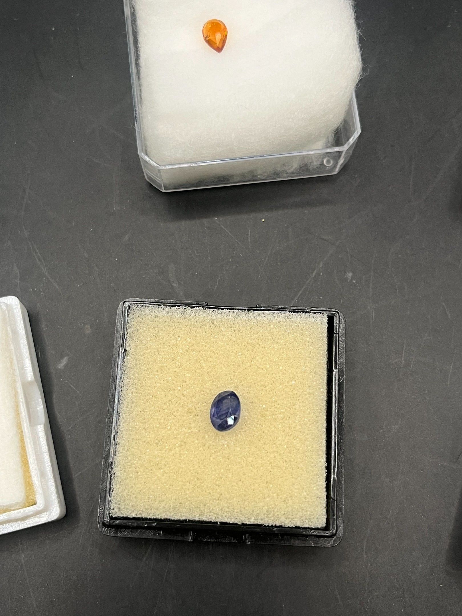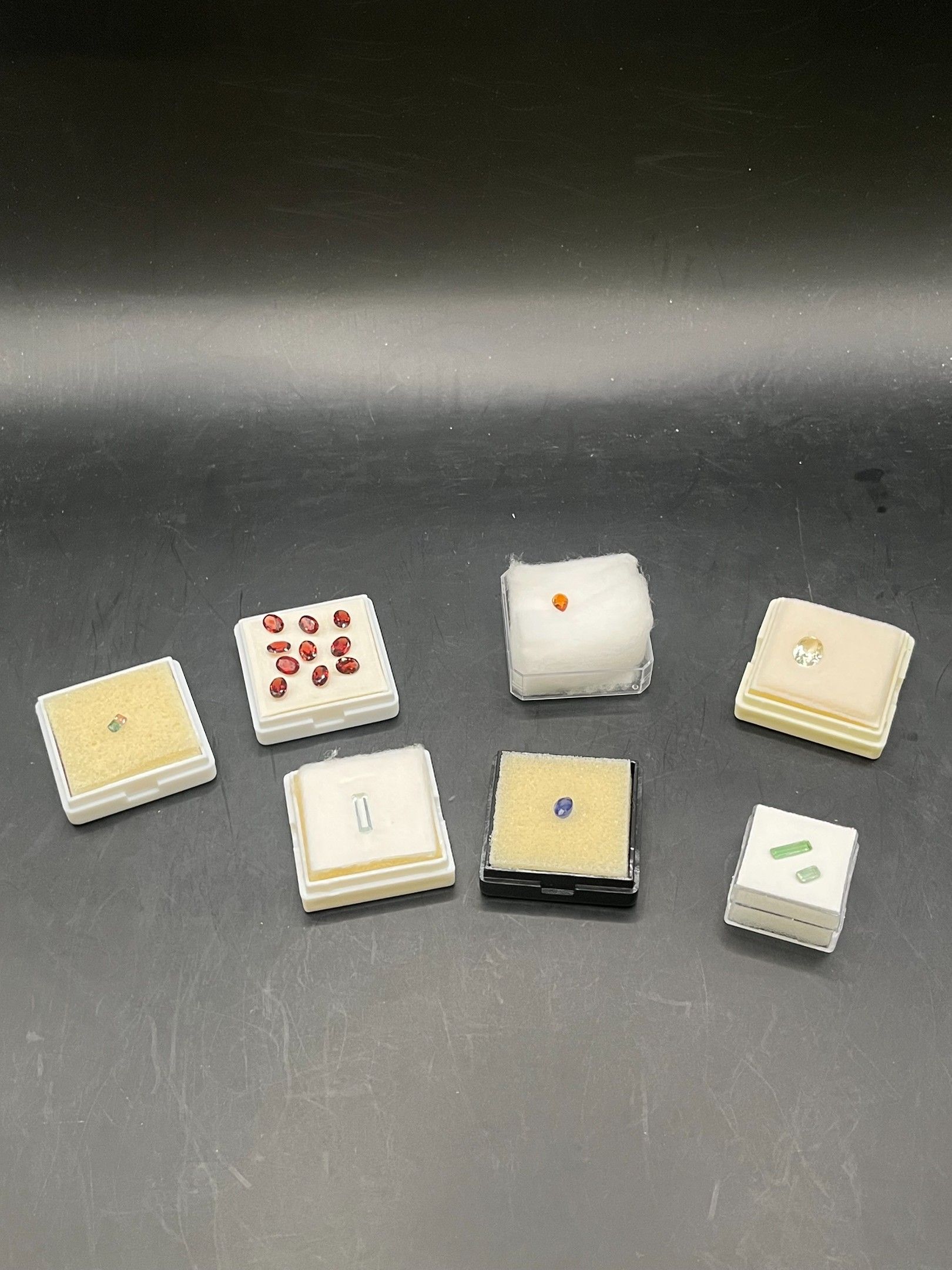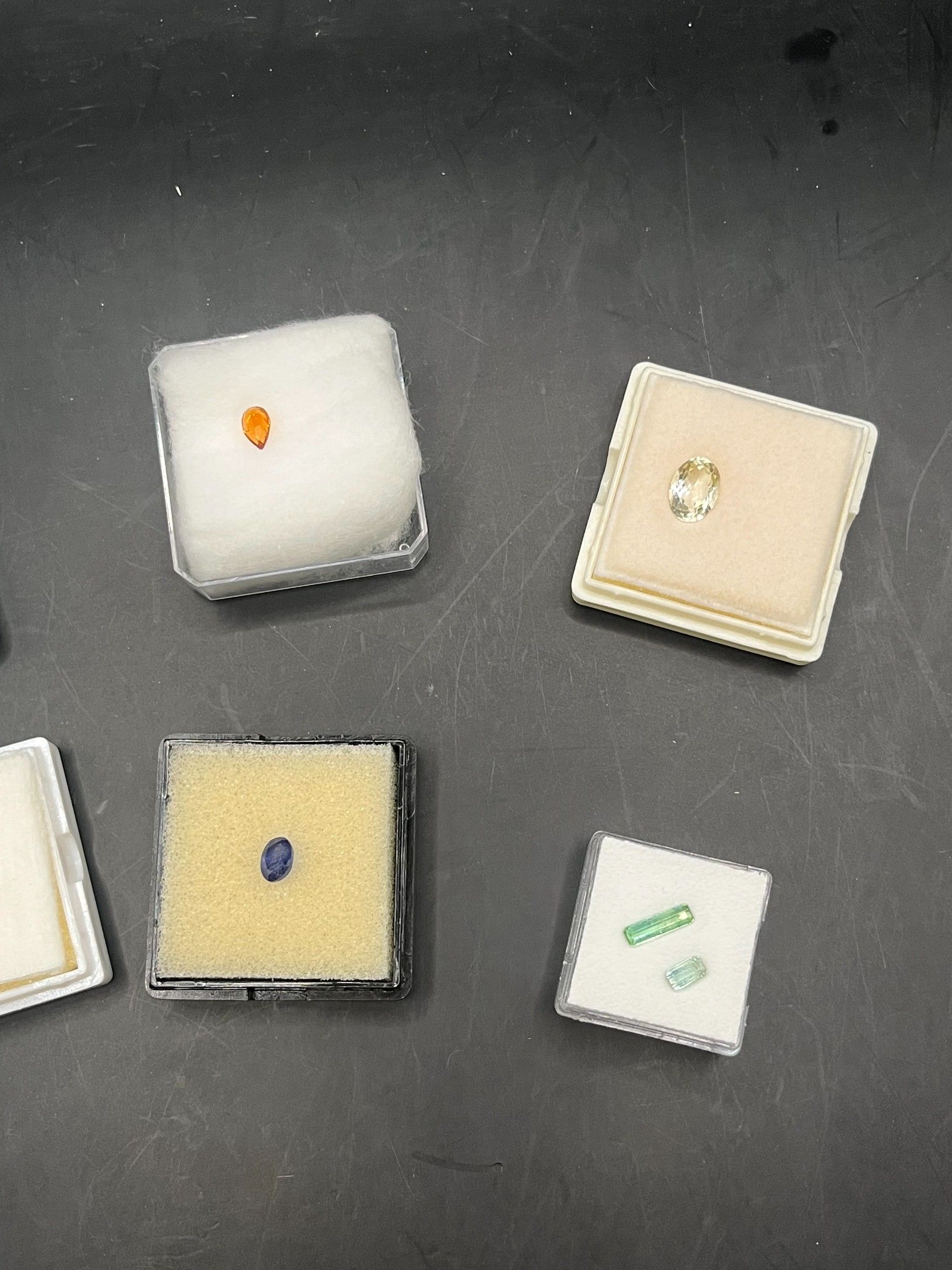 lot de pierres variées (saphir/aigue-marine/citrine/grenat/tourmaline/orthose) 7 boites provenance diverse