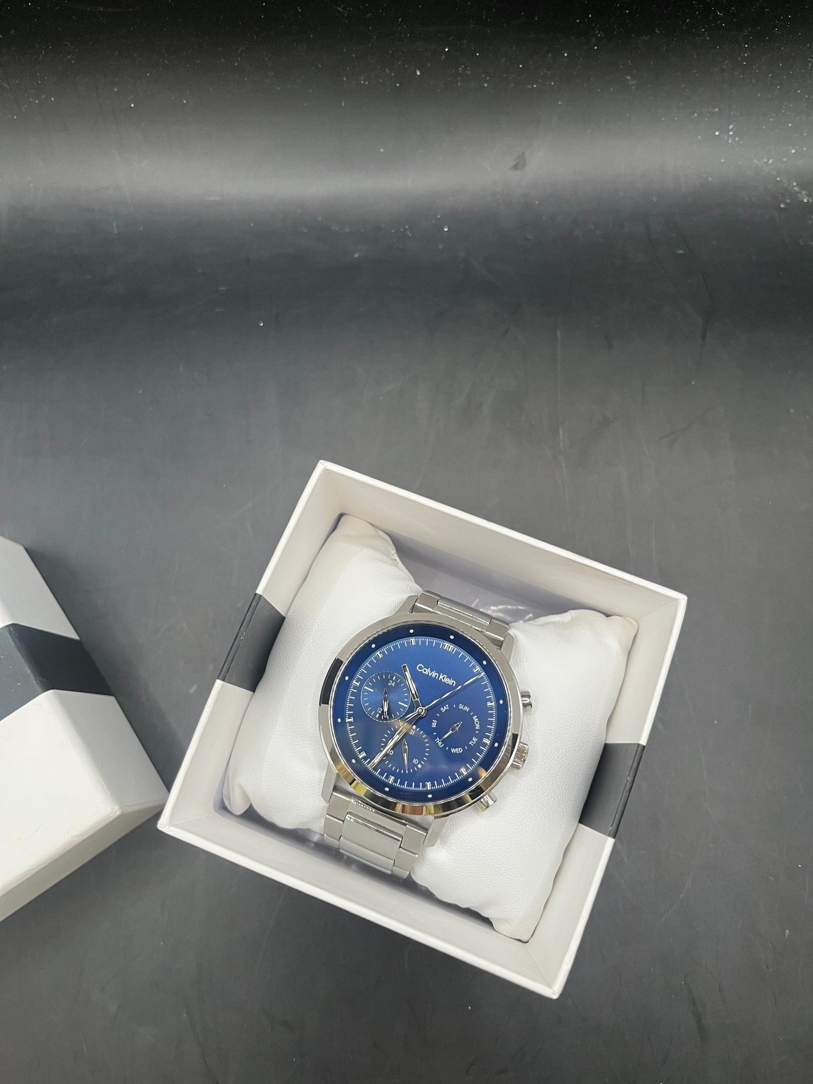 1 montre d'occasion Calvin Klein acier argent et fond bleu, …