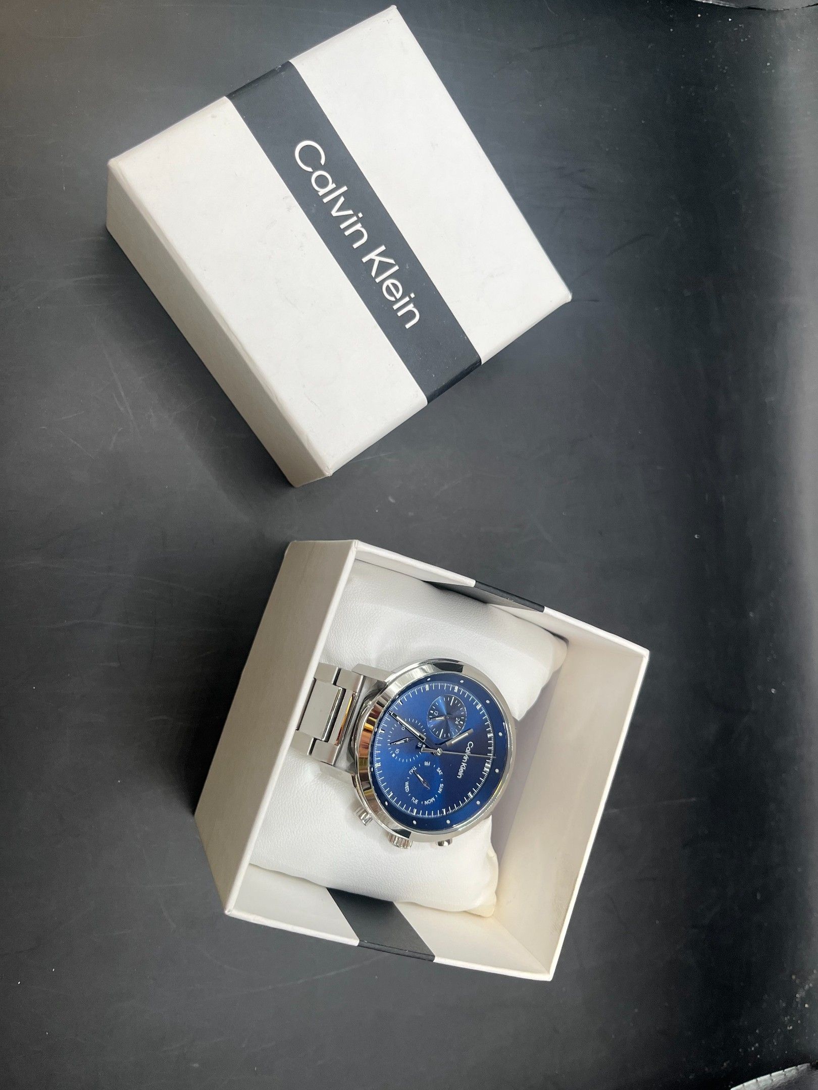 1 montre d'occasion Calvin Klein acier argent et fond bleu, fonctionnelle comprenant tout les maillons