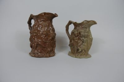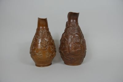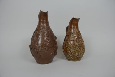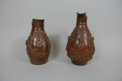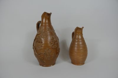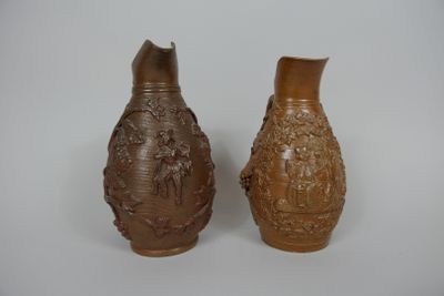 Deux pichets en grès salé brun à décor de fumeur, ou de curé…