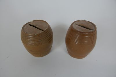Deux tire-lires en grès salé brun, en forme de tonnelets.