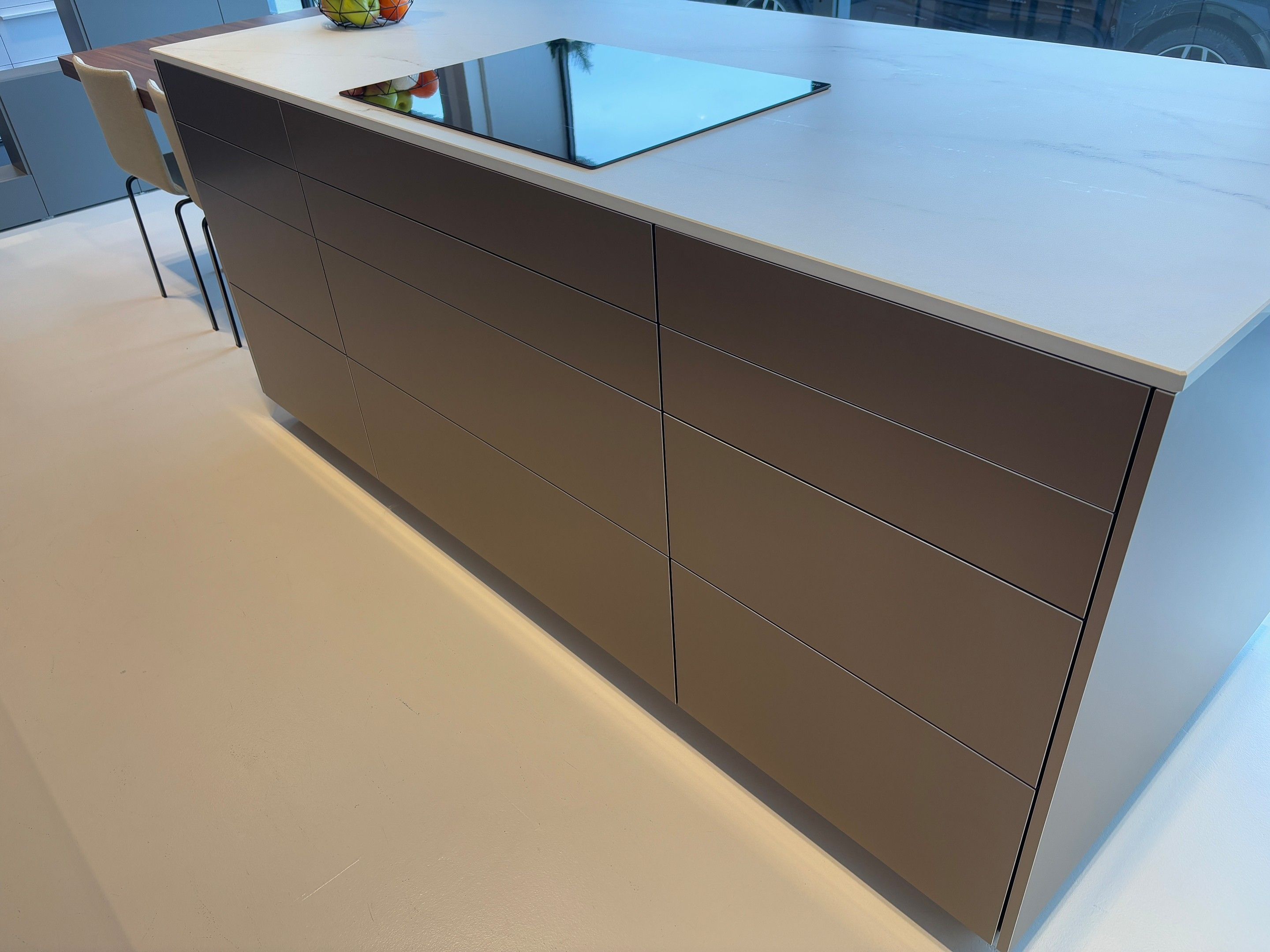 - îlot centrale avec plan de travail en DEKTON, 12 tiroirs / 4 portes (L : 2.24m / l : 1.01m) et 1 table en bois incorporée (L : 1.86m / l : 1.00m)