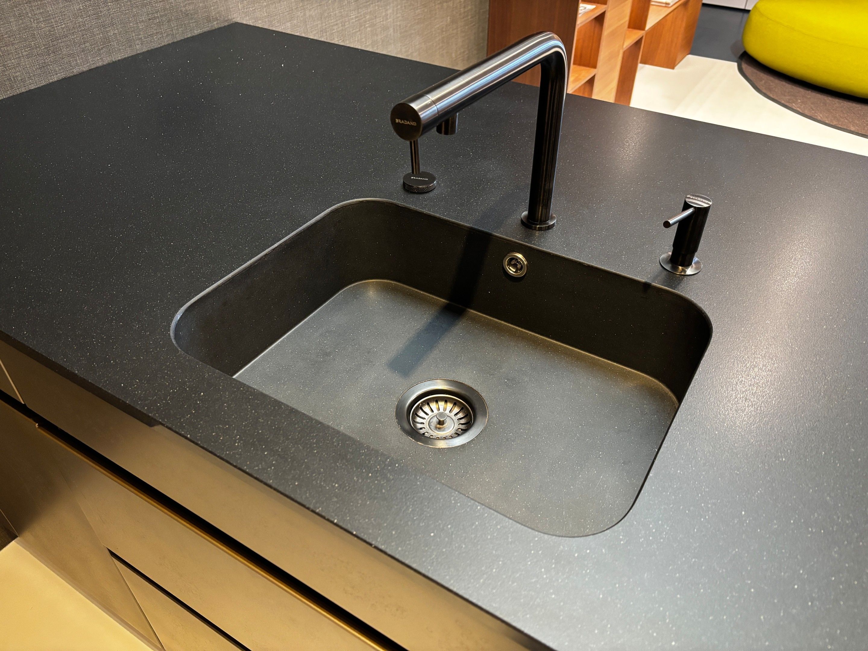 - îlot centrale en L avec plateau bois massif (L : 2.80 / l : 0.96 m) et plan de travail en pierre reconstituée NEGO TEBAS SUEDE (L : 2.06 m / l : 0.96 m) cuve évier assortie, mitigeur BRADANO avec distributeur de savon, 17 tiroirs