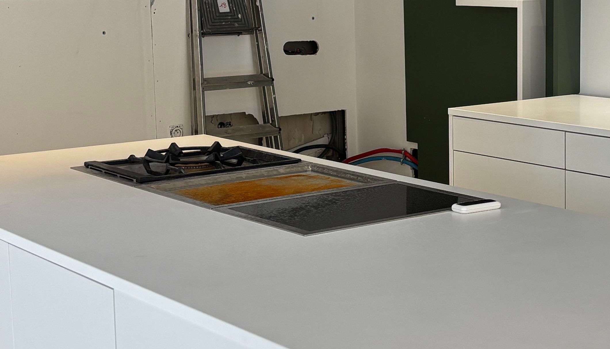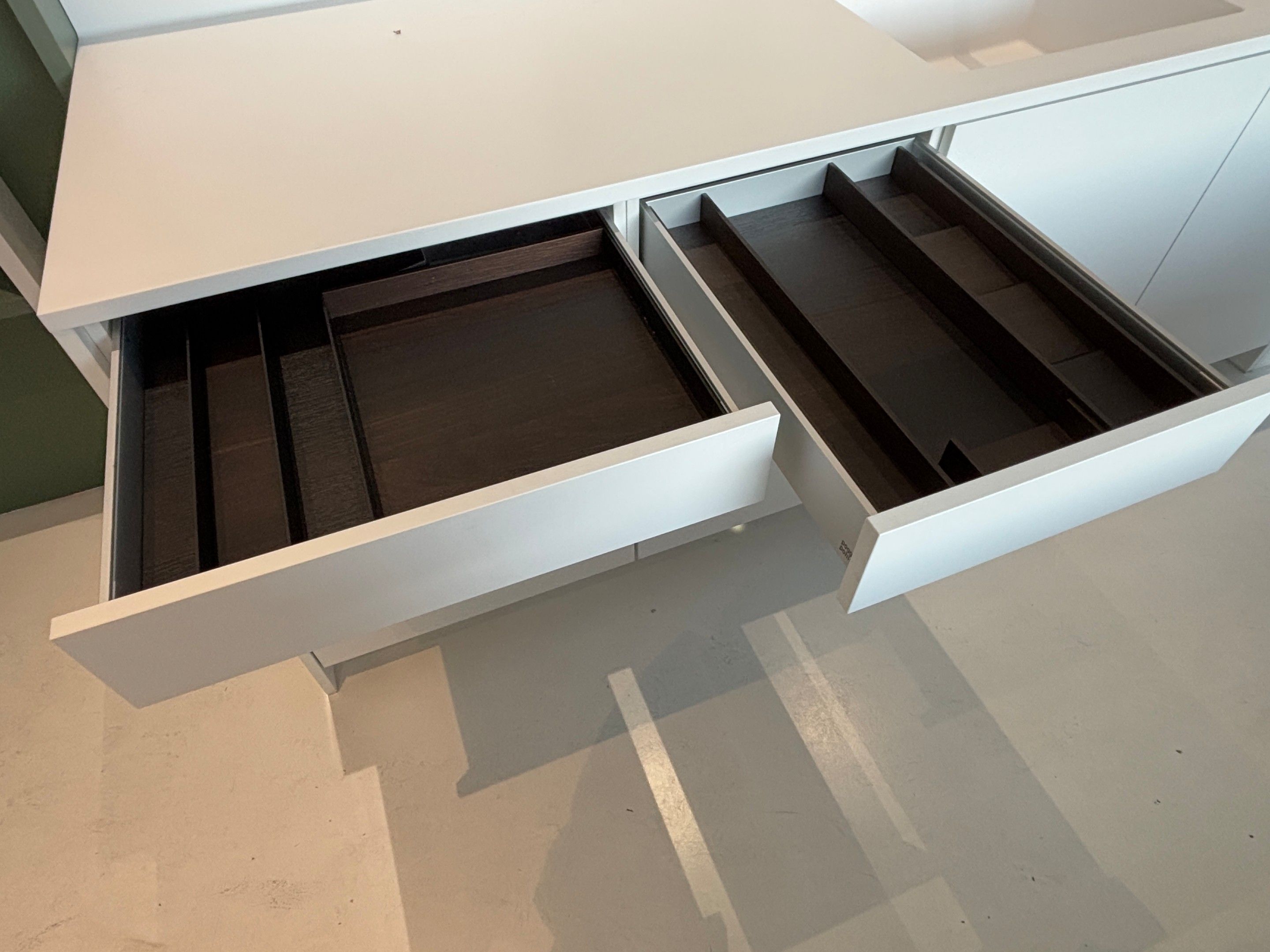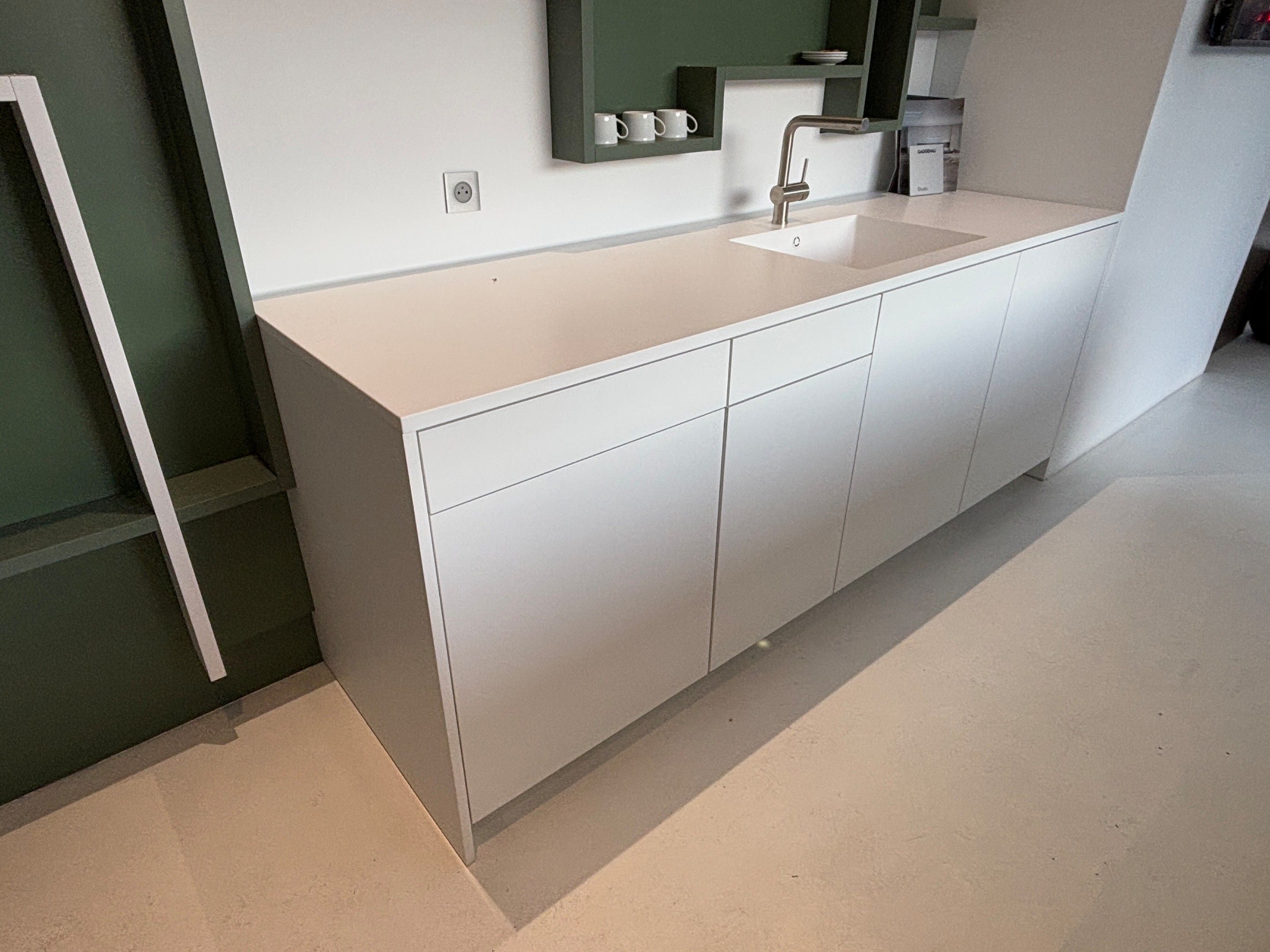 - élément bas avec plateau et évier en corian 3 portes, 2 tiroirs, 1 mitigeur inox mat (L : 2.29m / l : 0.70m)