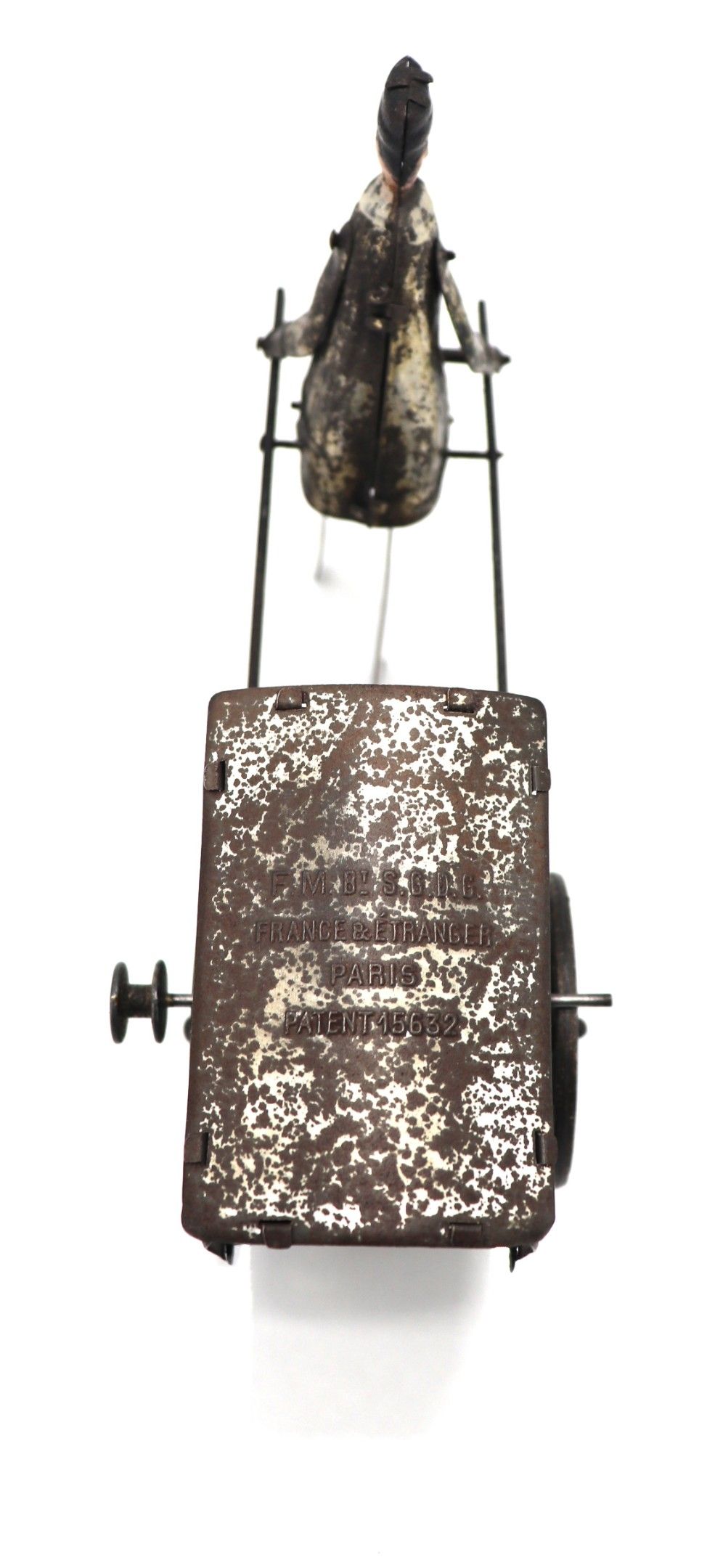 Fernand Martin, jouet mécanique Fernand Martin, "Le livreur" Jouet à partir de 1888, mécanisme à volant d'inertie, belle lithographie dont en lettres d'or sur le couvercle de la caisse de livraison "FM breveté SGDG France et étranger Fque de jouets service accéléré Paris patent 15 632". Bel état. L. 16 cm.