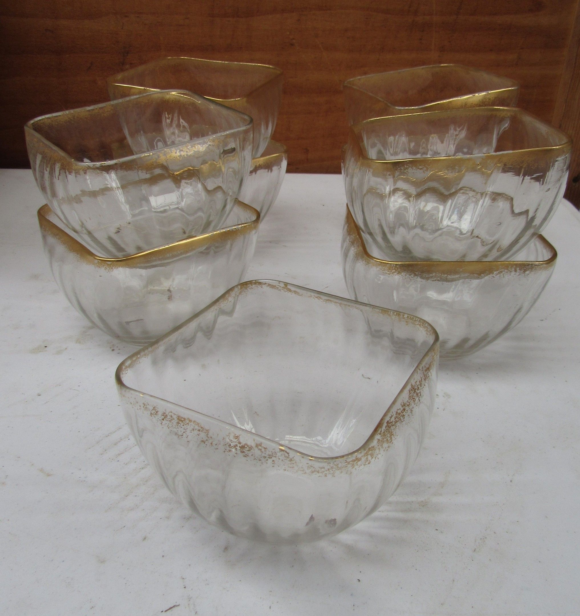 Neuf rince-doigts en cristal et bordure à rehauts d’or (éclats, usures à l’or).