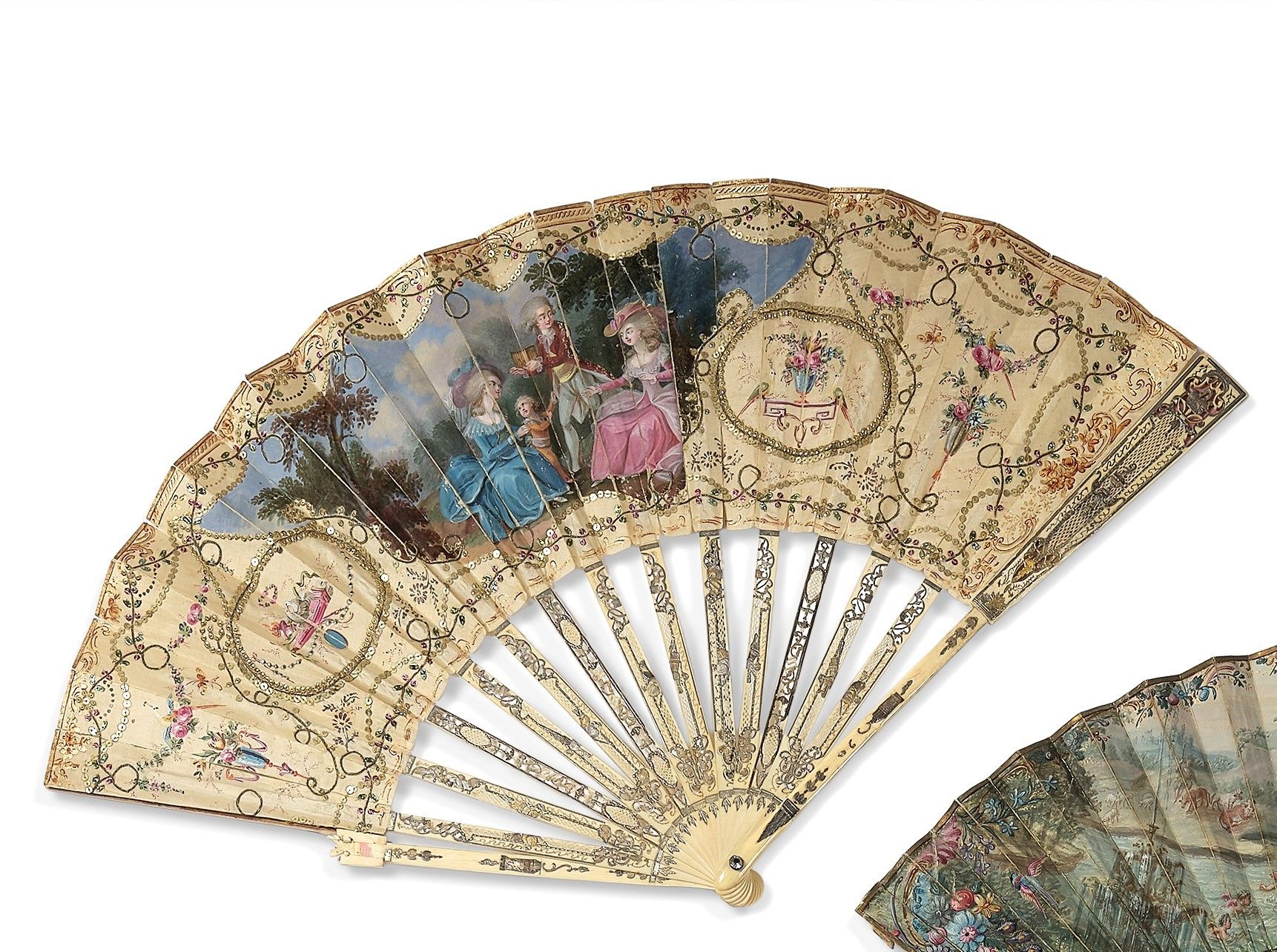 Éventail plié, la feuille en soie peinte de vases et de fleurs. Au centre, un cartel accueille une scène familiale. Un petit enfant tend les bras pour prendre l’oiseau en cage qui lui est offert. Le décor est rehaussé de paillettes de couleur et dorées. Au revers, deux cartels peints d’oiseaux encadrent un bouquet de roses et de myosotis.