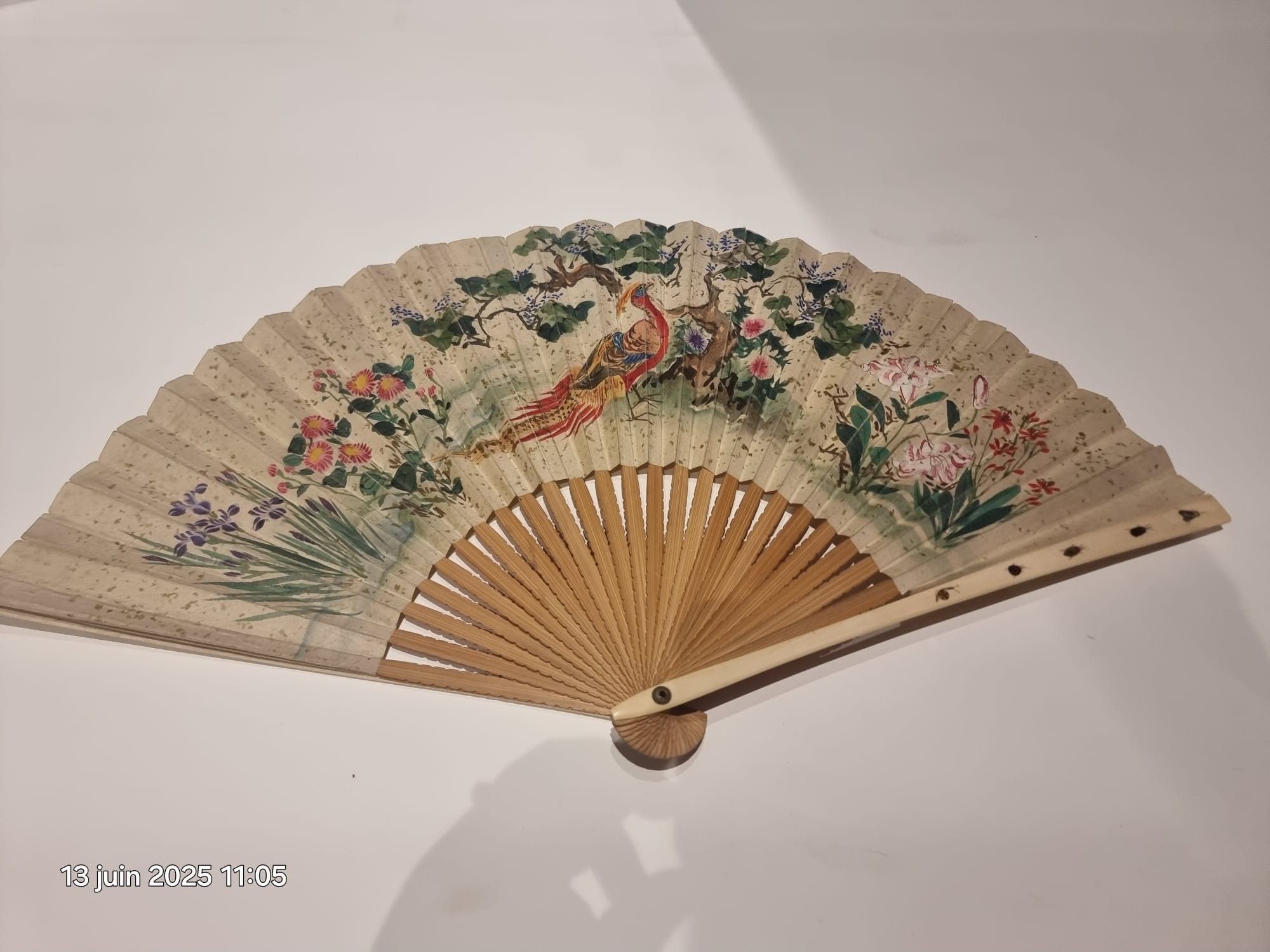 Éventail plié, la feuille double en soie peinte d’un faisan doré sous un arbre, parmi des fleurs. Au revers, dix personnages en costume traditionnel japonais.