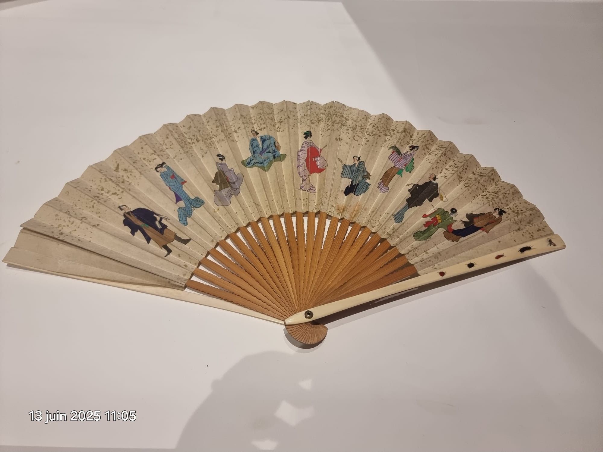 Monture en bambou, la bordure à effet dentelé. Les panaches en ivoire incrusté de cinq insectes dont le corps est enrichi de pierre dure, suivant la technique du Shibayama (taches, petites coupures).