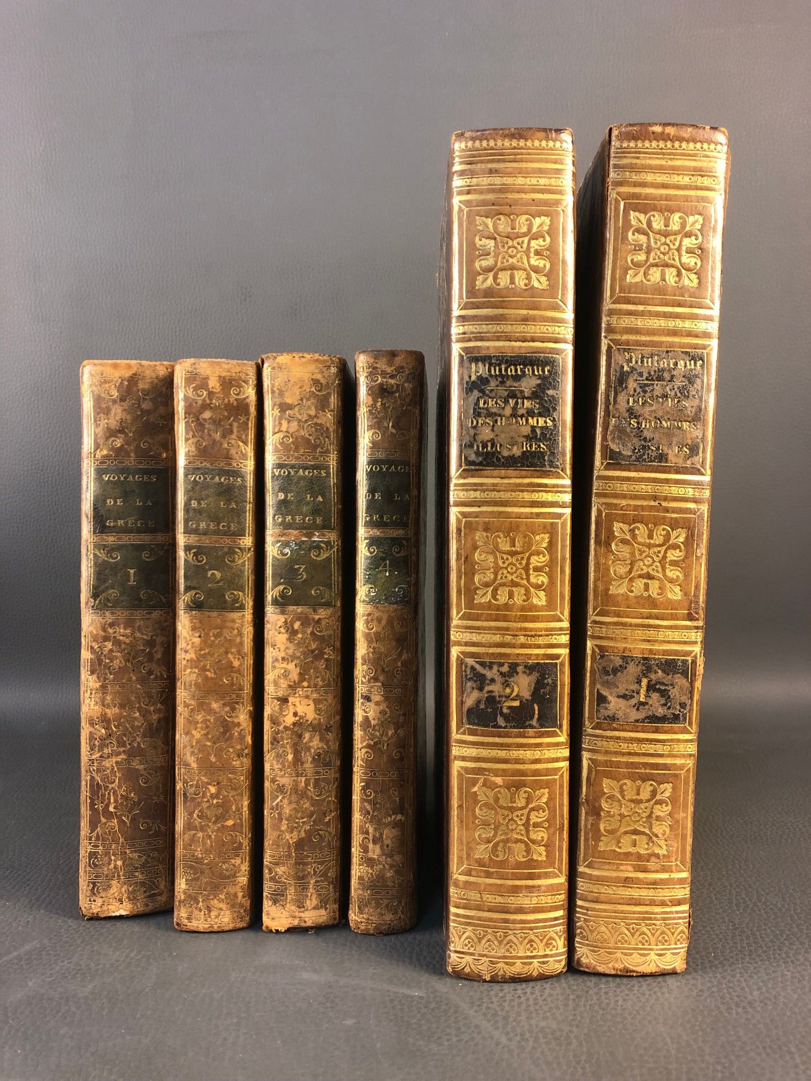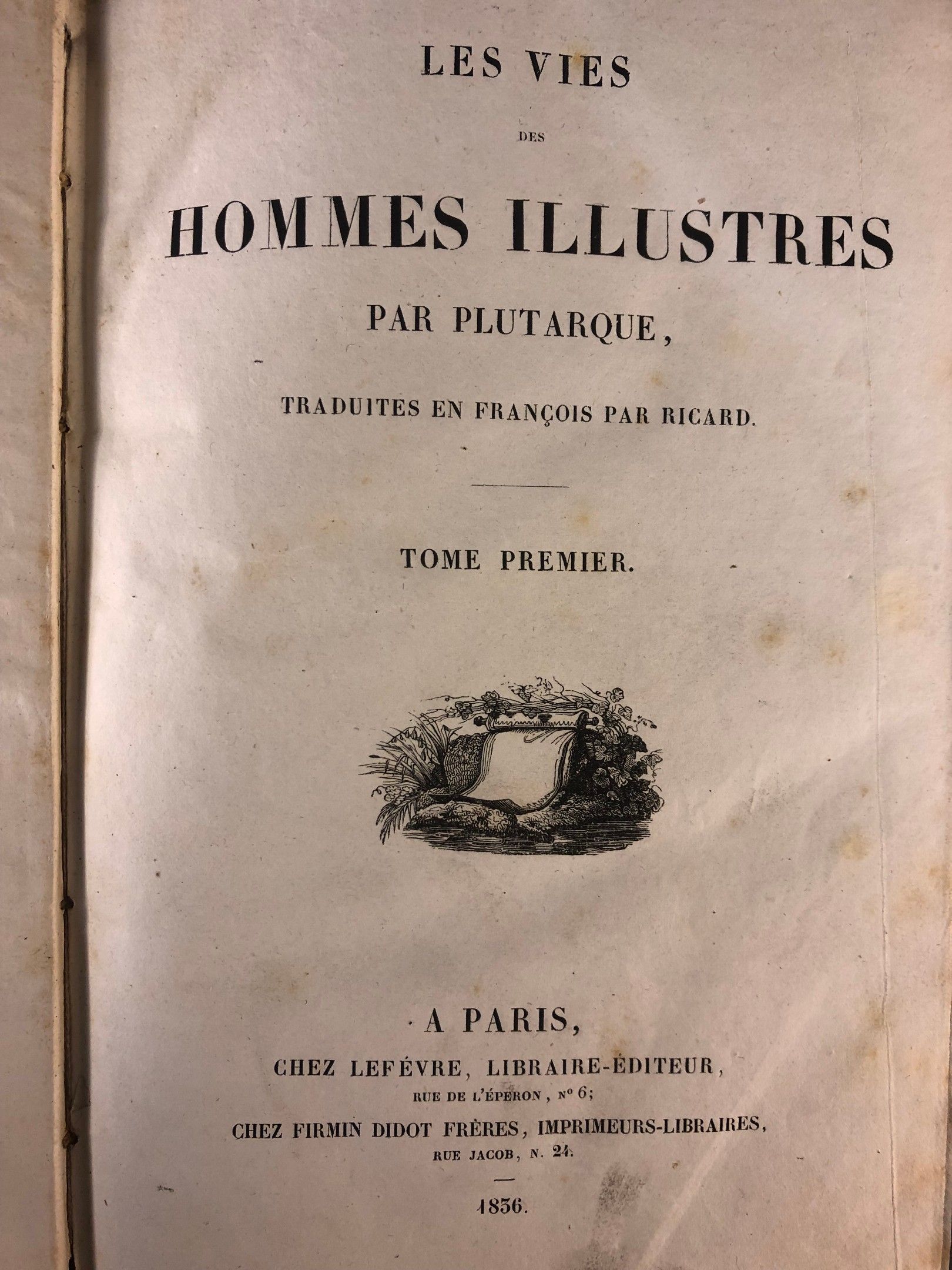 - PLUTARQUE - Les vies des hommes illustres, traduites en Français par Ricard - Paris, Lefèvre, 1836 - 2 vol. gd in 8°, demi-veau brun, dos lisse orné, dos tourné, tr. marbrées (des défauts dt piqures et mouillures, trous de vers à la rel.) - Texte sur 2 colonnes