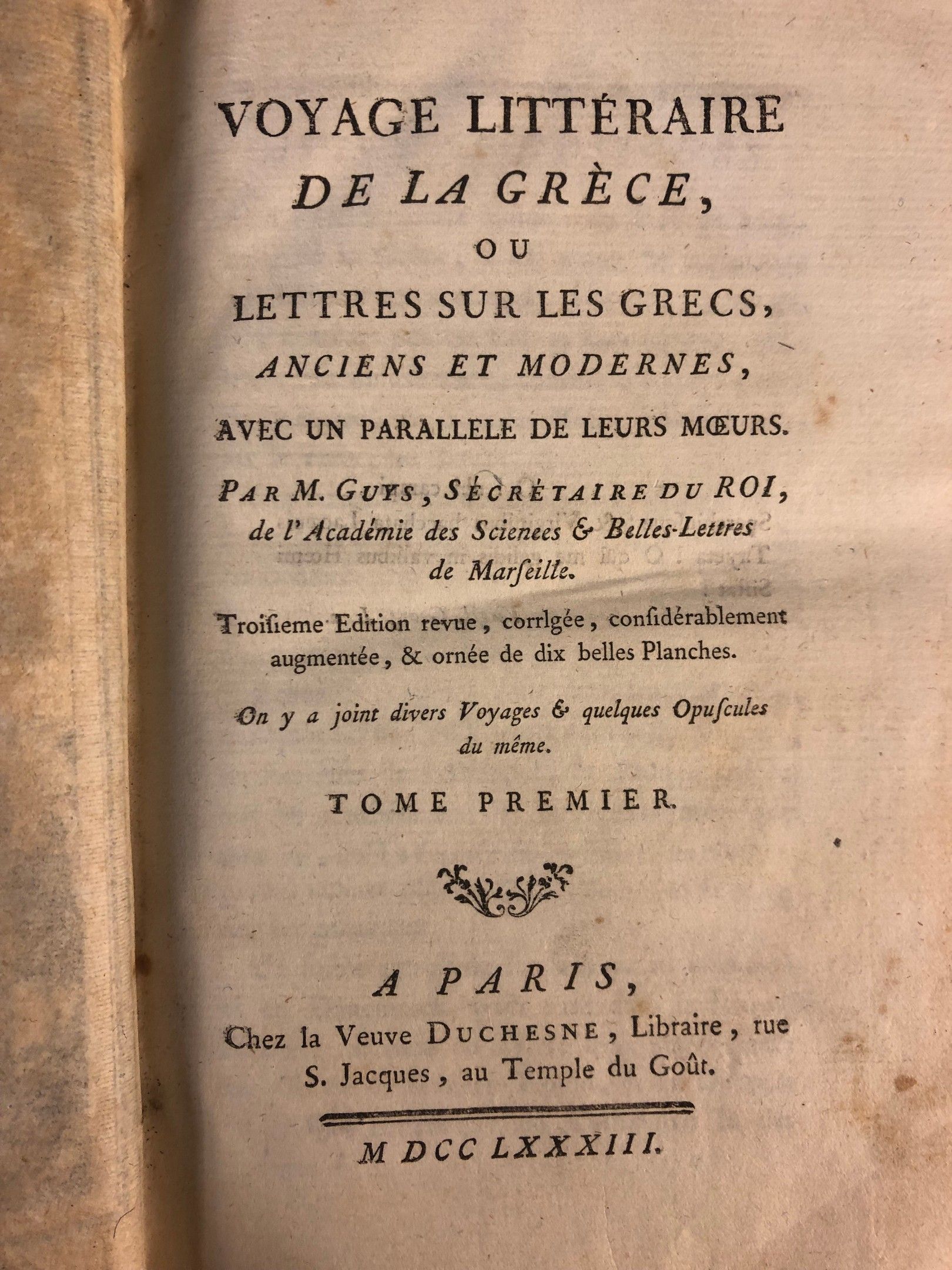 GUYS (Pierre-Augustin) - Voyage littéraire de la Grèce, ou Lettres sur les Grecs, anciens et modernes, avec un parallèle de leurs moeurs - Paris, veuve Duchesne, 1783 - 4 vol. in-8°, veau porphyre, dos lisses ornés, p. de titre et de tomaison noires, encadrement d'un triple filet doré sur les plats, tr. marbrées (défauts à la reliure dt frottis, coiffes) (manque la p. de garde fantaisie) (piqures) Frontispice h.-t. de J. Hoüel gravé en taille-douce par L. Halbou, et 9 fig. h.-t. dont 4 repl. gravées en taille-douce d'après Hoüel, David et Favray, (2) ff., viij-527 pp.; (2) ff., 382 pp.; (2) ff., 373 pp.; (2) ff., 240 pp.