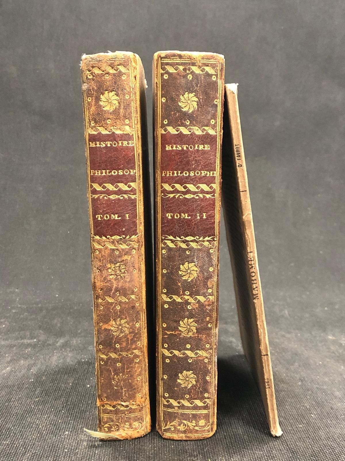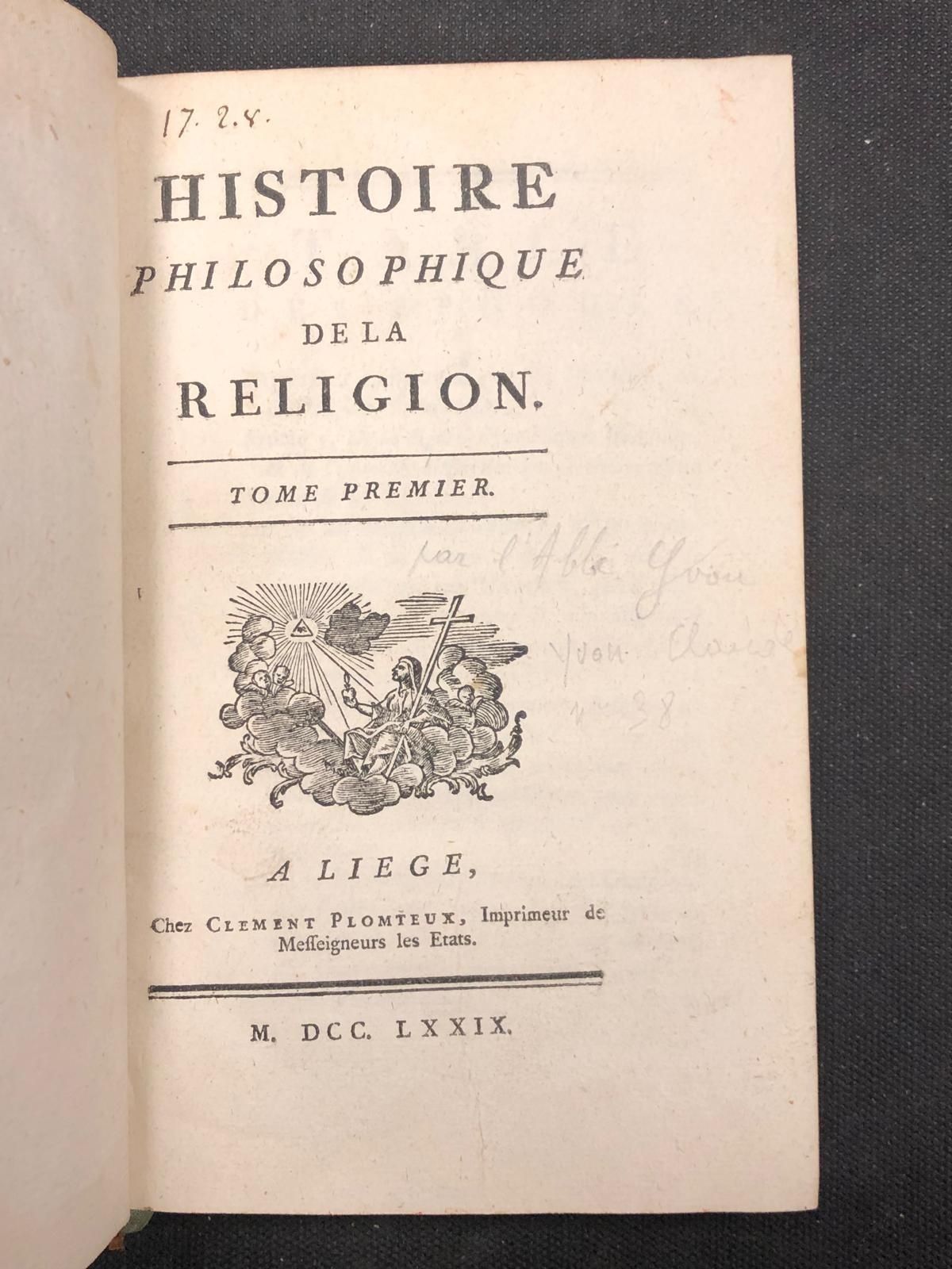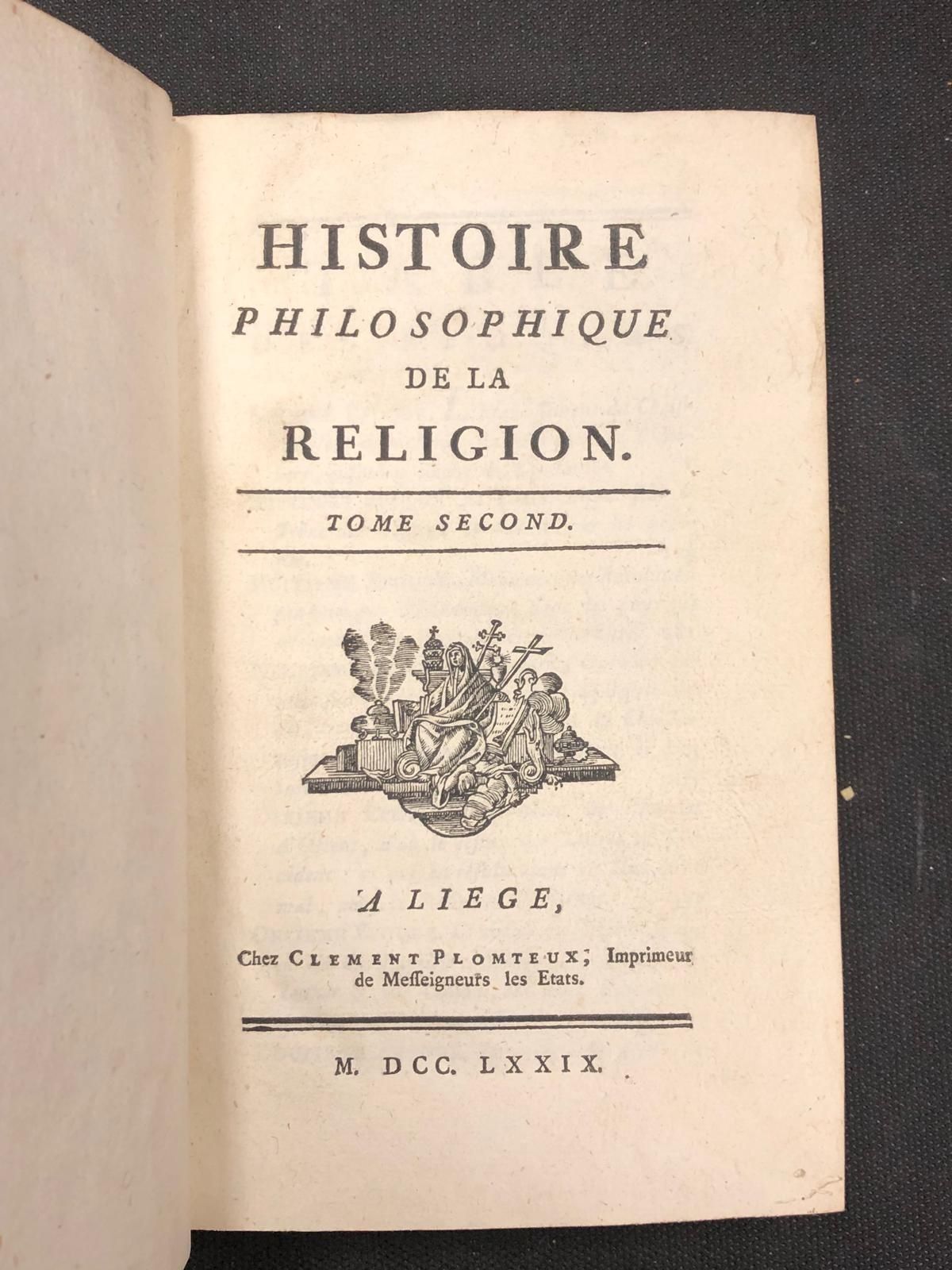 [YVON (Claude)] Histoire philosophique de la religion - Liege, Clement, Plomteux, 1779 - 2 vol. in 8°, [1] f. blc. [2] 408 pp (dernier feuillet pouss.), [1] f. blc. [2] 520 pp, basane, dos lisse orné, p. de titre et de tomaison maroquin rouge, tr. pouchetées rouges (défauts dt frottis, au t2 mors sup. fragile, trous de vers au t1, coiffes, ...)