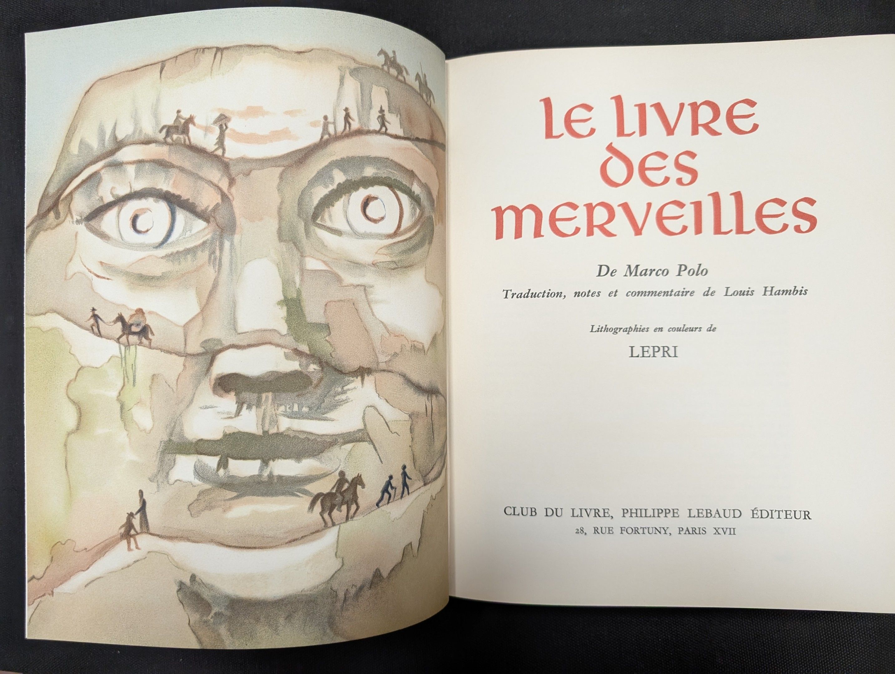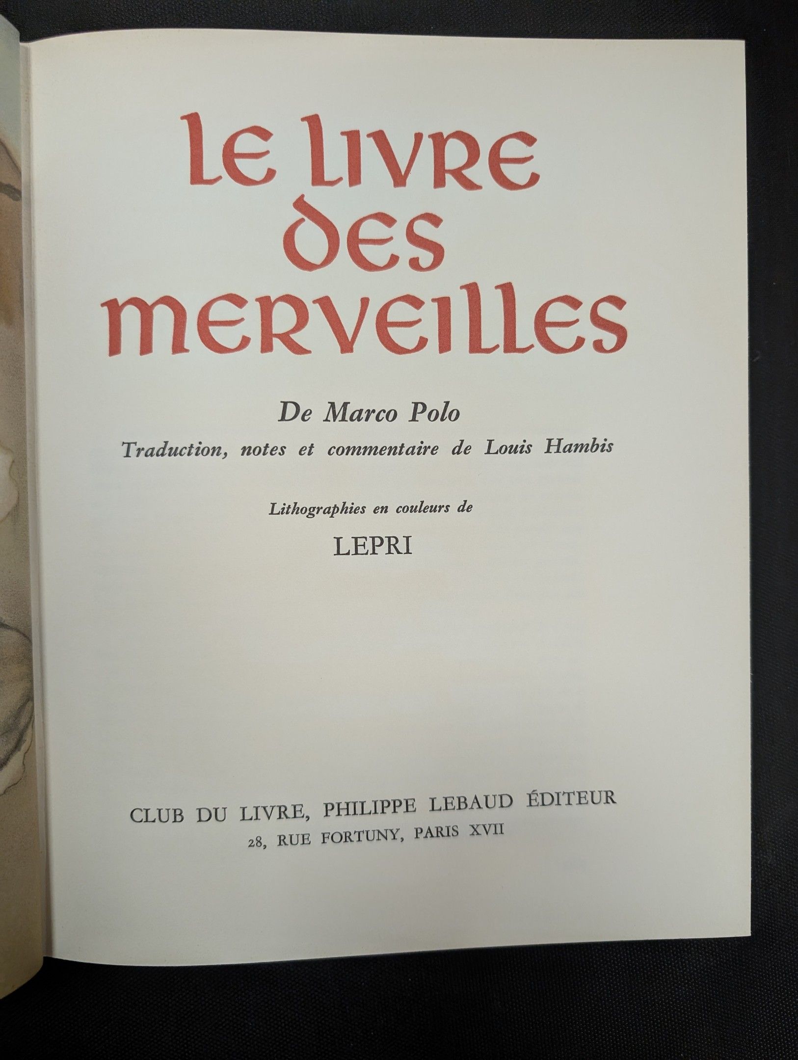 - POLO (Marco) - Traduction, notes et commentaires de Louis Hambis - Lithographies en couleur de Lepri - Paris, Club du Livre, Lebaud, 1977 - In 4°, basane chocolat, dos à nerfs, plats estampés, tête dorée, étui - Un des exemplaires numérotés sur pur fil Dame blanche.