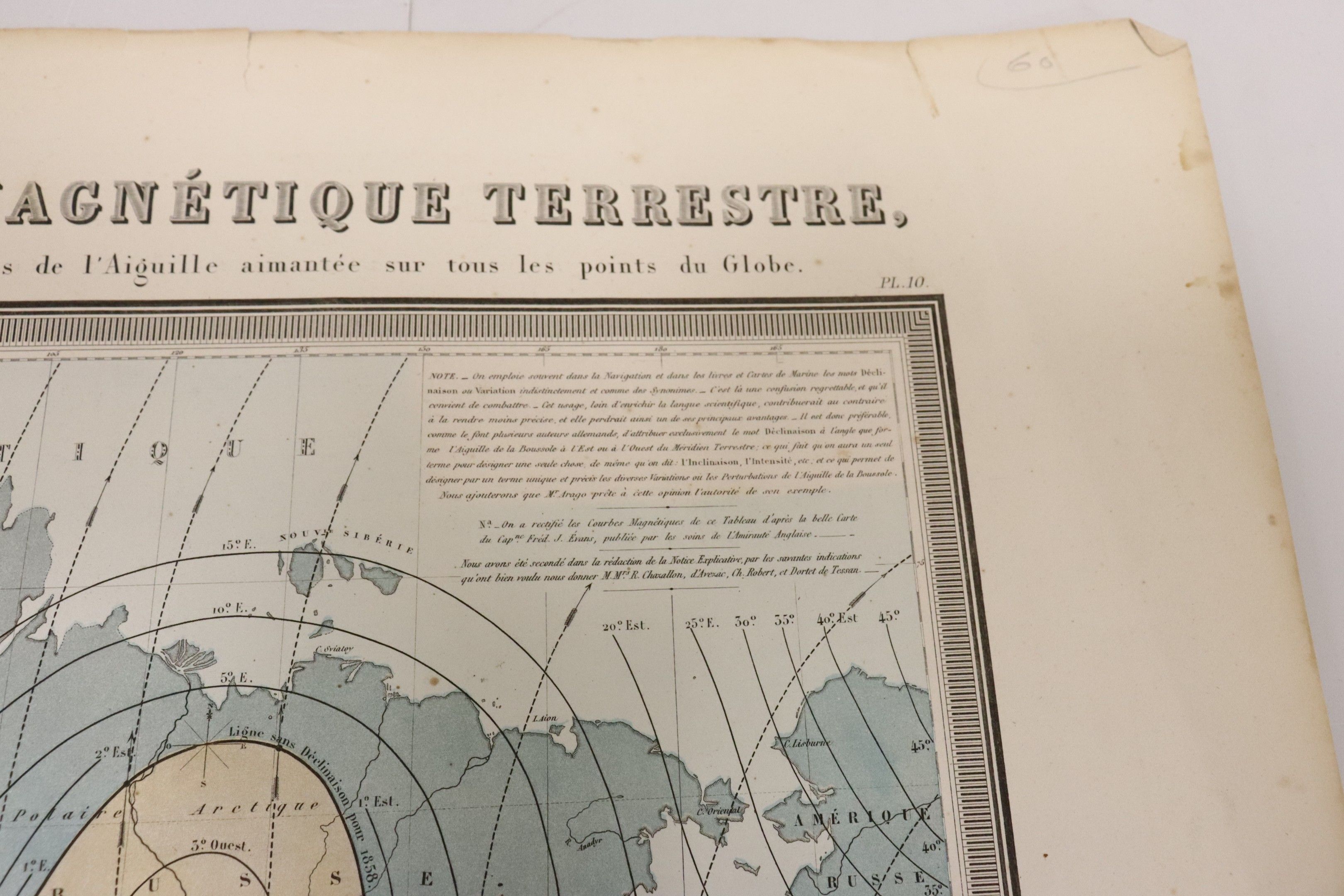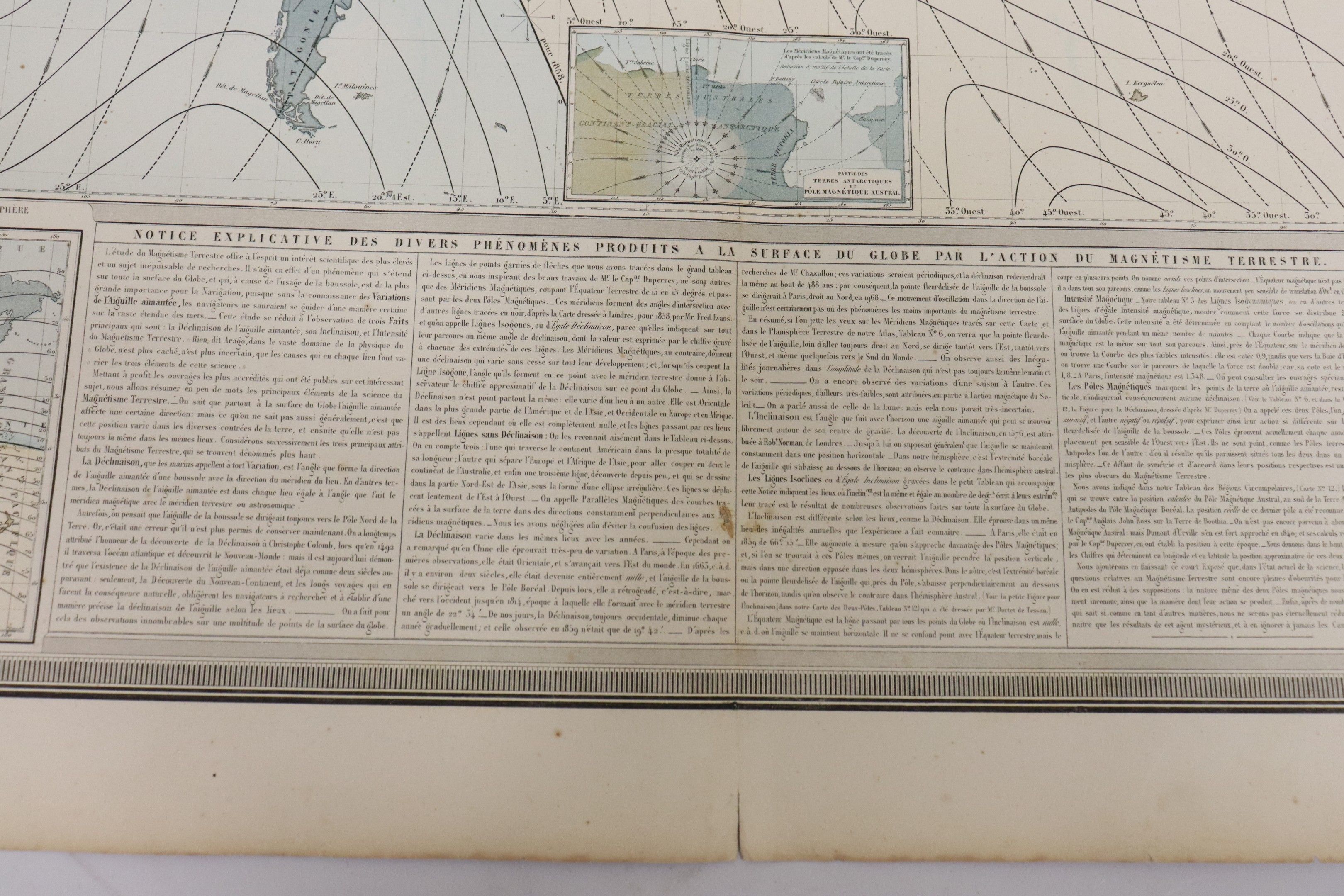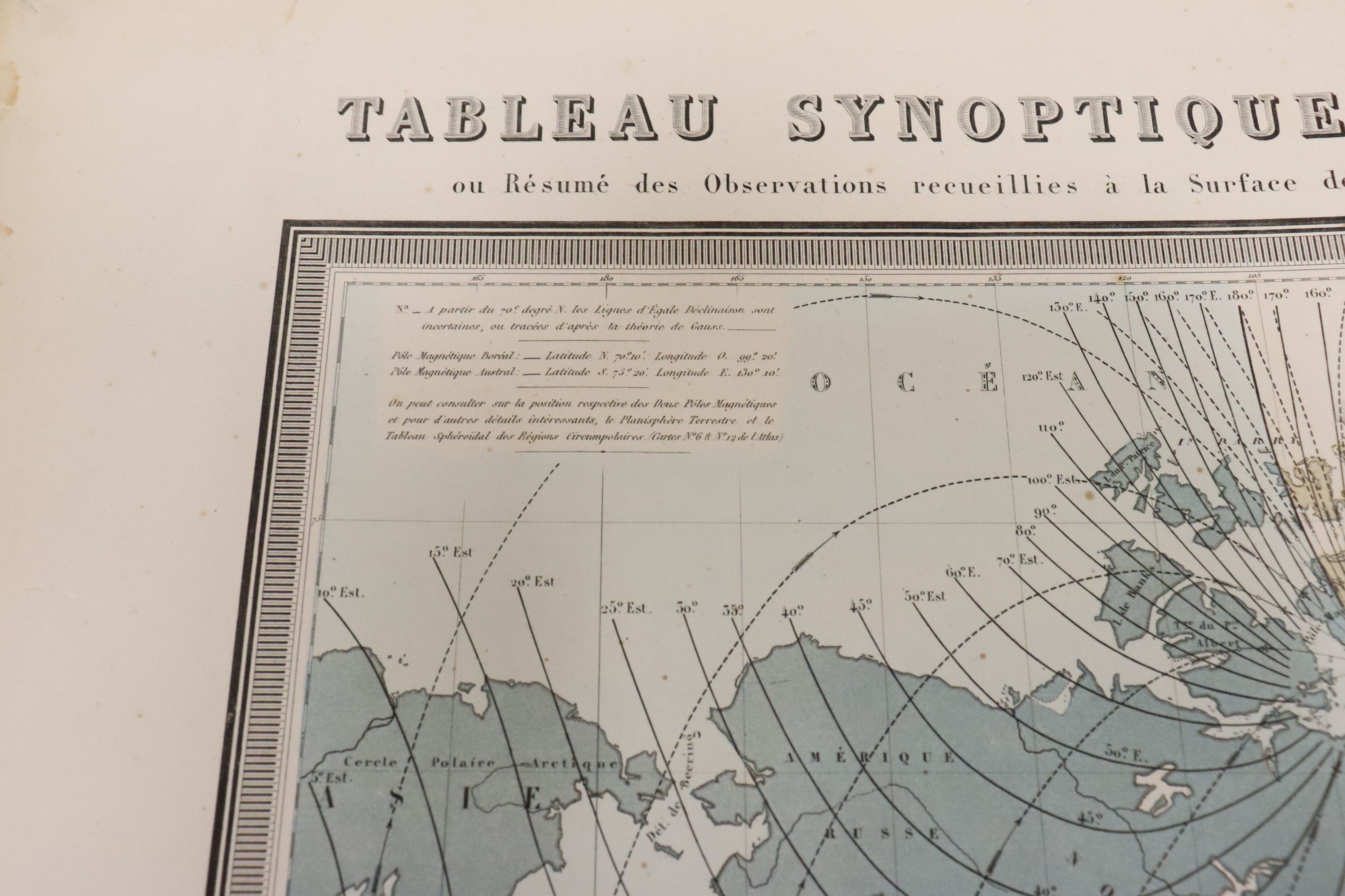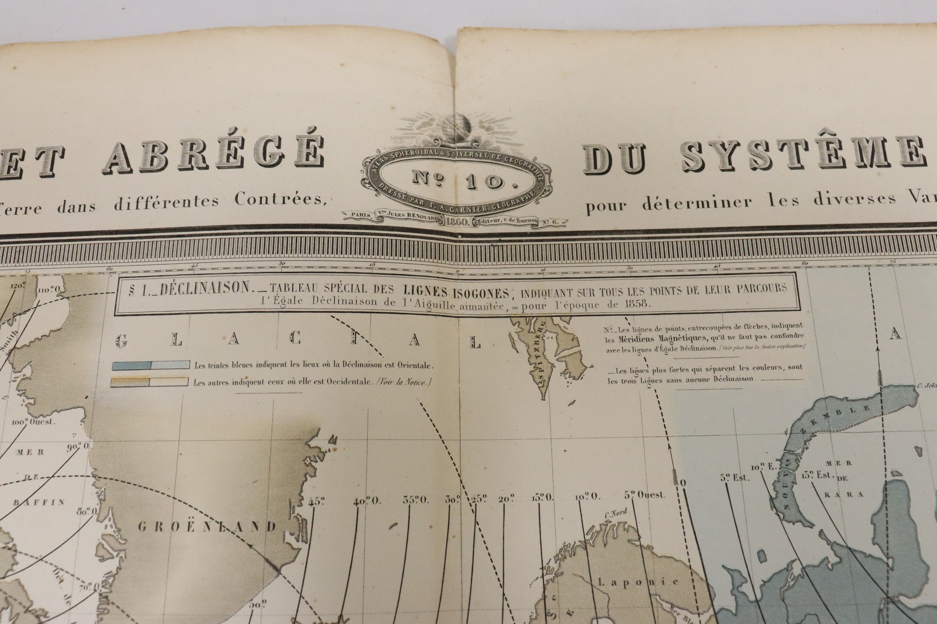 Tableau Synoptique Et Abrege Du Systeme Magnetique Terrestre ou résumé des observations recueillies à la surface de la terre dans différentes contrées pour déterminer les diverses variations de l'Aiguille aimantée sur tous les points du globe - Tableau spécial des lignes isogones, indiquant sur tous les points de leur parcours l'égale déclinaison de l'aiguille aimantée pour l'époque 1858 - 61 x 85 cm en couleurs petits défauts marginales