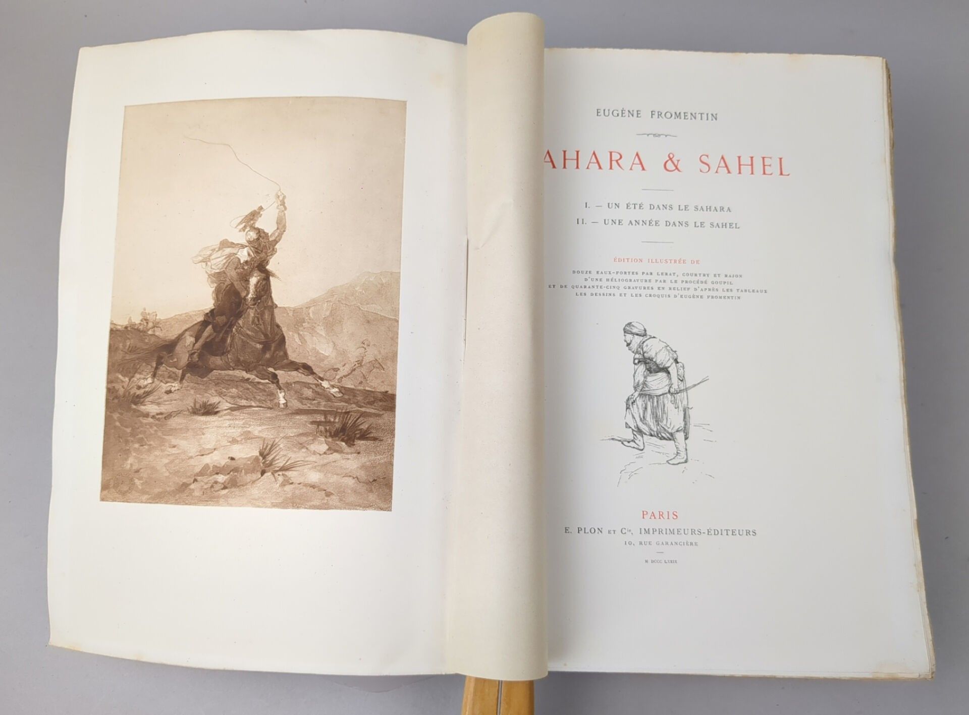 [Afrique] FROMENTIN (Eugène). Sahara Sahel. I. - Un été dans le Sahara. II. - Une année dans le Sahel. Paris, E. Plon et Cie, 1879. Un volume in-4 broché. (3) ff., XIV, 398 pp., (1) f. Rousseurs éparses.