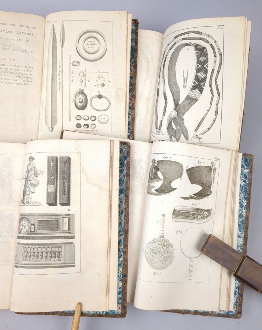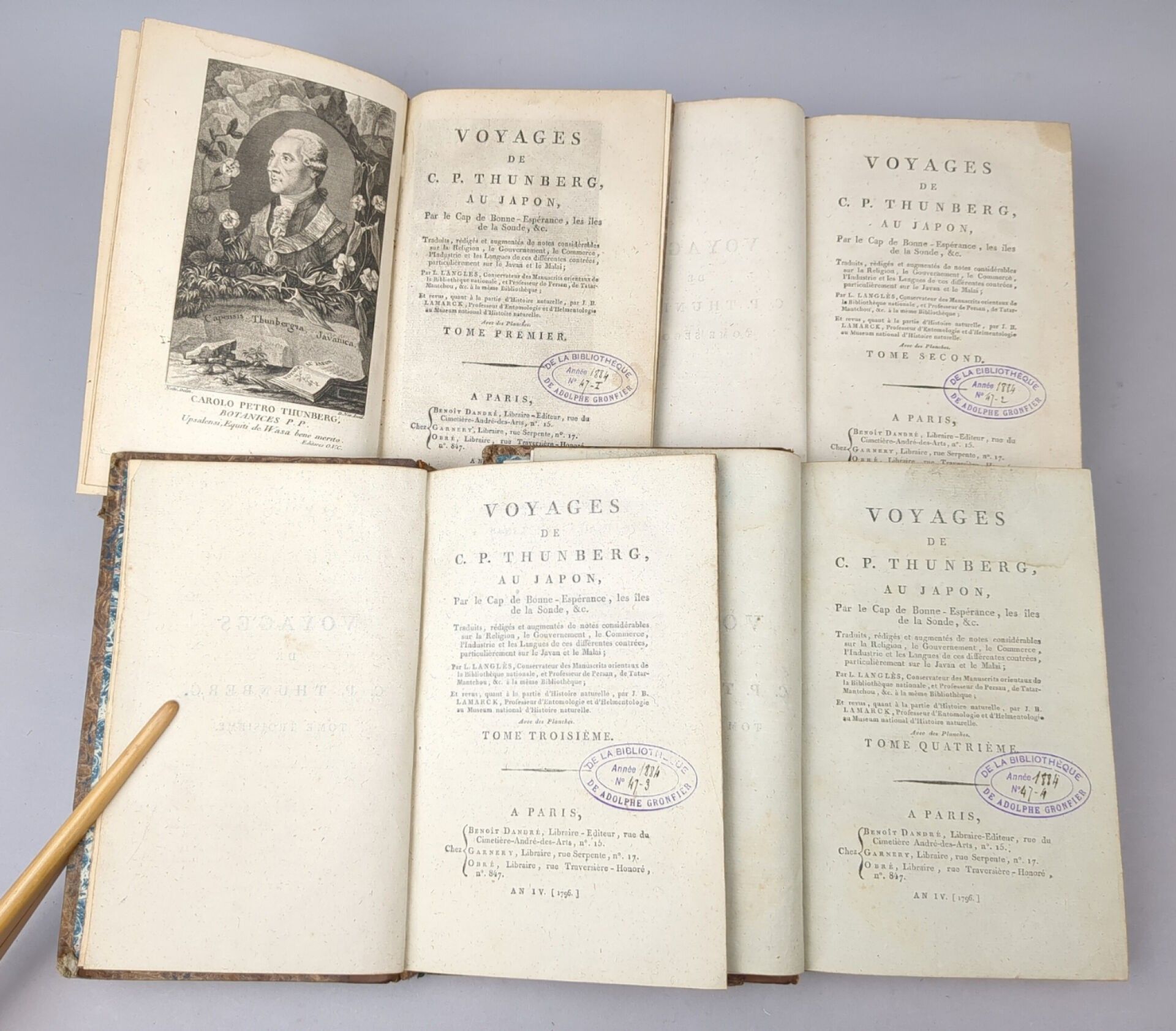 THUNBERG (Carl Peter). Voyages au Japon, par le Cap de Bonne-Espérance, les îles de la Sonde, etc., traduits, rédigés et augmentés de notes considérables sur la religion, le gouvernement, le commerce, l'industrie et les langues de ces différentes contrées, particulièrement sur le Javan et le Malai, par L. Langlès, et revus, quant à la partie d'histoire naturelle, par J.-B. Lamarck. Paris, Benoît Dandré, Garnery et Obré, an IV (1796). 4 volumes in-8, demi-veau de la première moitié du XIXe siècle, dos lisse estampé et orné (reliure signée Gaugain). (2) ff., LXIV, 417 pp.; VIII, (1) f., 430 pp.; VIII, 445 pp.; (2) ff., IX à XII, 462 pp., V à VIII. Plats frottés, coins émoussés, un cahier pratiquement détaché, mouillures en marge haute en début du tome I, mouillures angulaires aux planches du t. III, mouillures en marge haute des premières pages du t.IV.