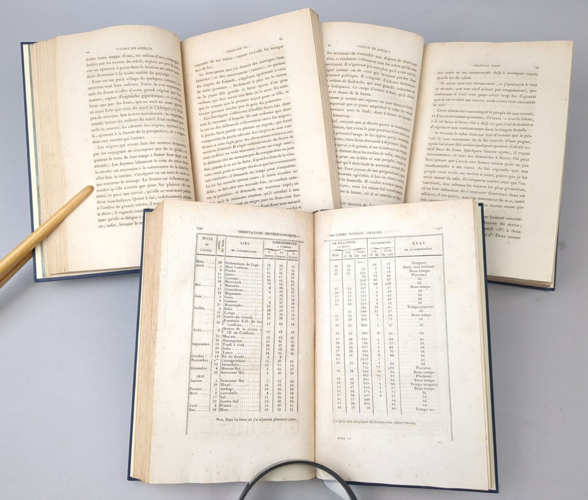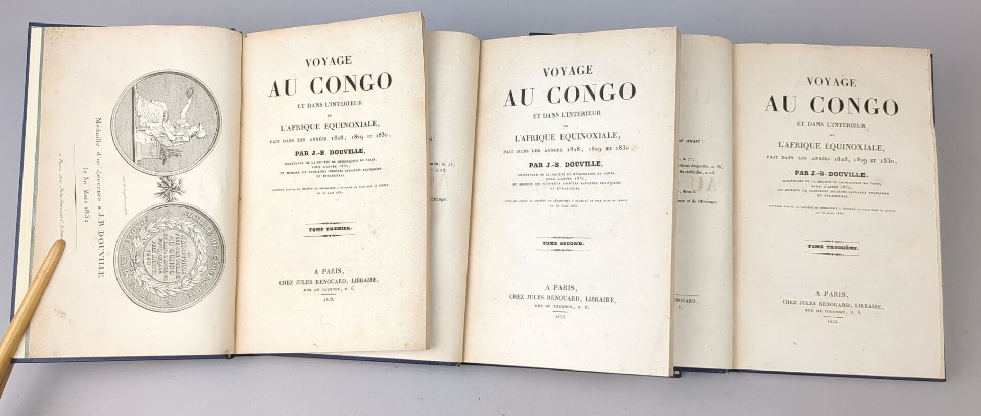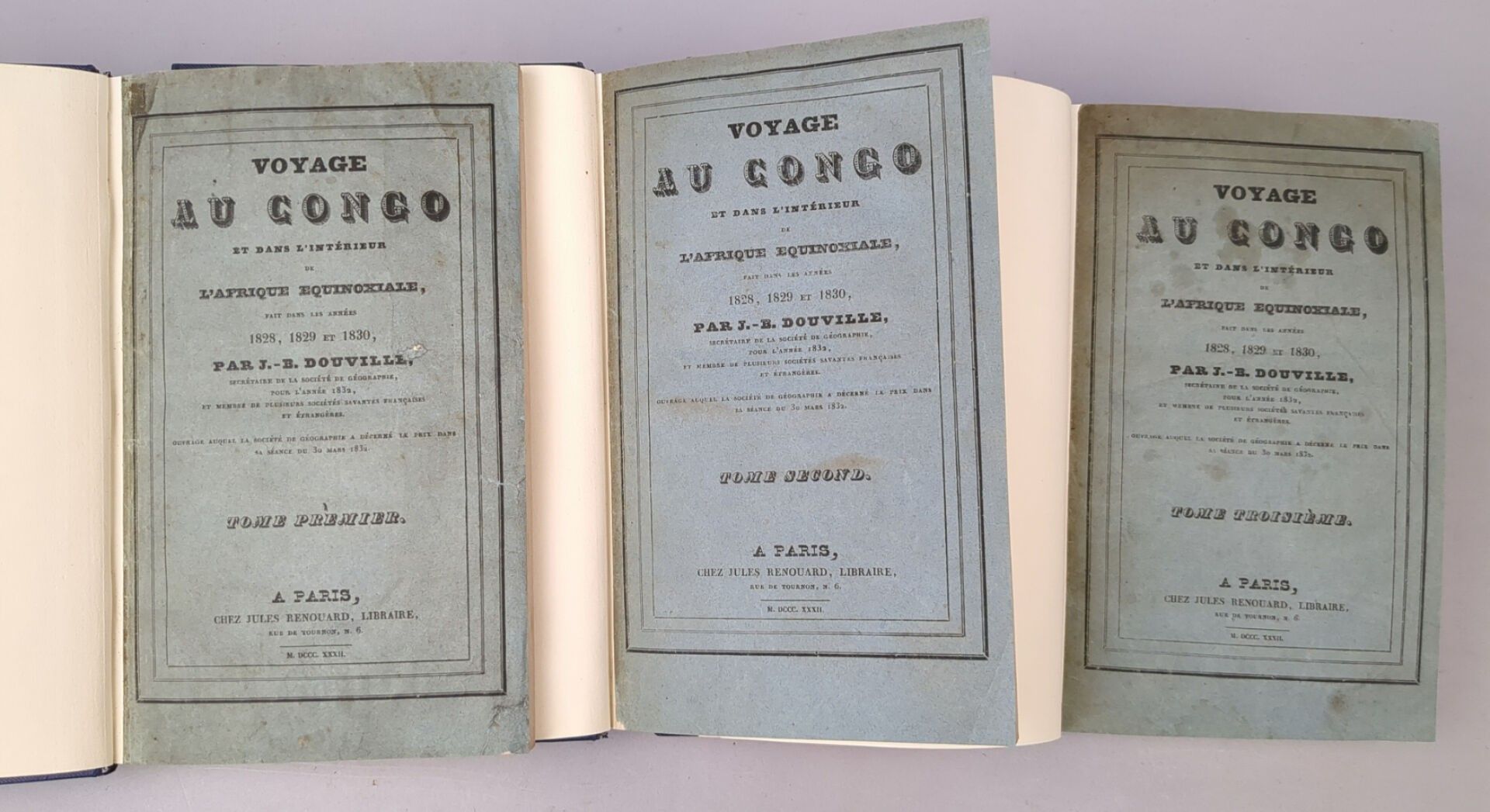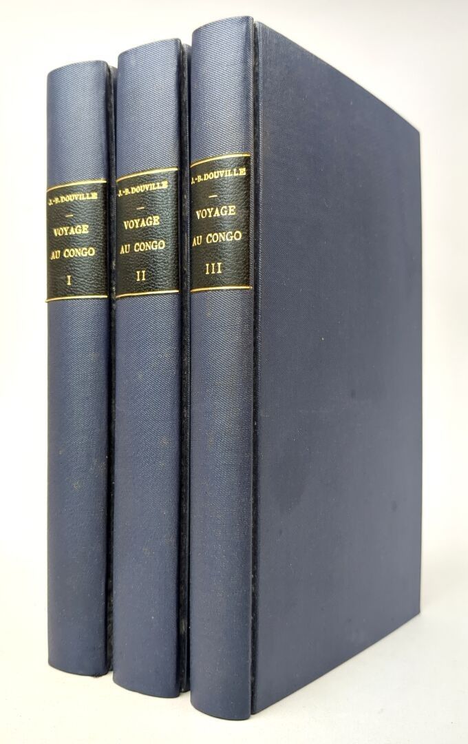 [Afrique] DOUVILLE (Jean-Baptiste). Voyage au Congo et dans l'intérieur de l'Afrique équinoxiale, fait dans les années 1828, 1829 et 1830. Paris, Renouard, 1832. 3 volumes in-8, pleine toile moderne, pièces de titre en cuir, couv. conservée (Ateliers Laurenchet). (2) ff., XXXI, 328 pp.; (2) ff., 380 pp.; (16) pp. de cat. éditeur, (2) ff., 272 pp. Mouillures en fin de tome II et au début du tome III, rousseurs éparses.