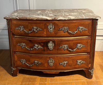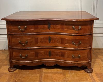 Commode en arbalète en noyer mouluré ouvrant à trois tiroirs…