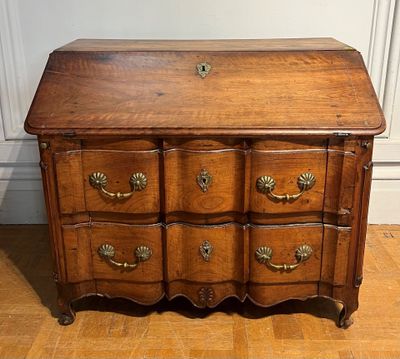 *Scriban en arbalète en noyer mouluré ouvrant à deux tiroirs…