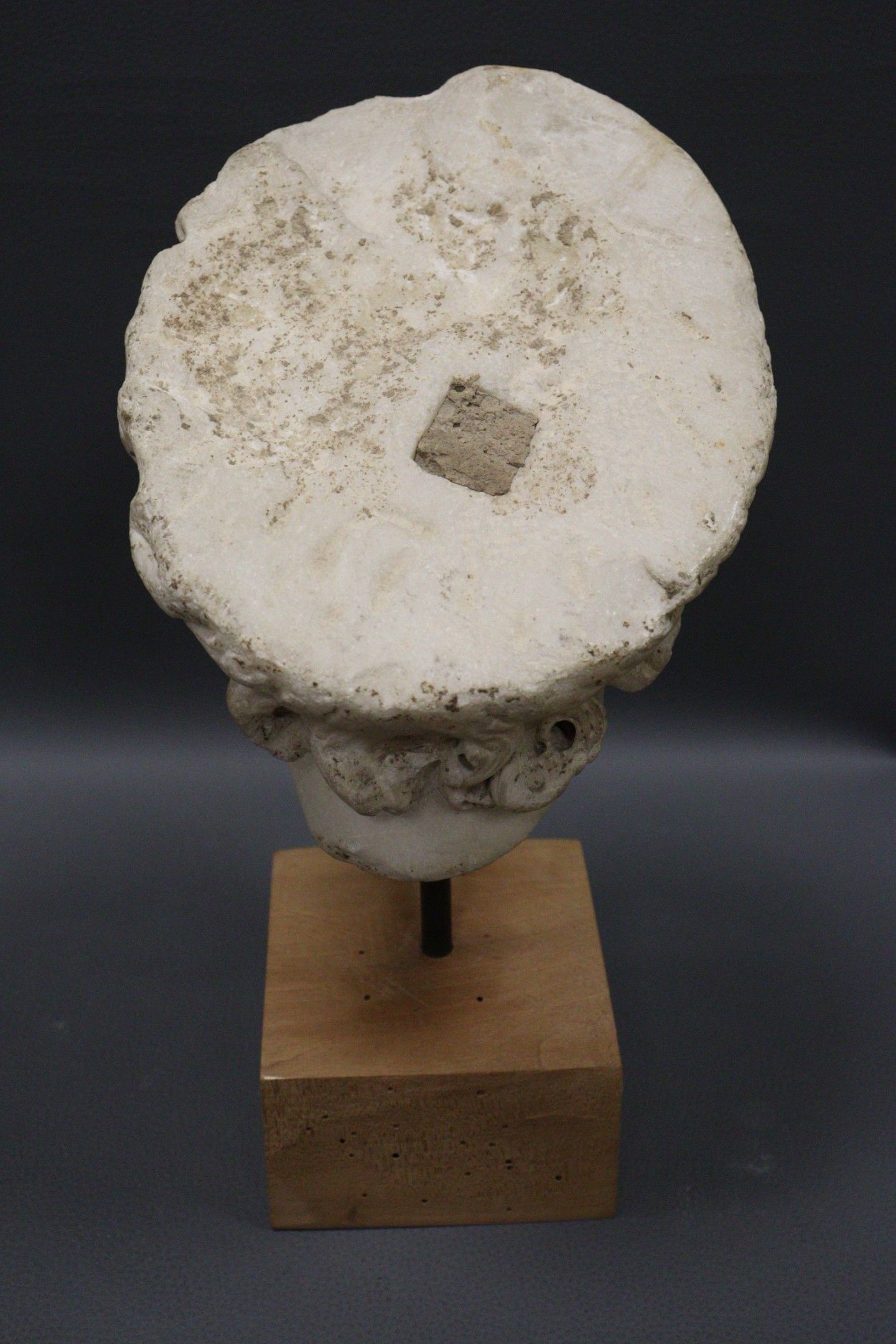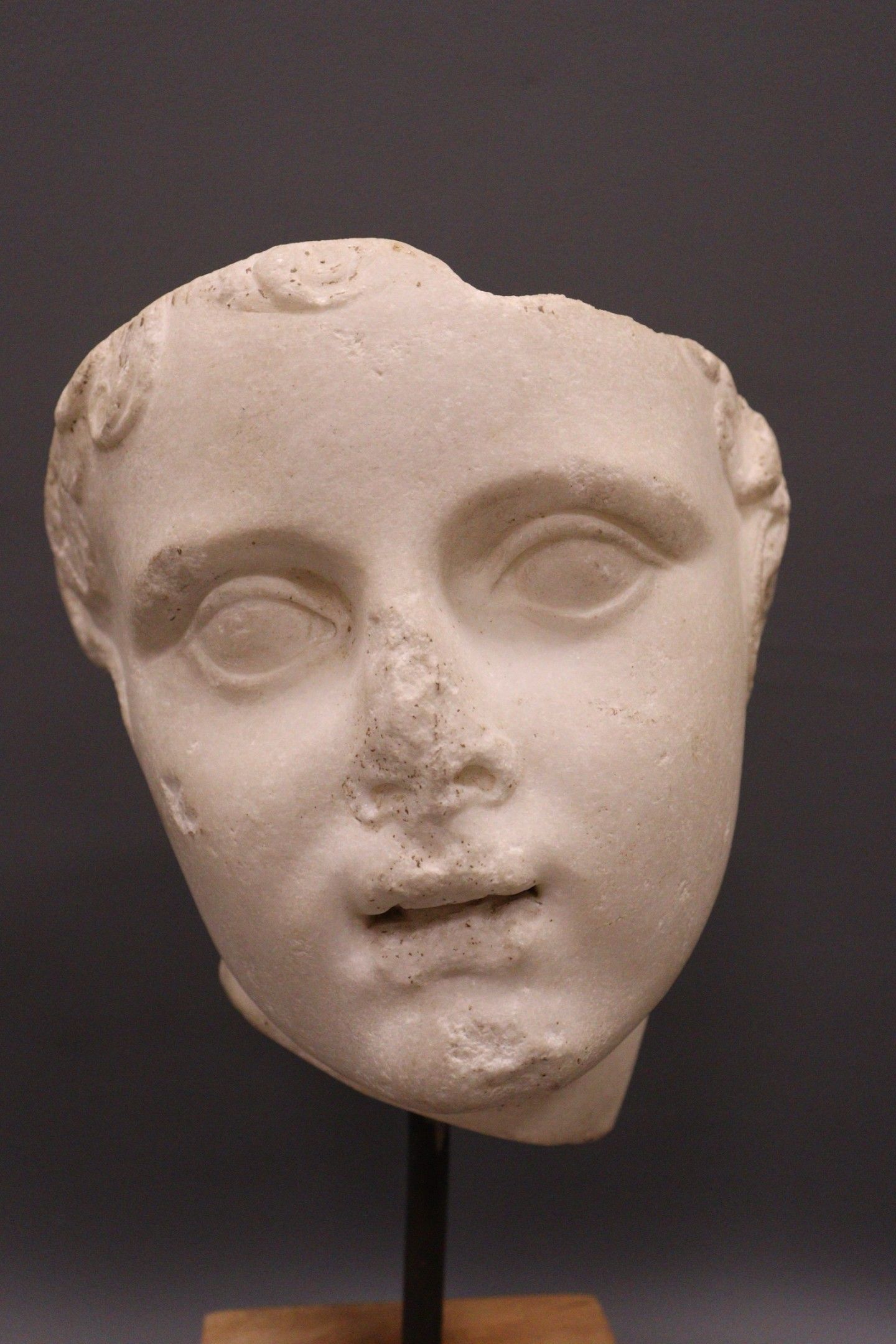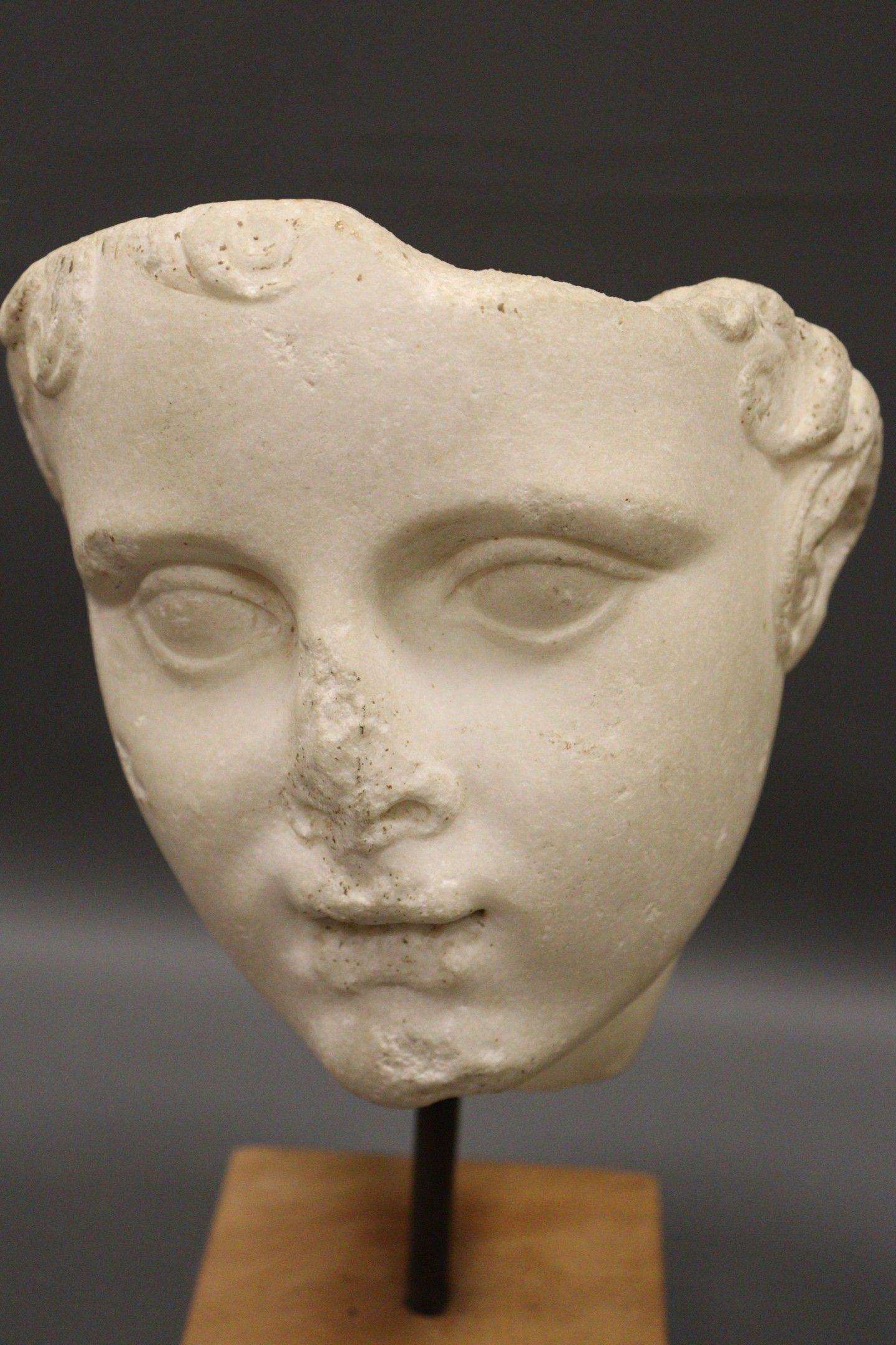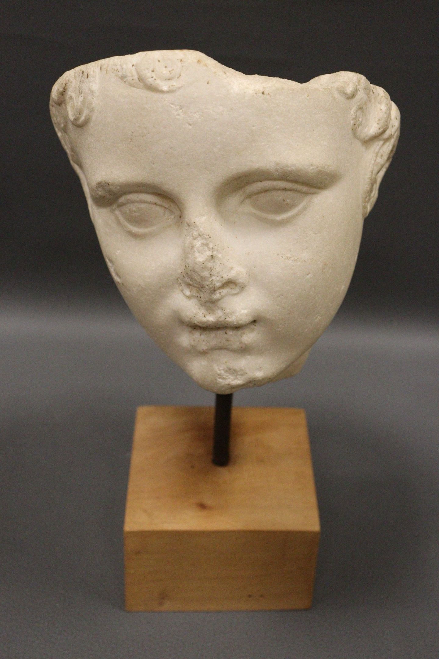 Fragment de tête d’enfant en plâtre en ronde bosse. Monté sur une base quadrangulaire en bois. H. : 33,5 cm