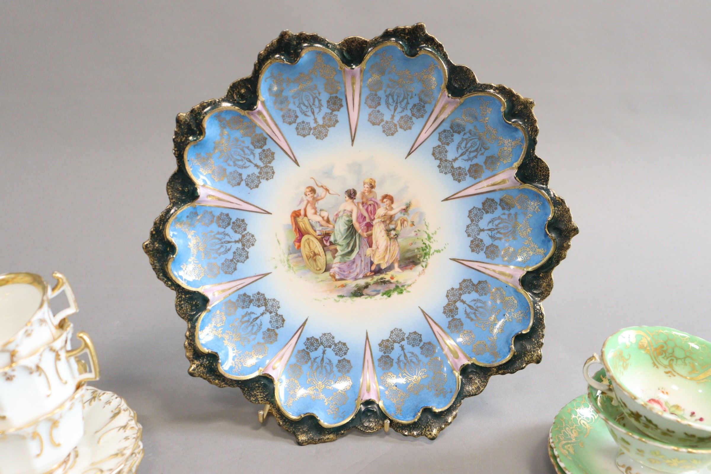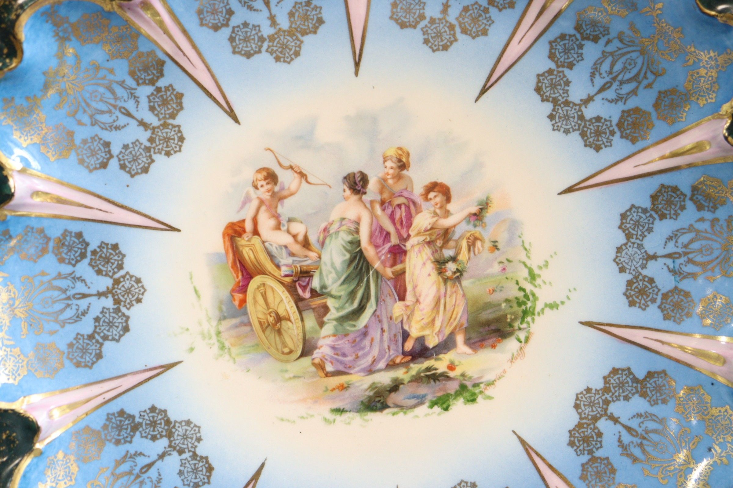 Ensemble de porcelaines anciennes comprenant : - VIENNE. Assiette en porcelaine à décor polychrome représentant Cupidon sur un char. Marque verte. Fin du XIXème siècle. D.: 32 cm ;