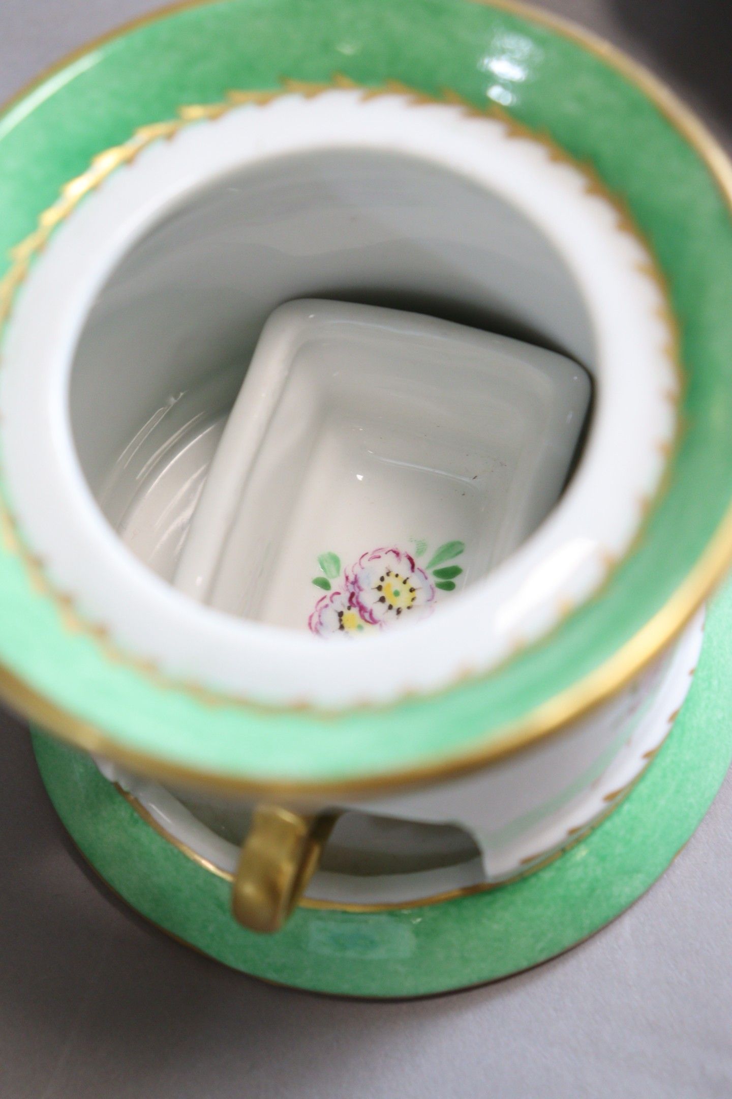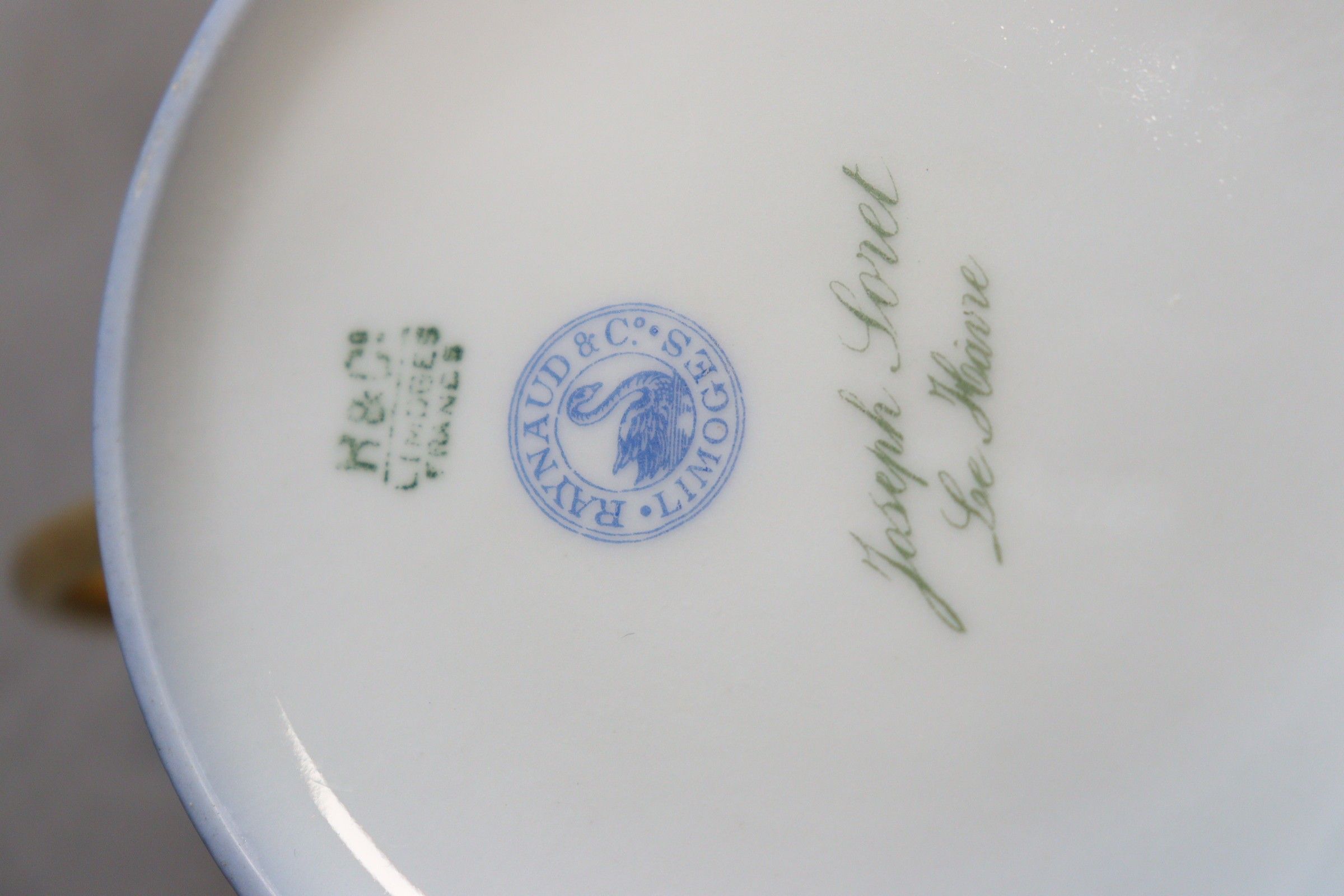 - GIRAUD à Limoges. Tisanière avec réchaud en porcelaine blanche à décor doré peint à la main ;