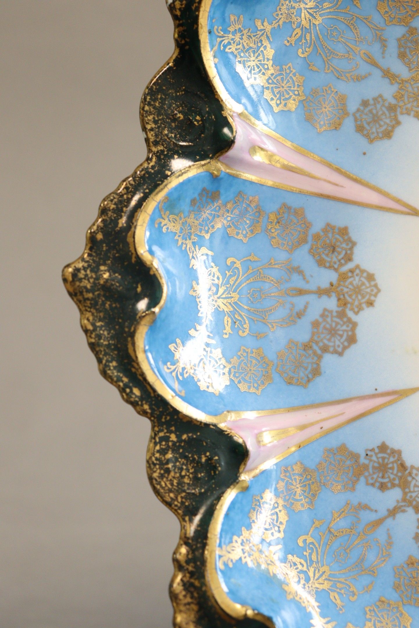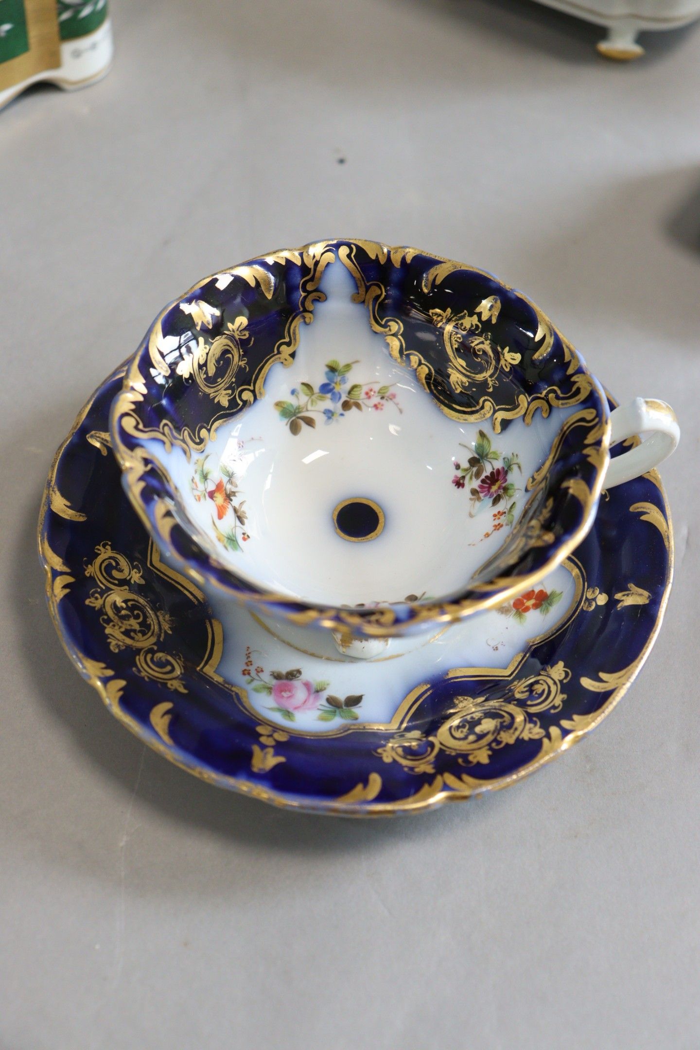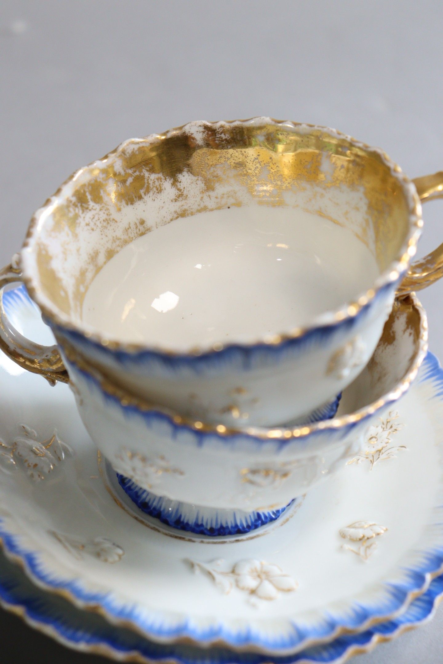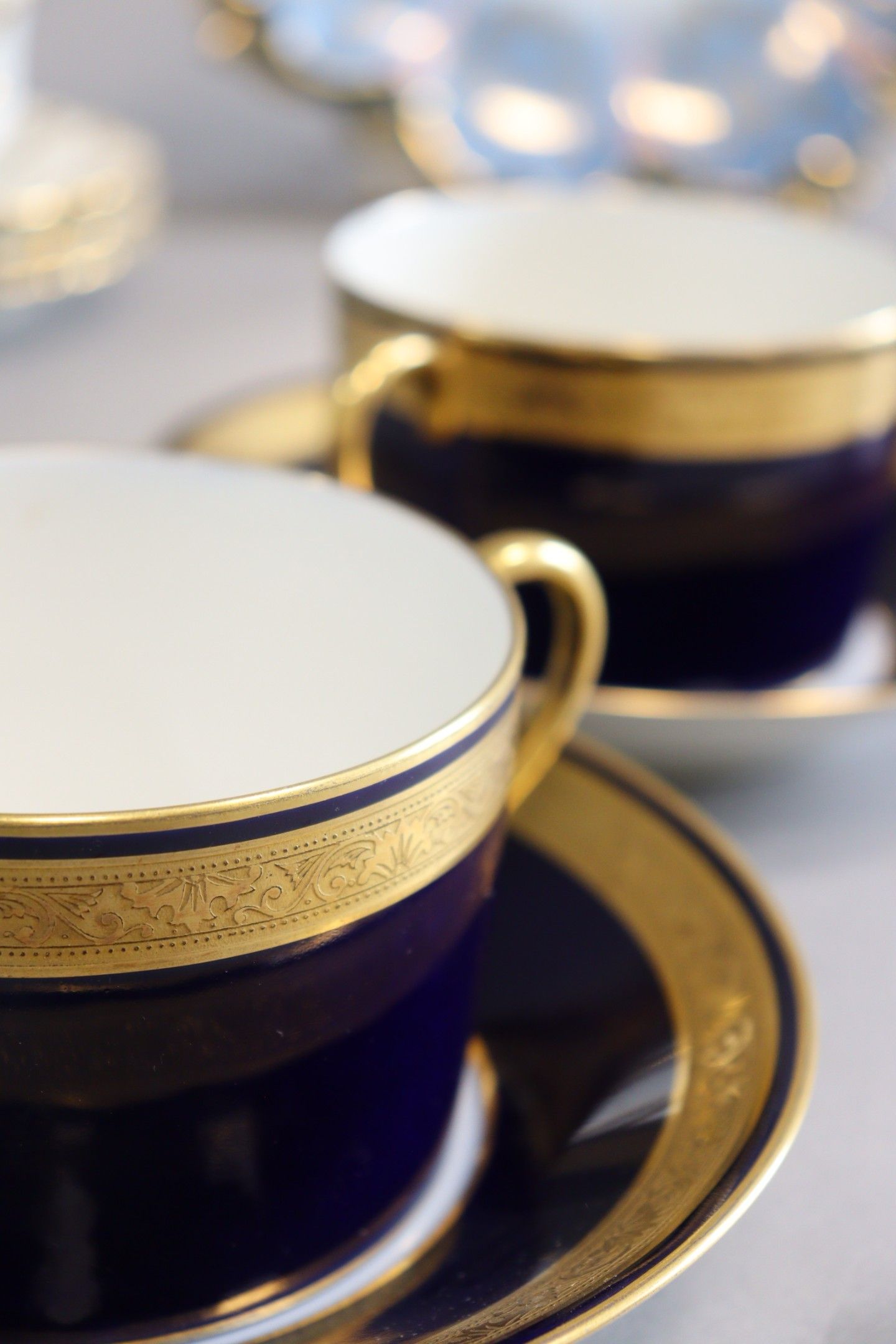 On joint : RAYNAUD. Paire de tasses à thé en porcelaine avec sous-tasse à fond bleu et frise dorée. (Fêle)