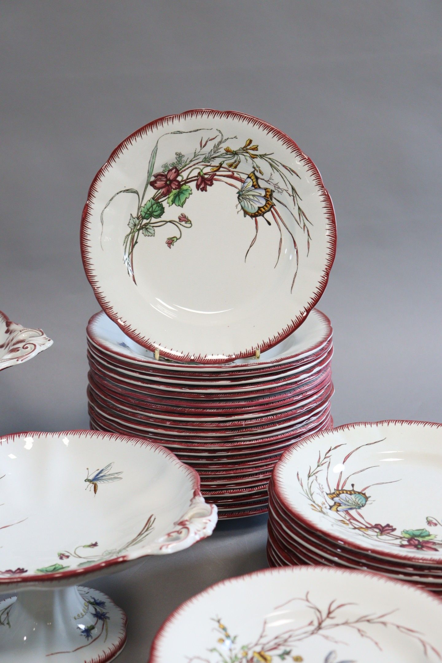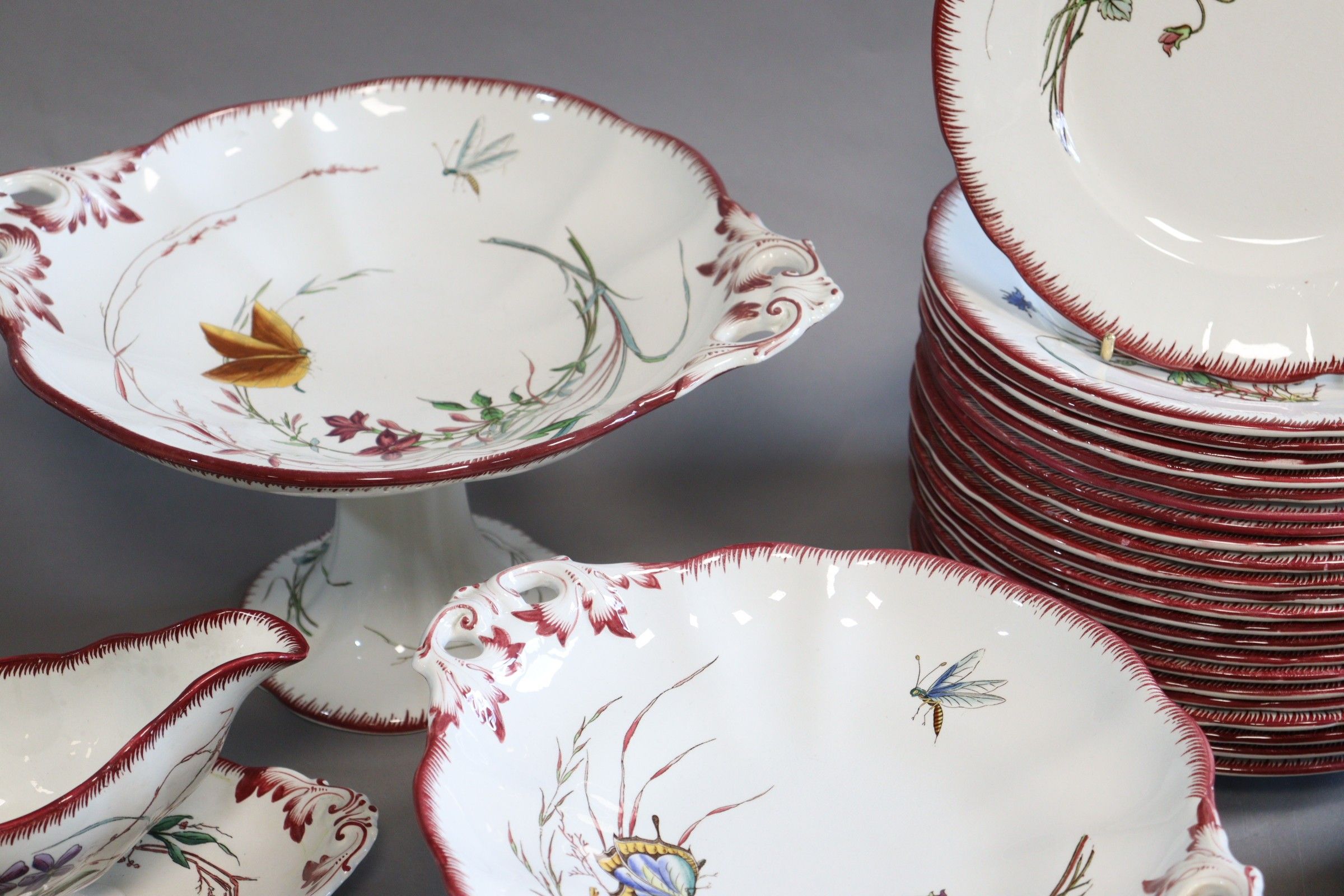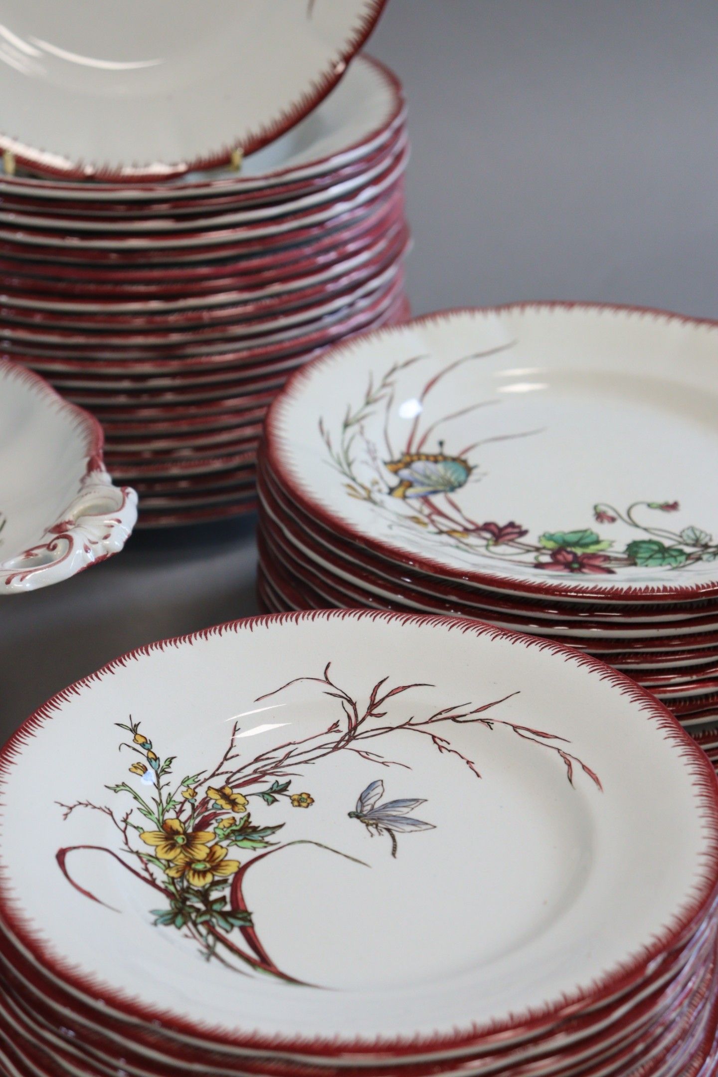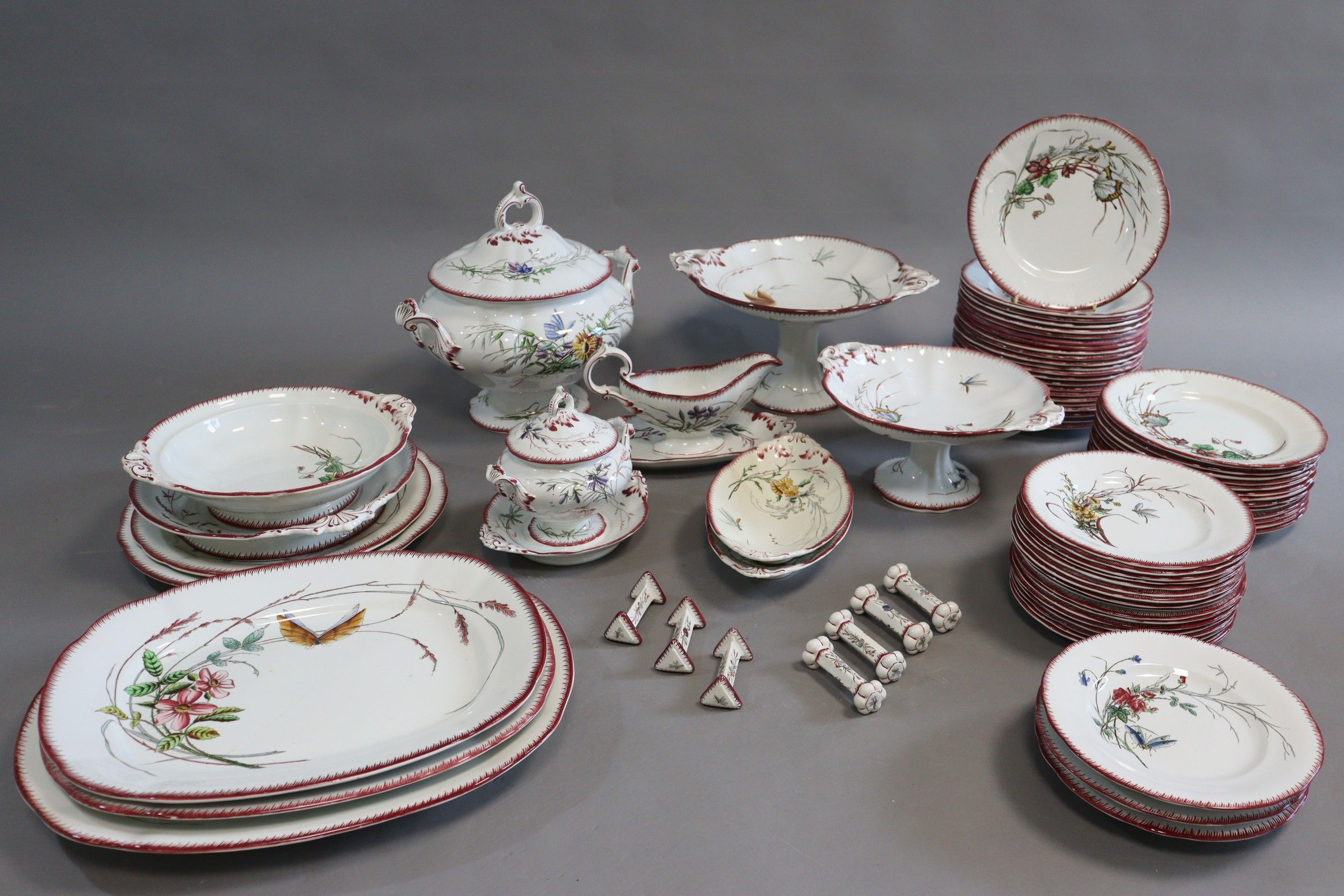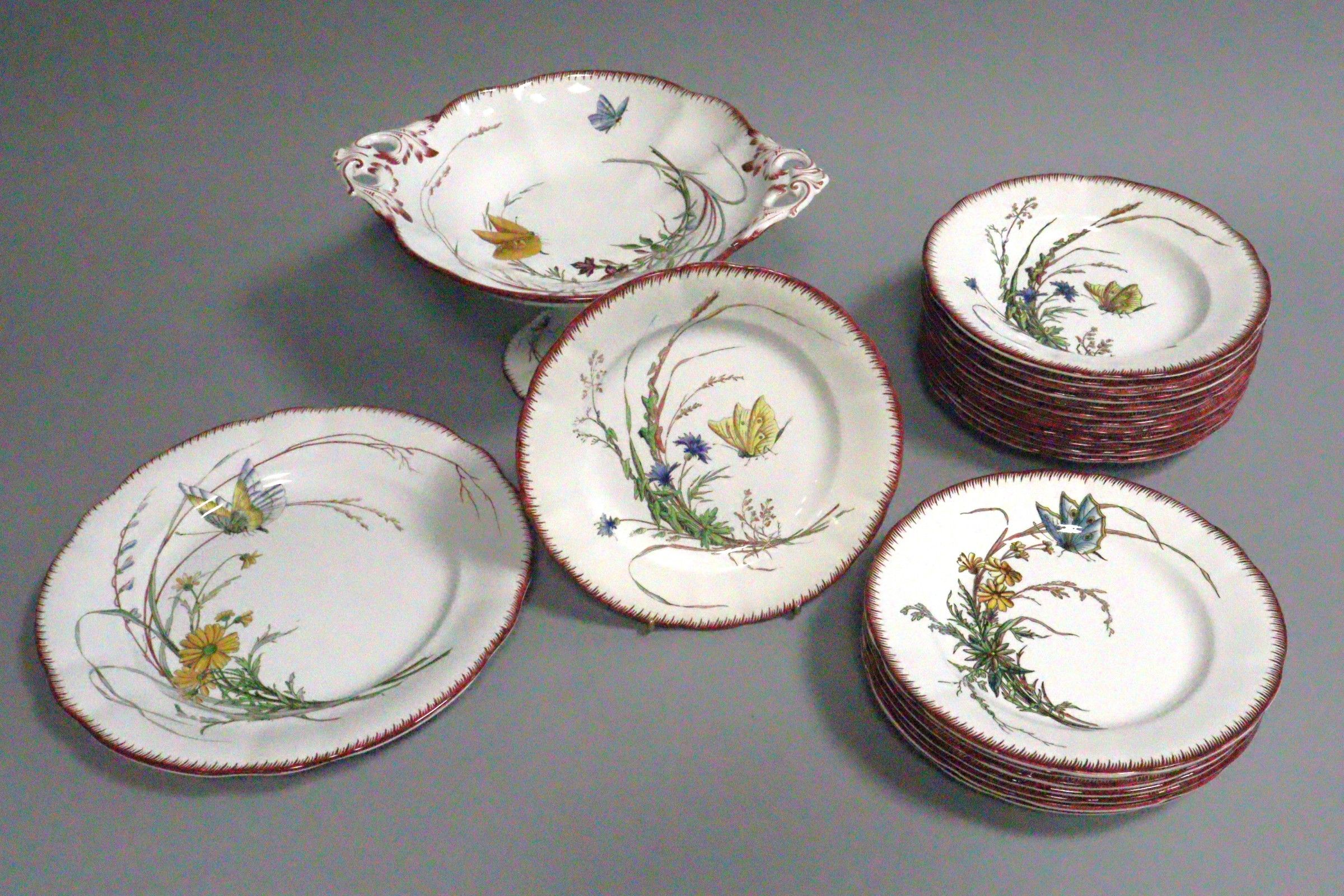 SARREGUEMINES. Modèle Papillons. Partie de service de table contenant 126 pièces, dont : 58 assiettes plates, 12 assiettes creuses, 25 assiettes à dessert, 3 assiettes sur talon, 5 assiettes sur piédouche, 2 raviers, une saucière, un sucrier, une soupière, 3 coupes à fruit, 3 plats ronds, 2 plats avec anses, 3 plats rectangulaires, 7 porte-couteaux. (Fêle sur un plat -> A RETIRER)