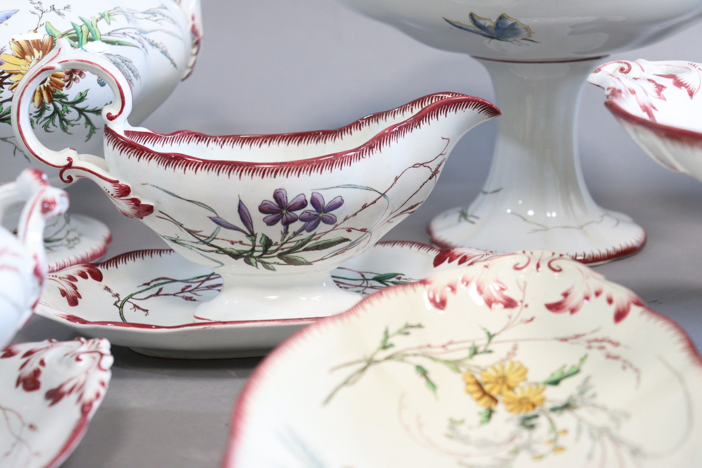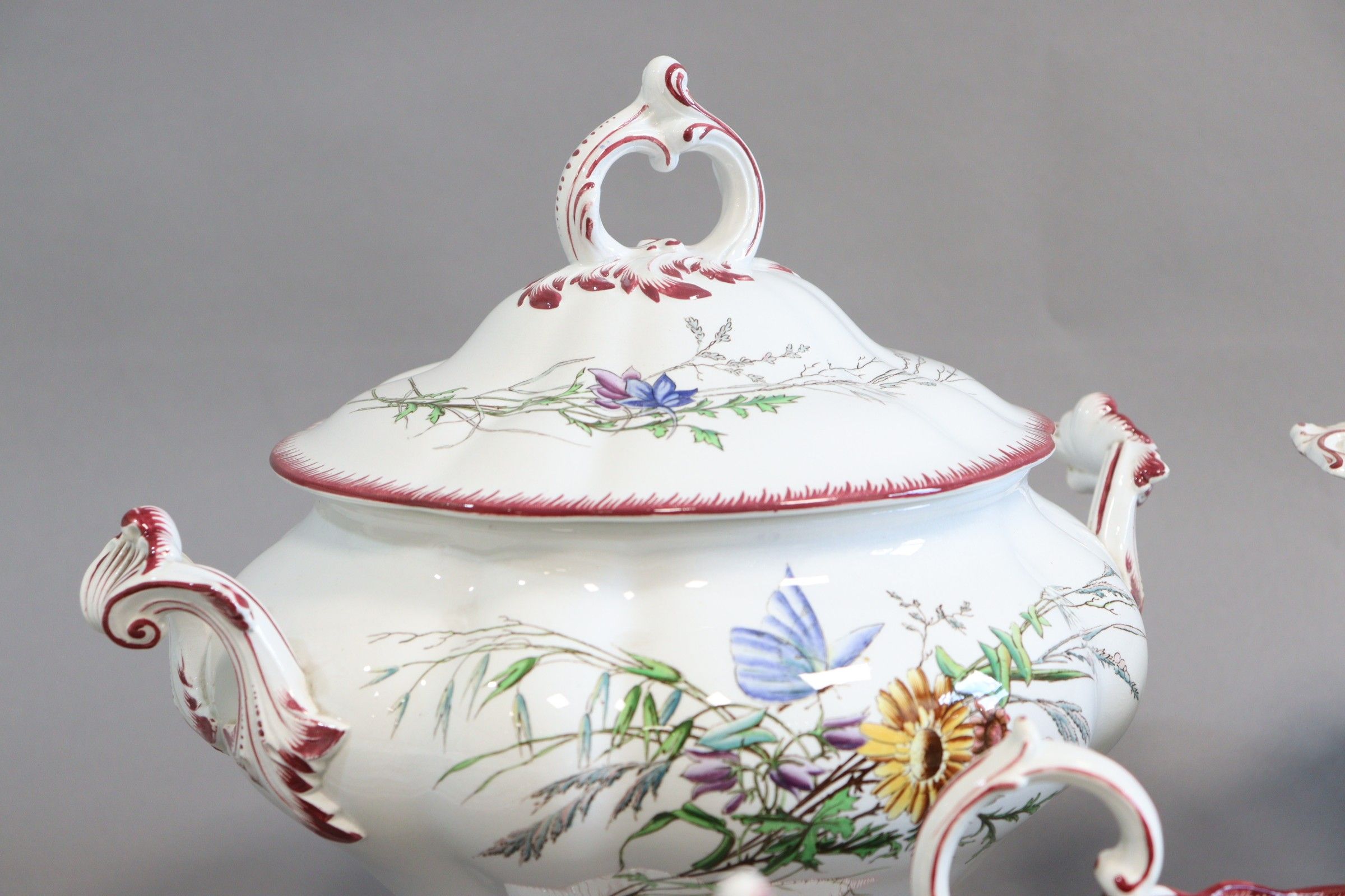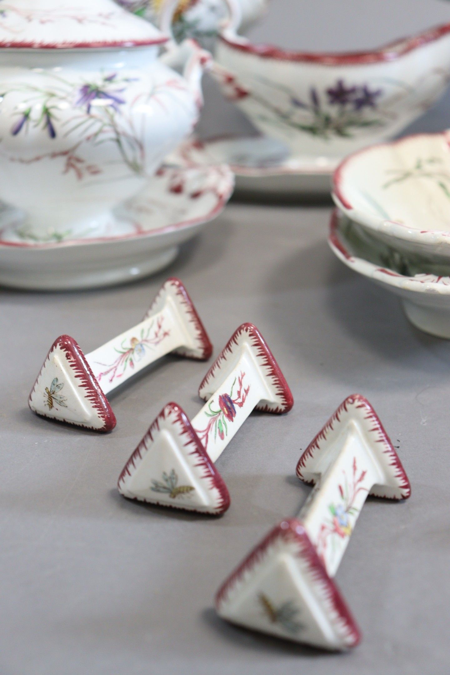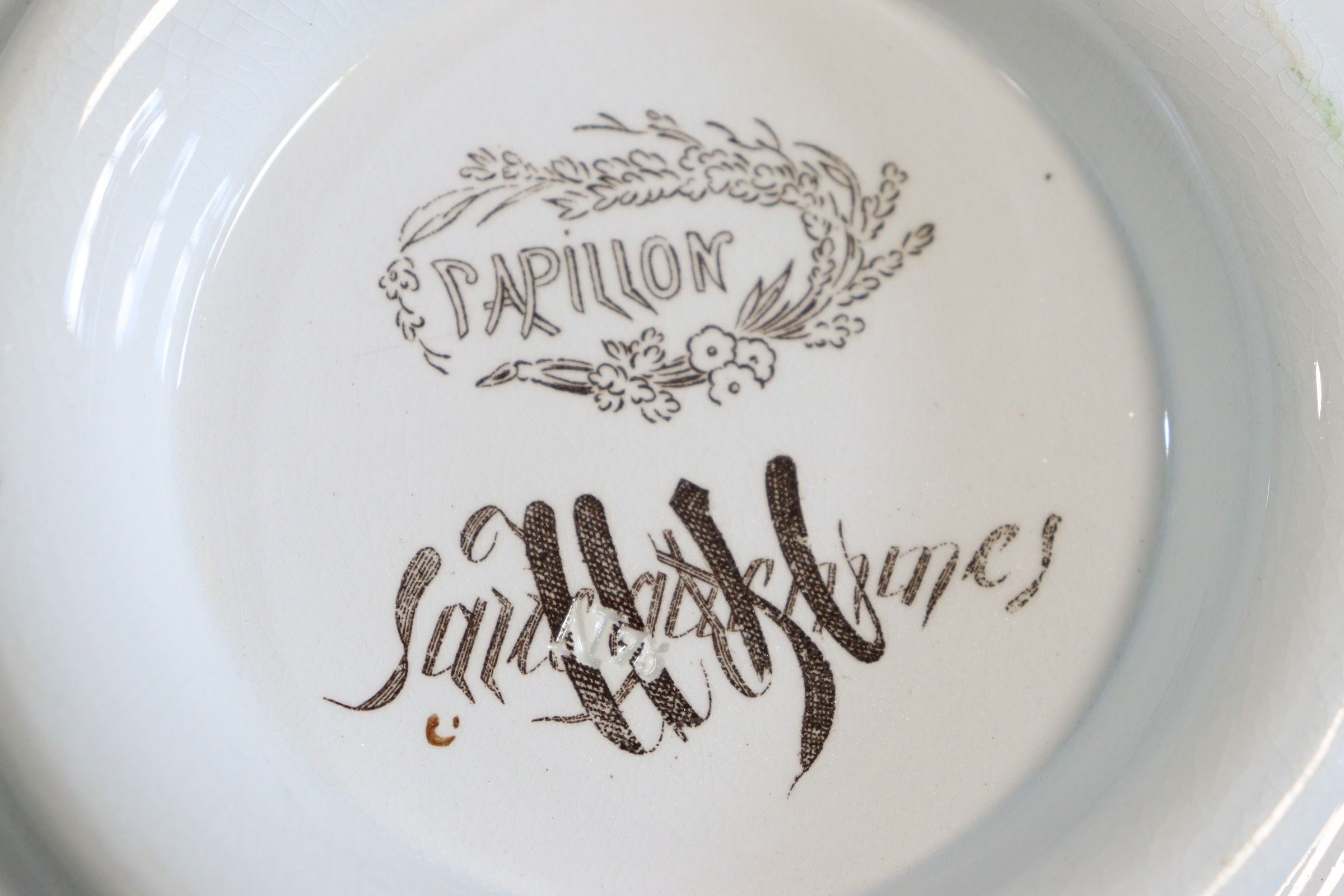 SARREGUEMINES. Modèle Papillons. Partie de service de table contenant 126 pièces, dont : 58 assiettes plates, 12 assiettes creuses, 25 assiettes à dessert, 3 assiettes sur talon, 5 assiettes sur piédouche, 2 raviers, une saucière, un sucrier, une soupière, 3 coupes à fruit, 3 plats ronds, 2 plats avec anses, 3 plats rectangulaires, 7 porte-couteaux. (Fêle sur un plat -> A RETIRER)