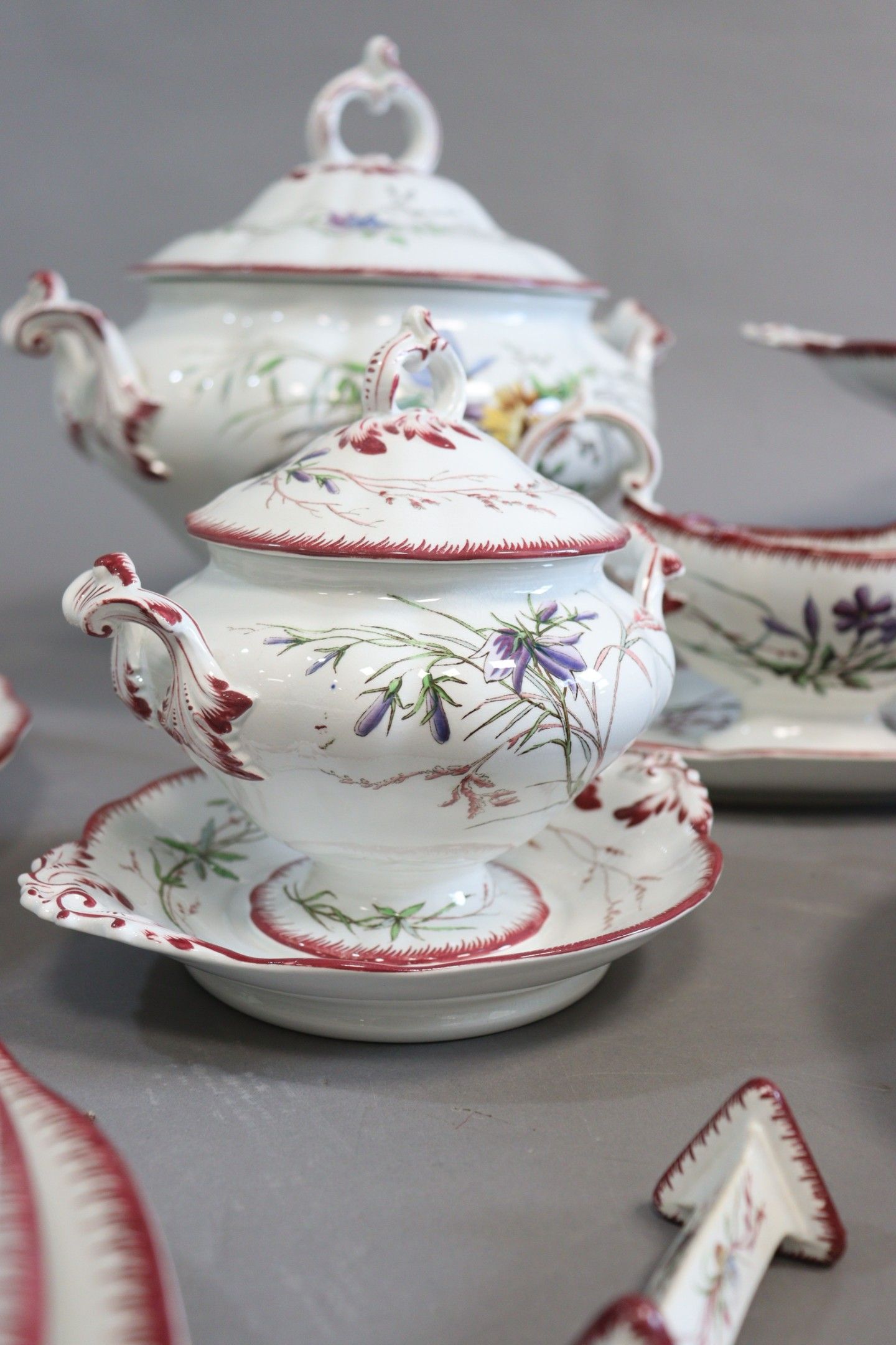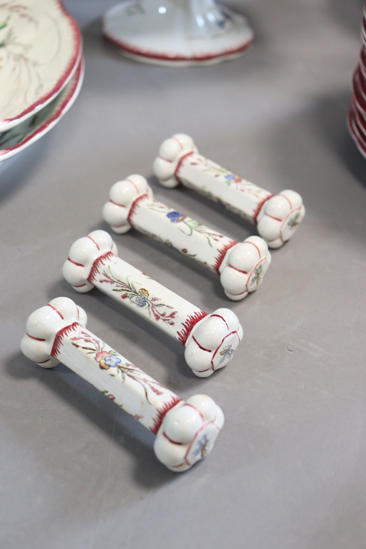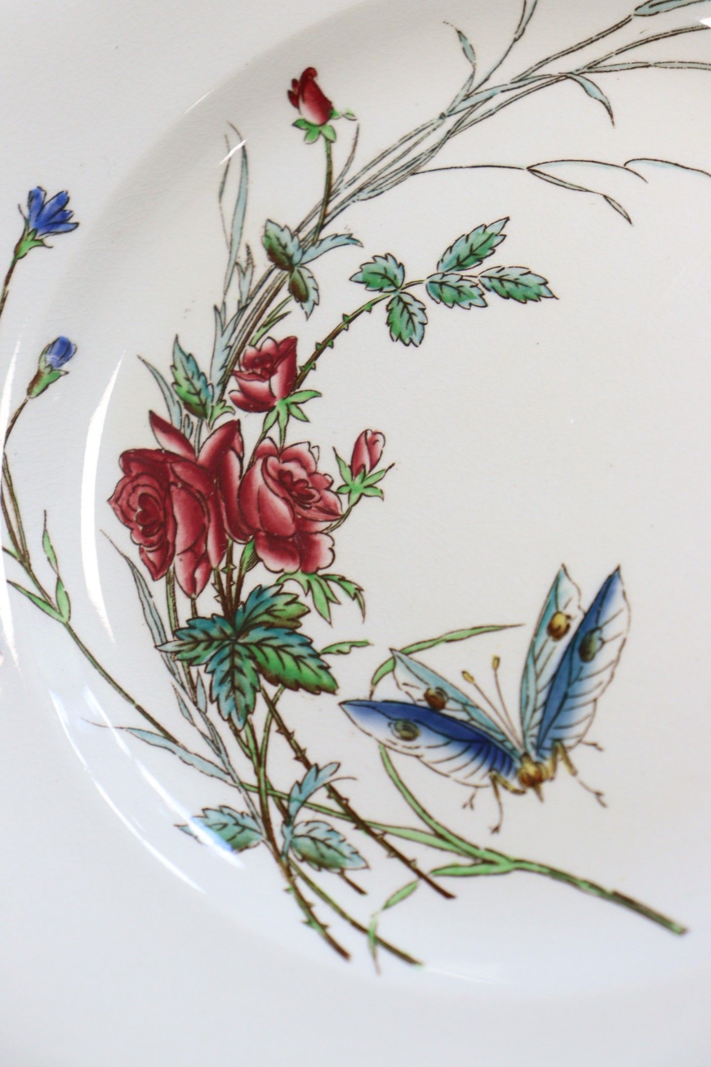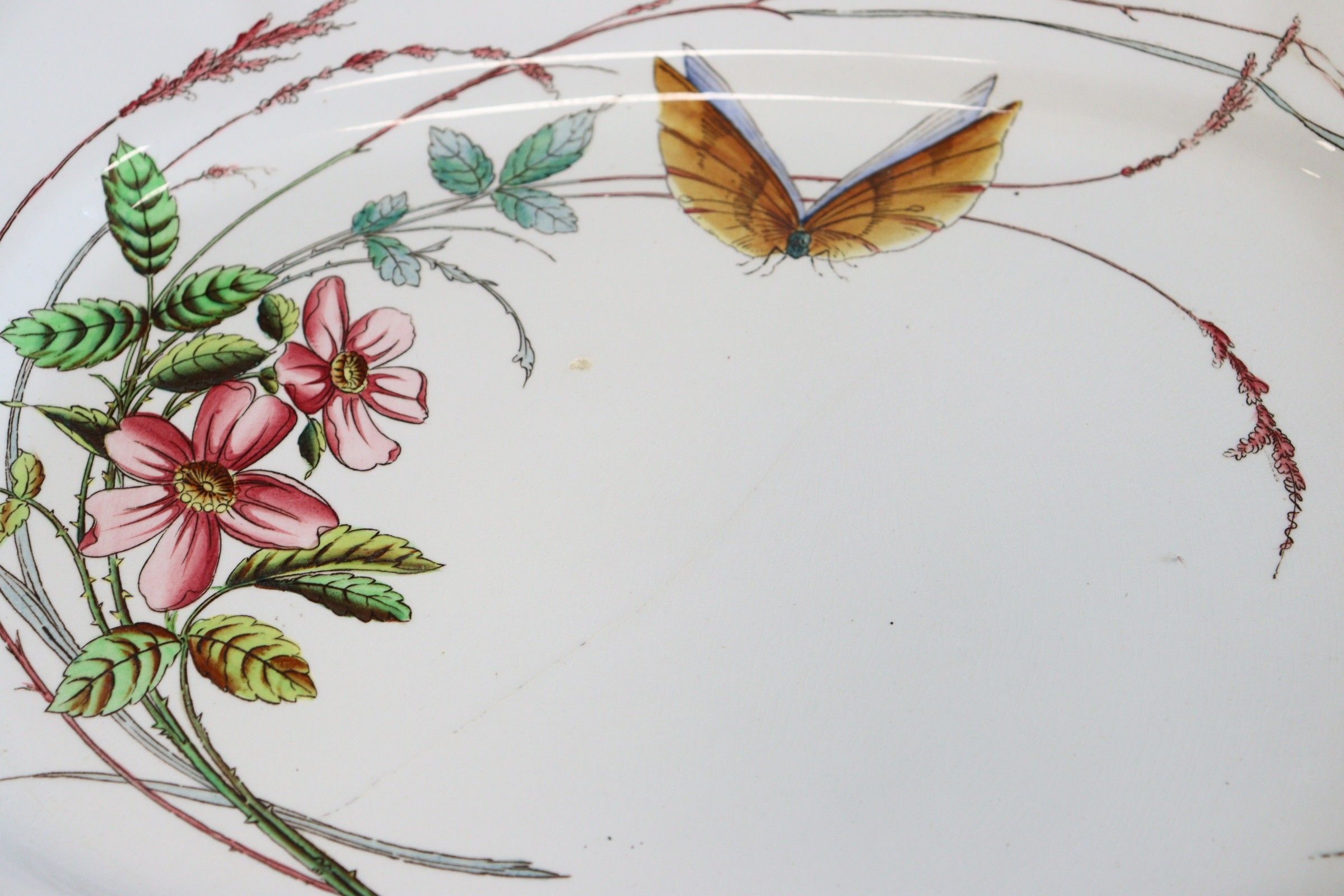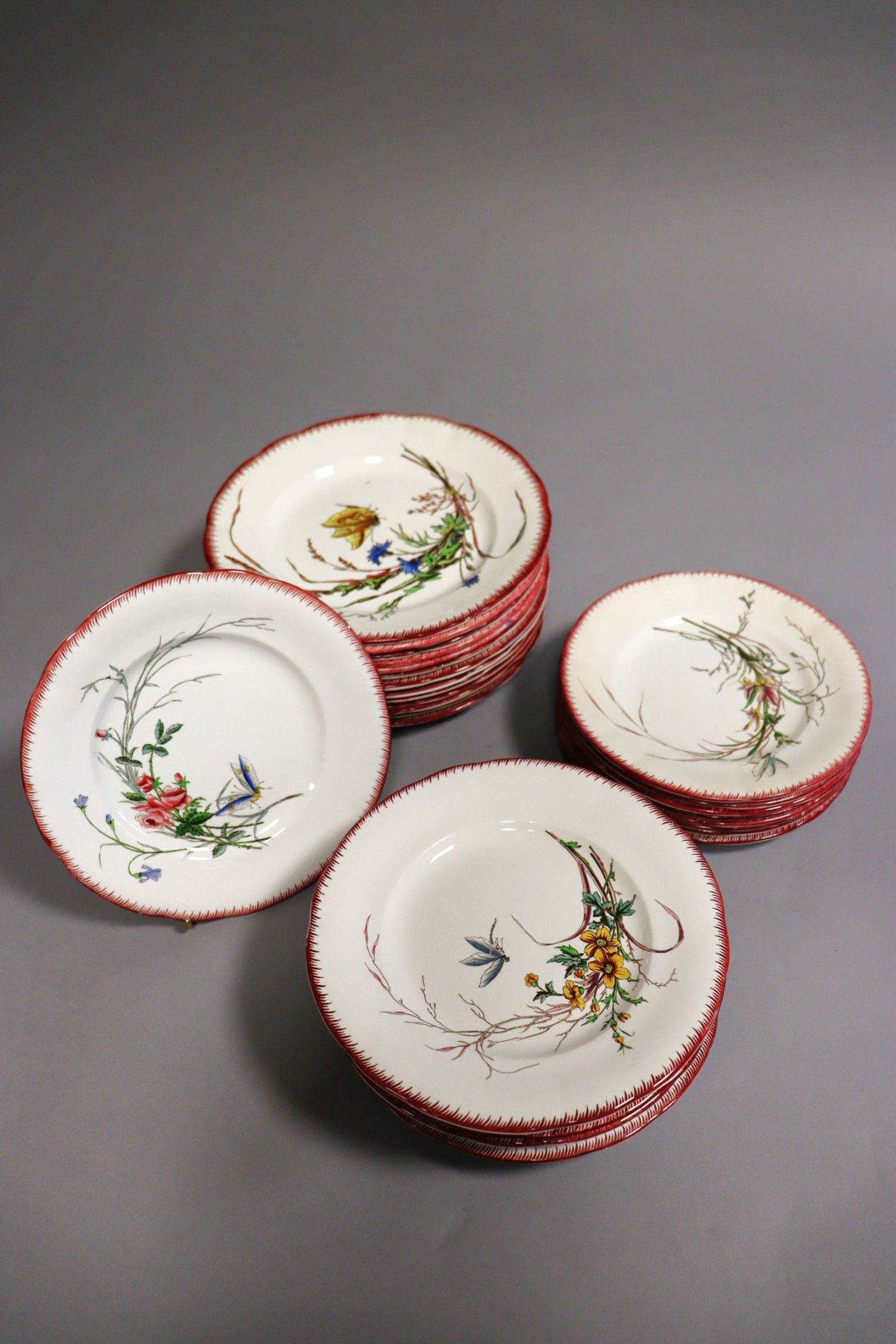 SARREGUEMINES. Modèle Papillons. Partie de service de table contenant 126 pièces, dont : 58 assiettes plates, 12 assiettes creuses, 25 assiettes à dessert, 3 assiettes sur talon, 5 assiettes sur piédouche, 2 raviers, une saucière, un sucrier, une soupière, 3 coupes à fruit, 3 plats ronds, 2 plats avec anses, 3 plats rectangulaires, 7 porte-couteaux. (Fêle sur un plat -> A RETIRER)