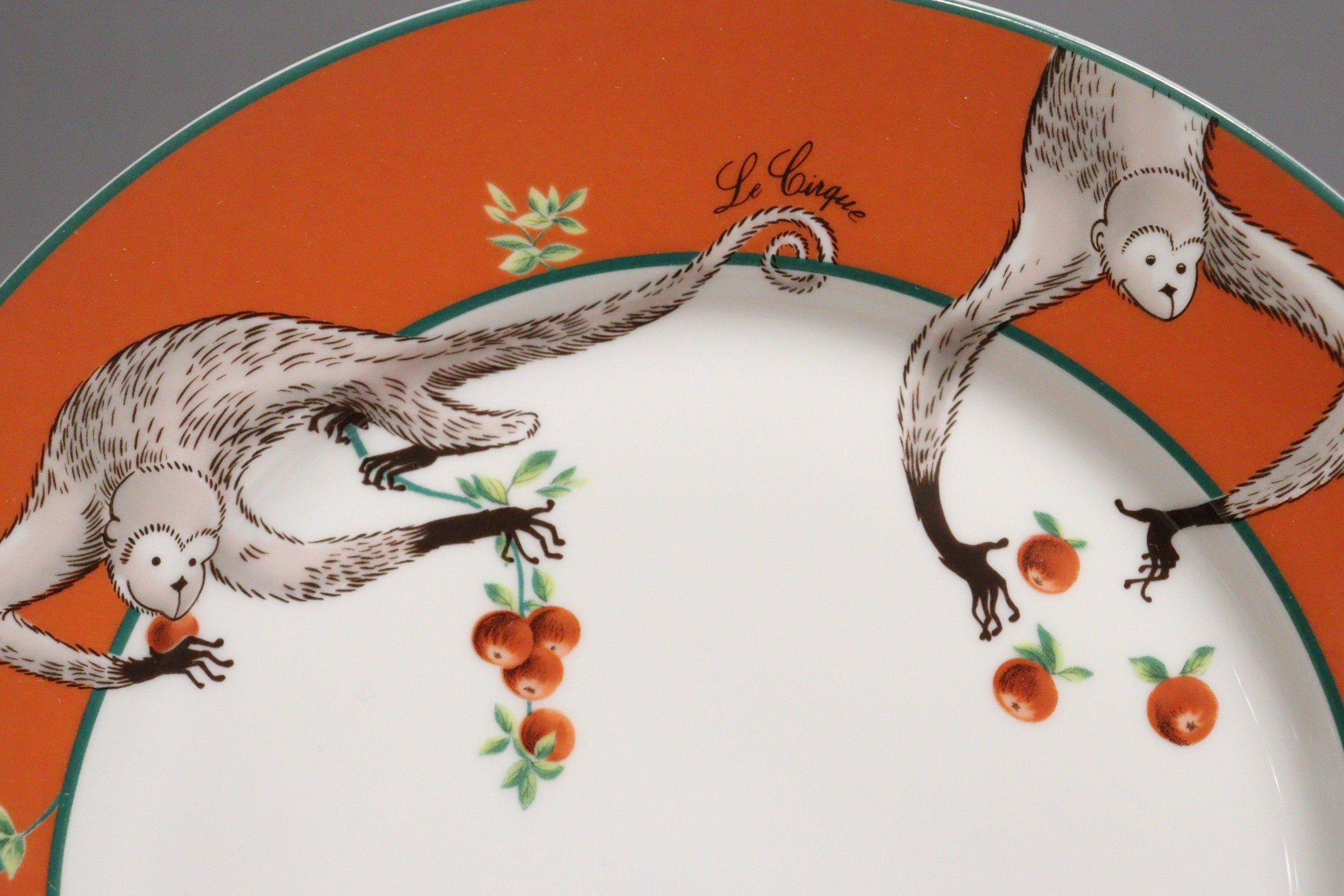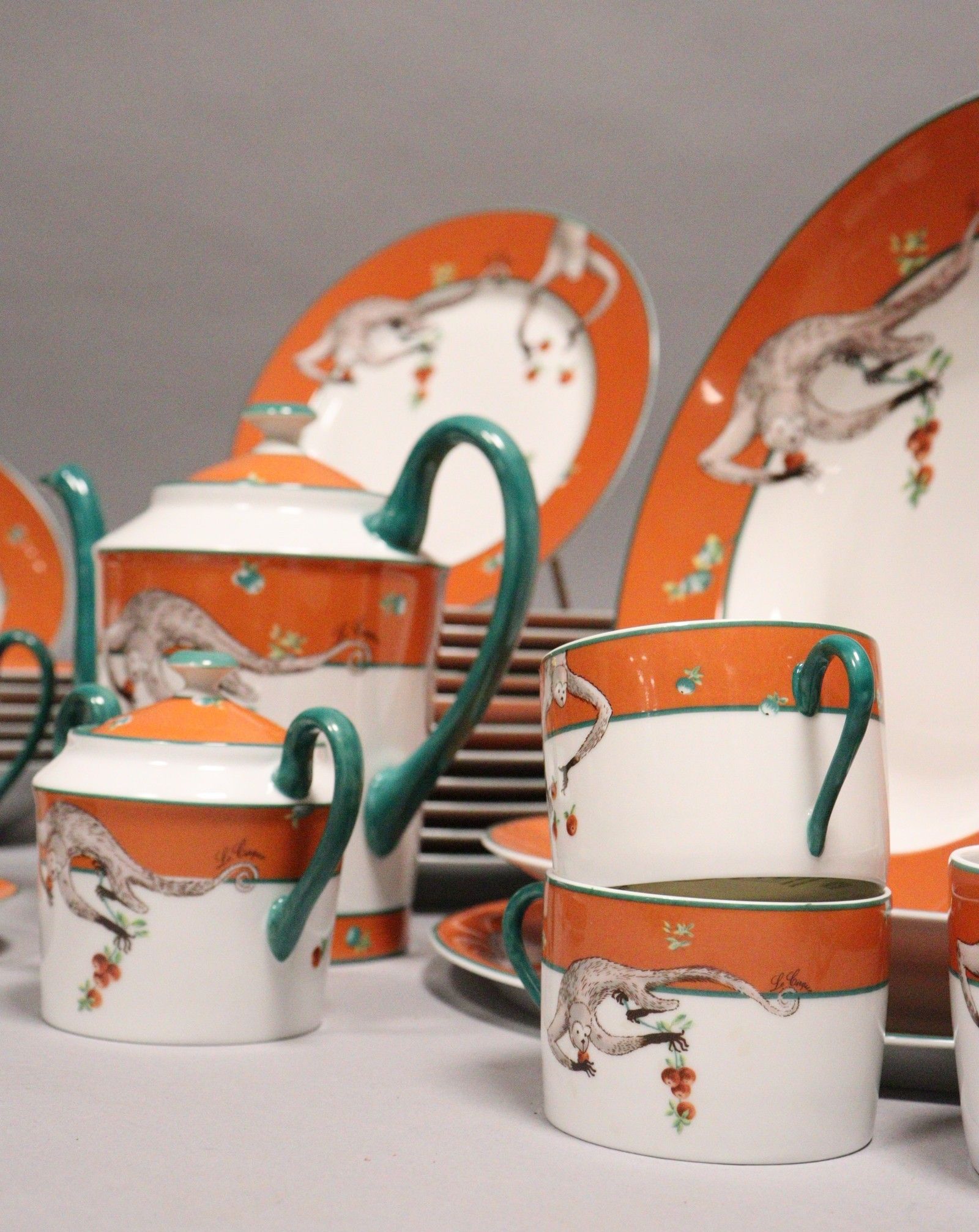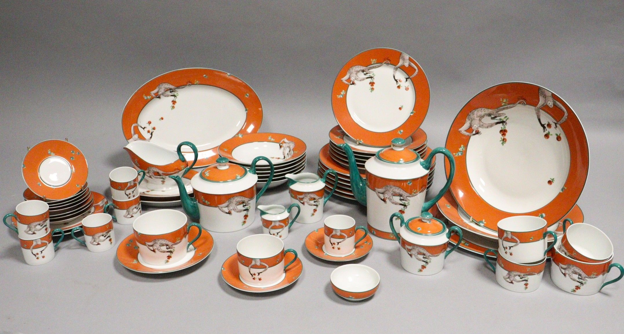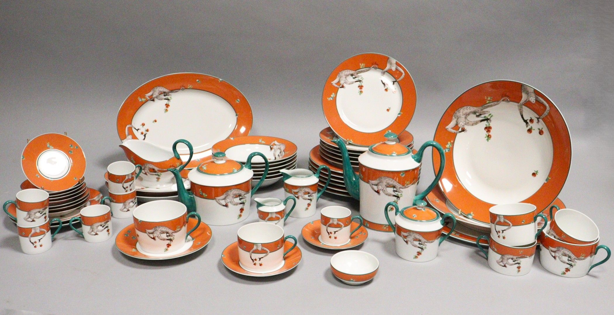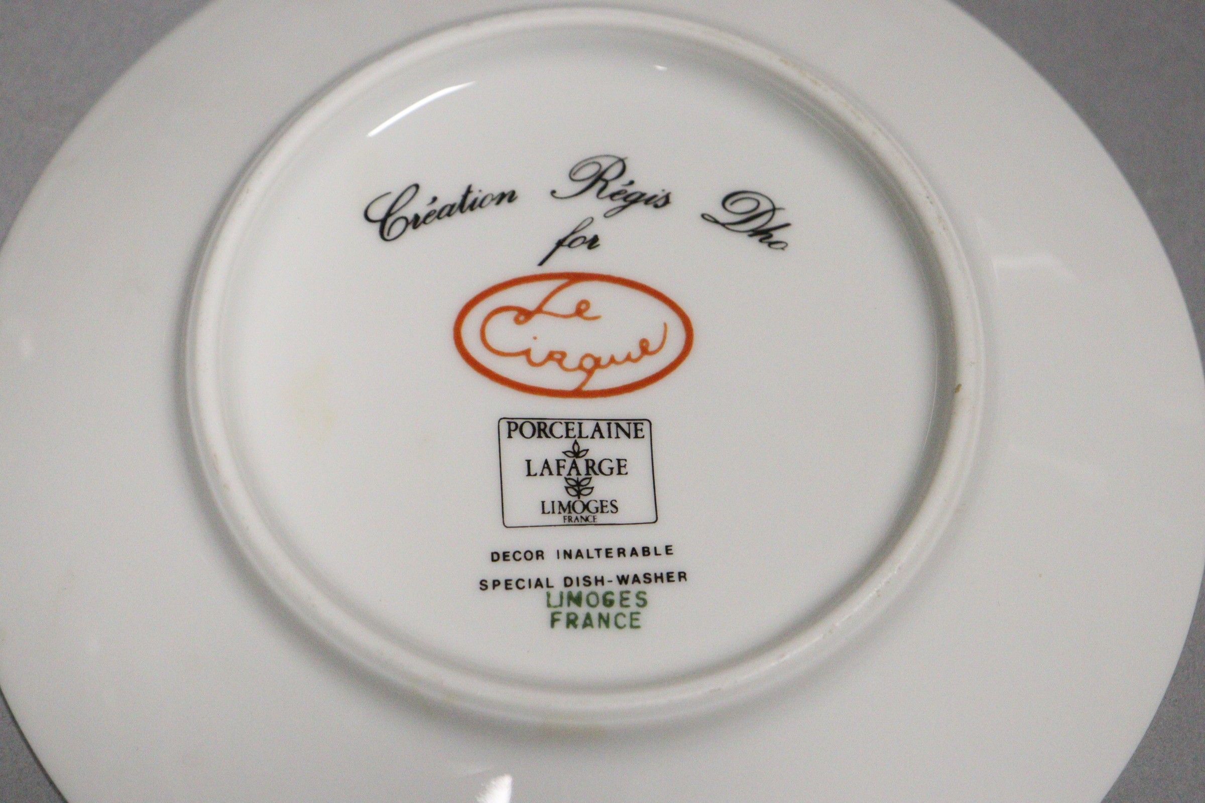 Régis DHO pour LAFARGE LIMOGES FRANCE. Modèle Le Cirque. Partie de service de table en porcelaine de 56 pièces, comprenant : six assiettes de table, six assiettes à entremets, deux assiettes à dessert, six assiettes creuses, un grand plat rond, deux plats ronds creux, un plat ovale, deux raviers, une saucière, une théière, une cafetière, un pot à sucre, un pot à lait, un pot à chocolat, six tasses à café avec sous-tasses, quatre tasses à thé avec sous-tasses, deux tasses à chocolat et une sous-tasse et une coupelle.