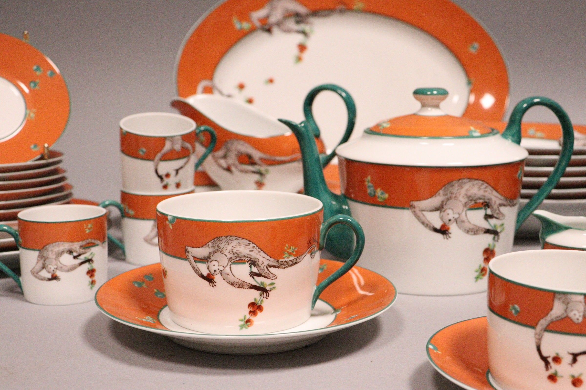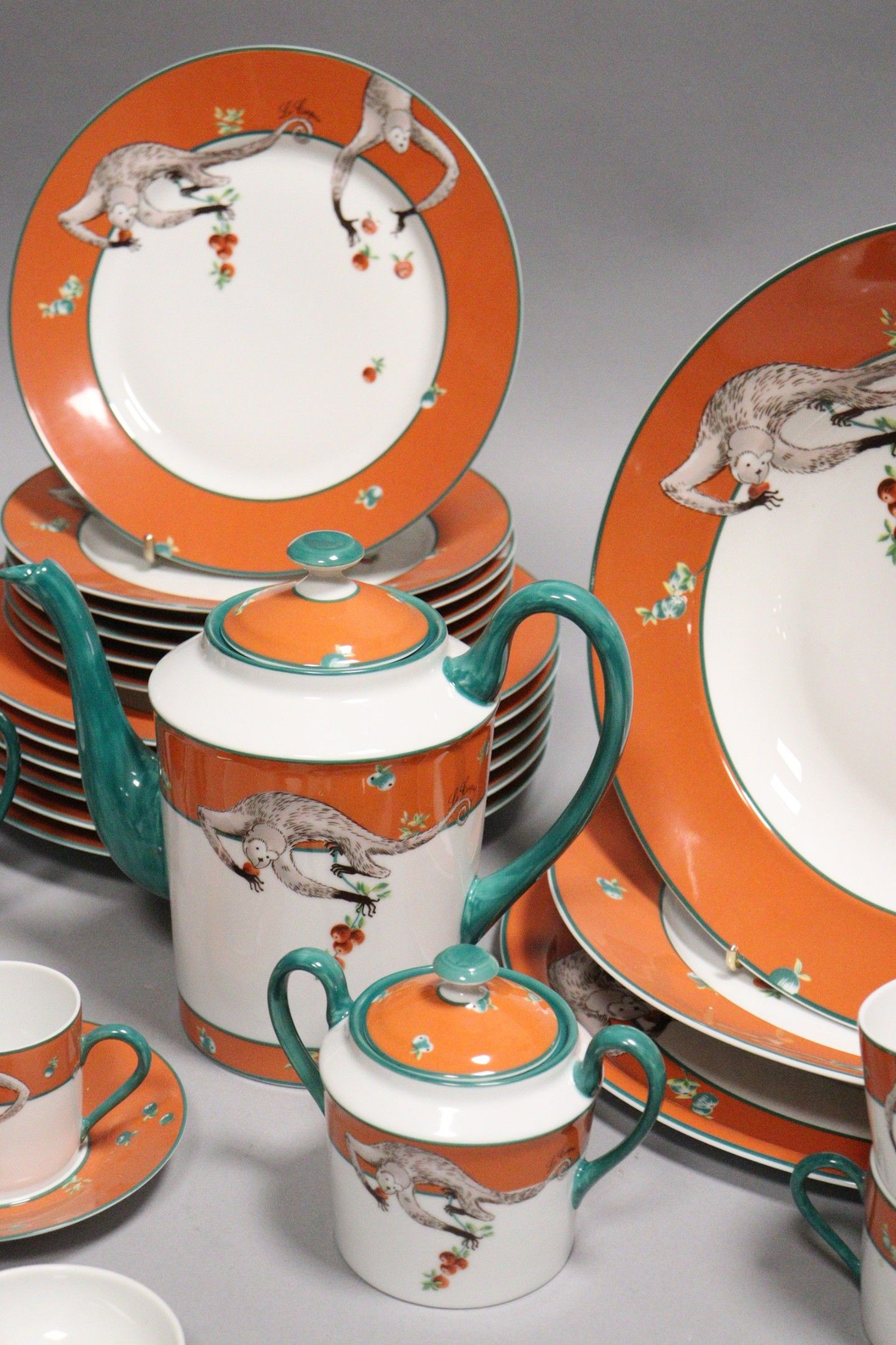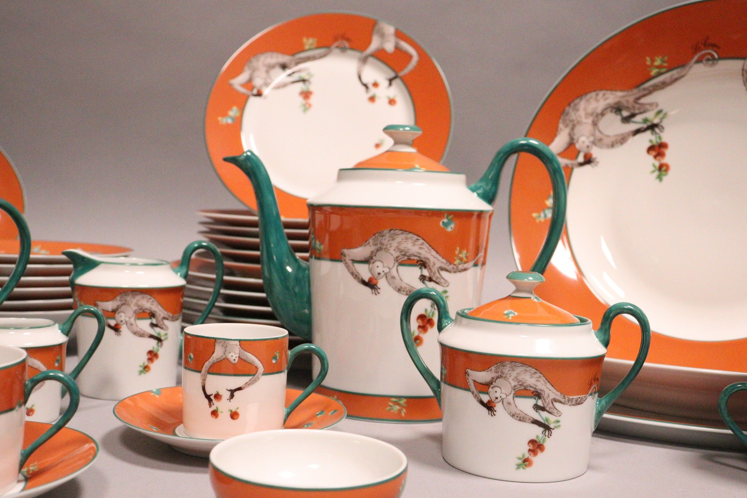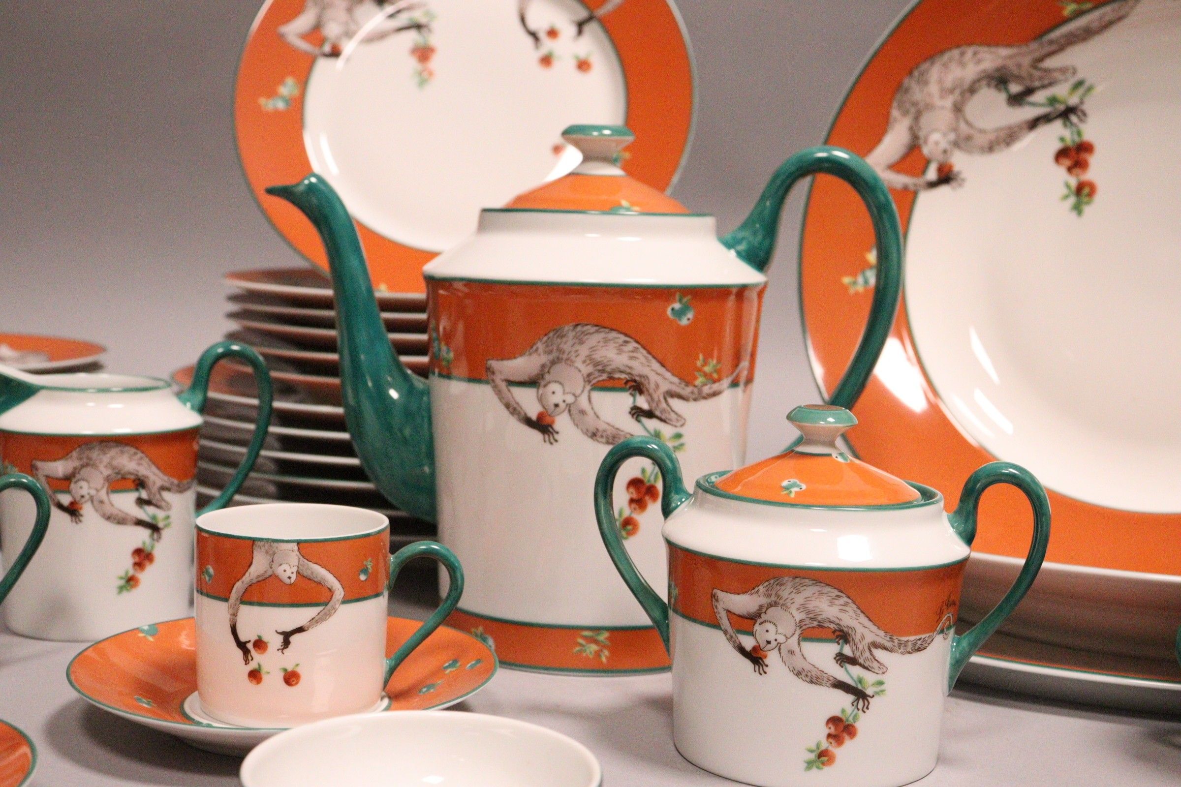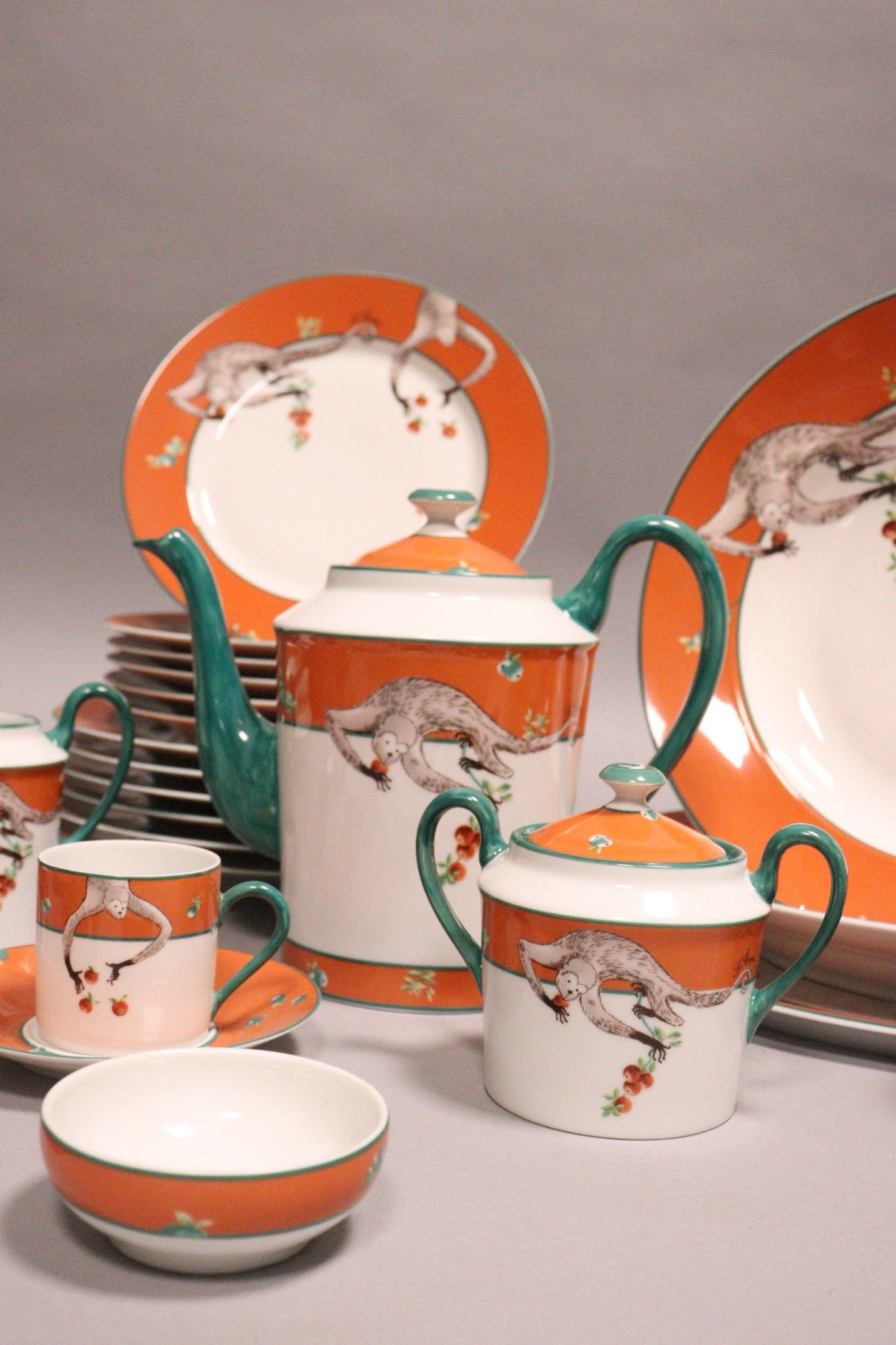 Régis DHO pour LAFARGE LIMOGES FRANCE. Modèle Le Cirque. Partie de service de table en porcelaine de 56 pièces, comprenant : six assiettes de table, six assiettes à entremets, deux assiettes à dessert, six assiettes creuses, un grand plat rond, deux plats ronds creux, un plat ovale, deux raviers, une saucière, une théière, une cafetière, un pot à sucre, un pot à lait, un pot à chocolat, six tasses à café avec sous-tasses, quatre tasses à thé avec sous-tasses, deux tasses à chocolat et une sous-tasse et une coupelle.
