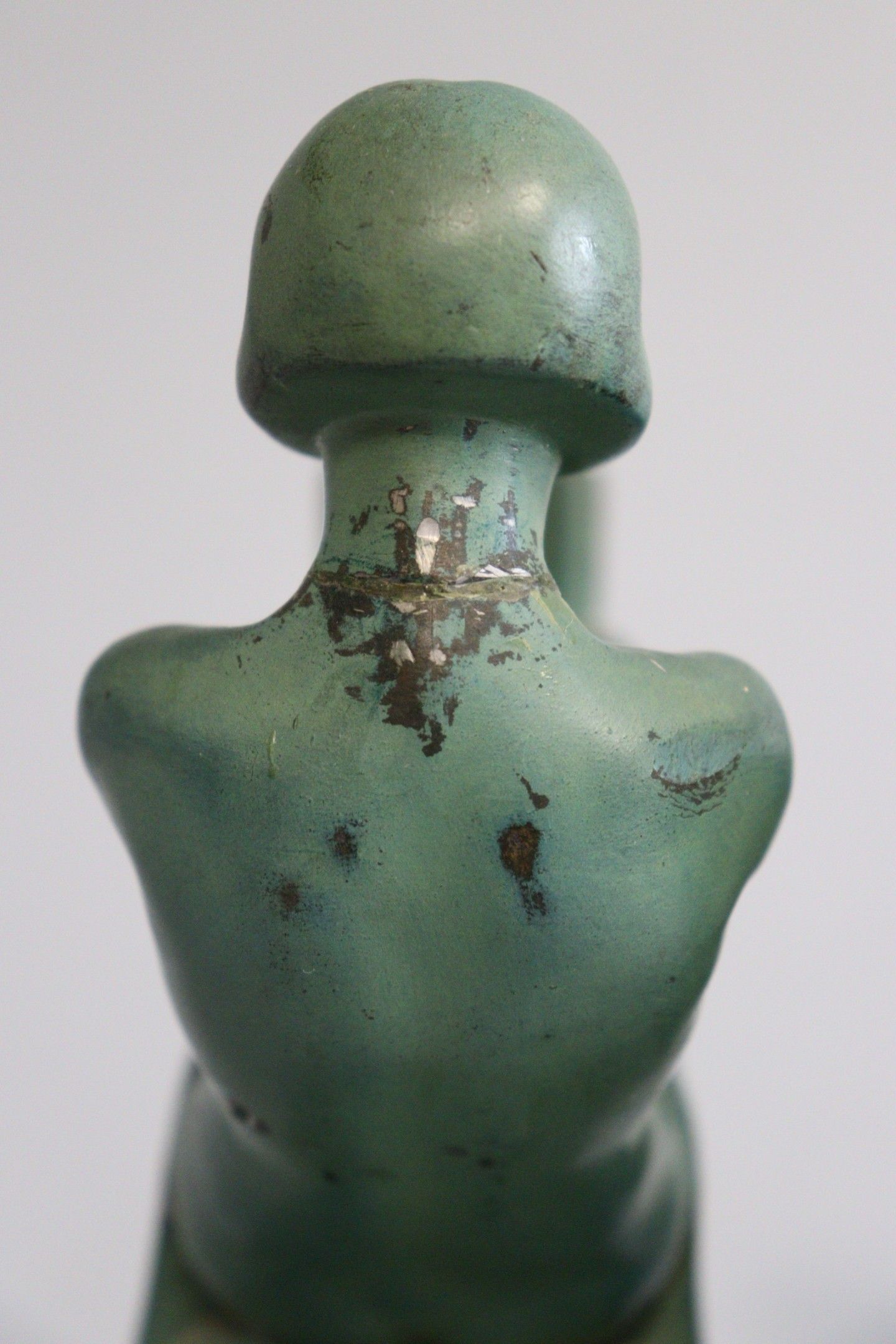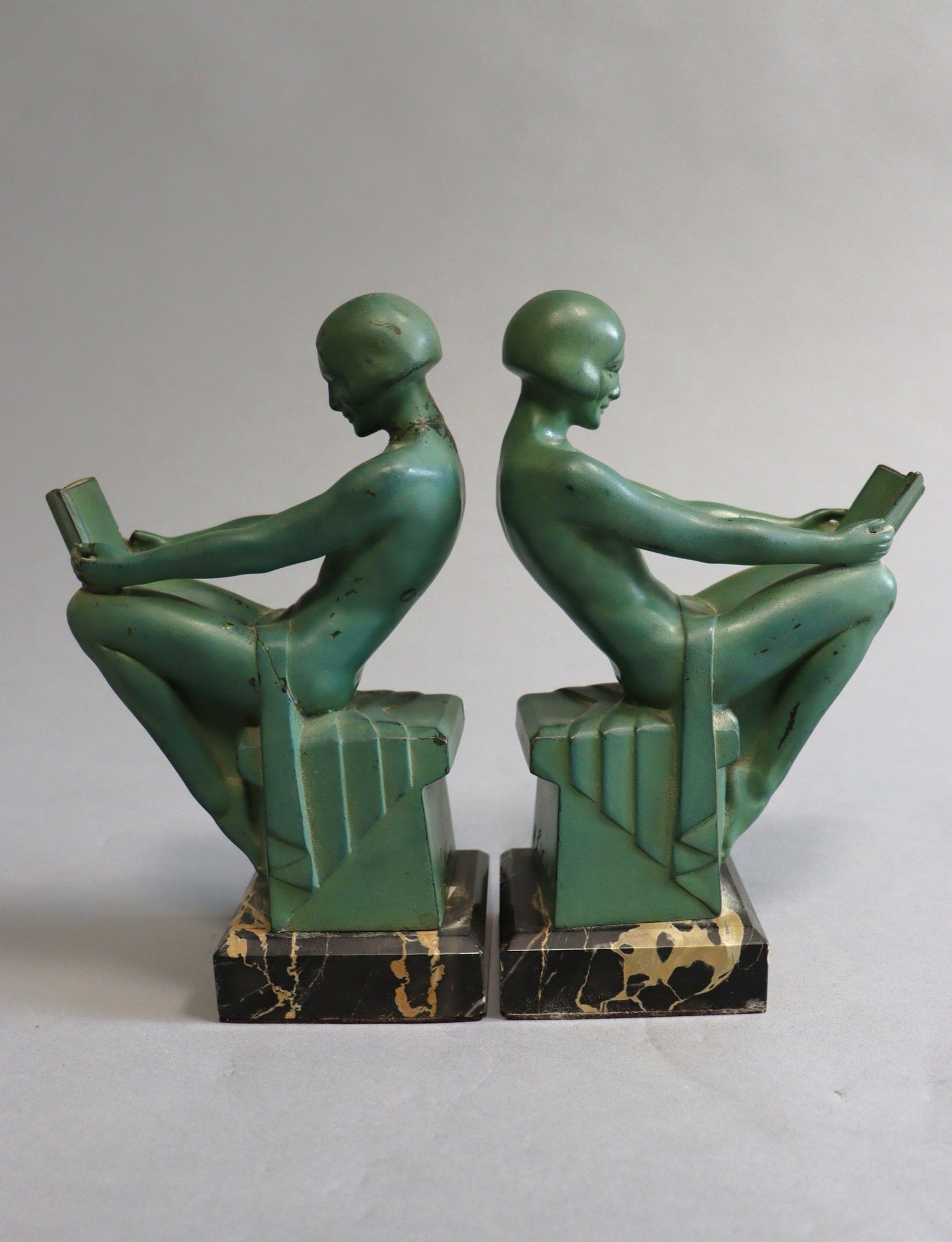 MAX LE VERRIER (1891-1973). Délassement. Paire de serre-livres en régule à patine vert antique figurant deux femmes lisant, signés. H.: 20 cm