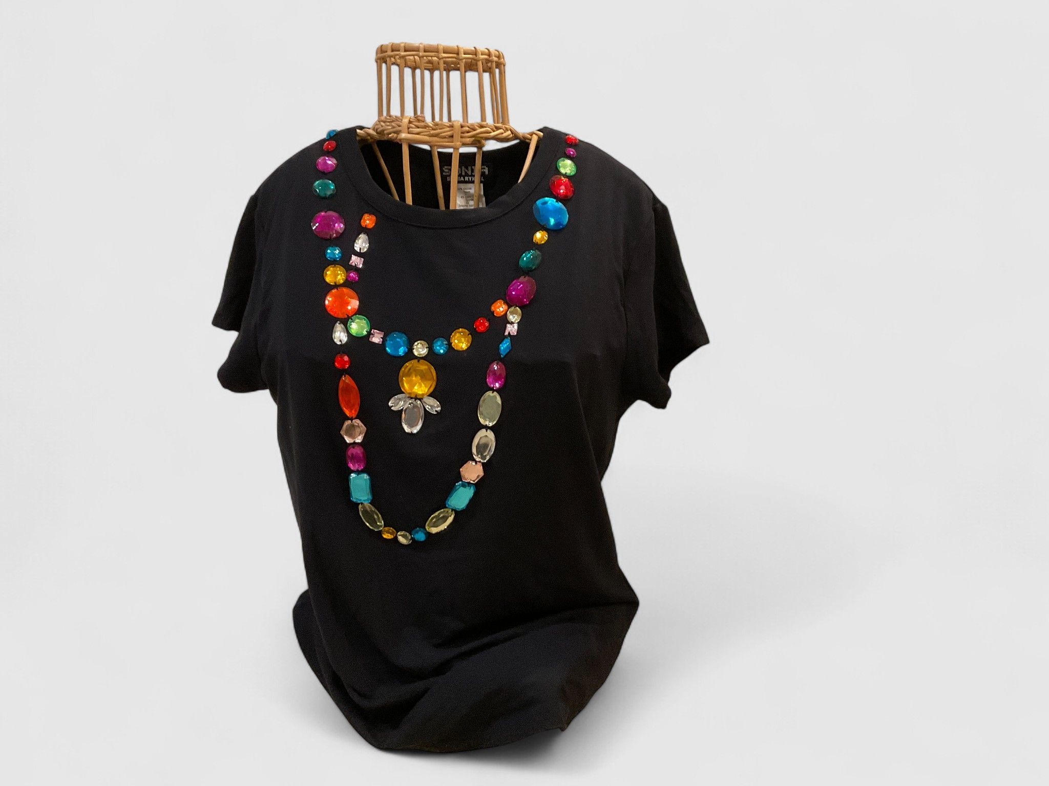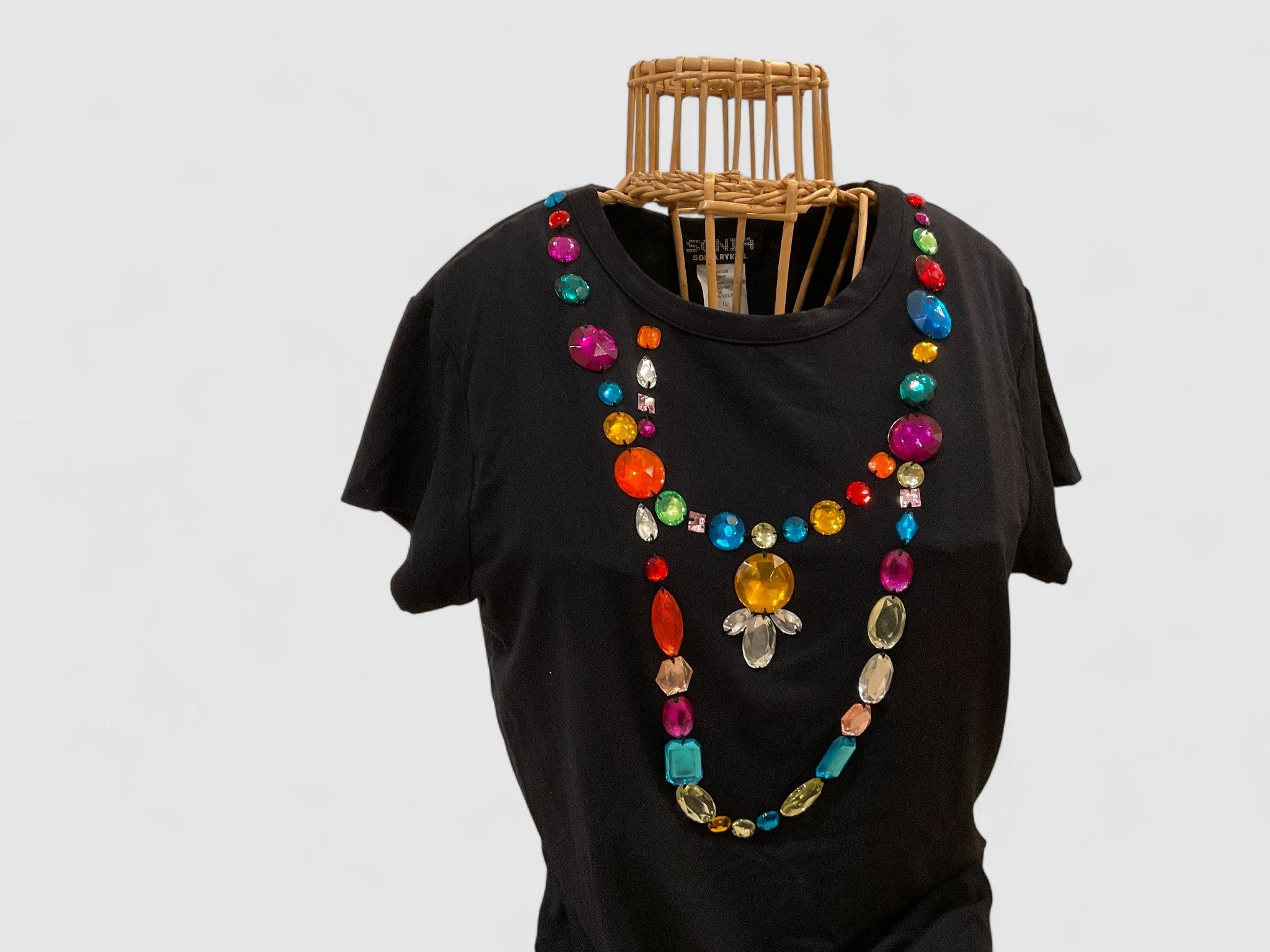 SONIA RYKIEL – PARIS TEE-SHIRT en coton noir orné de cabochons à facettes de différentes couleurs, format collier et sautoir ; Taille L