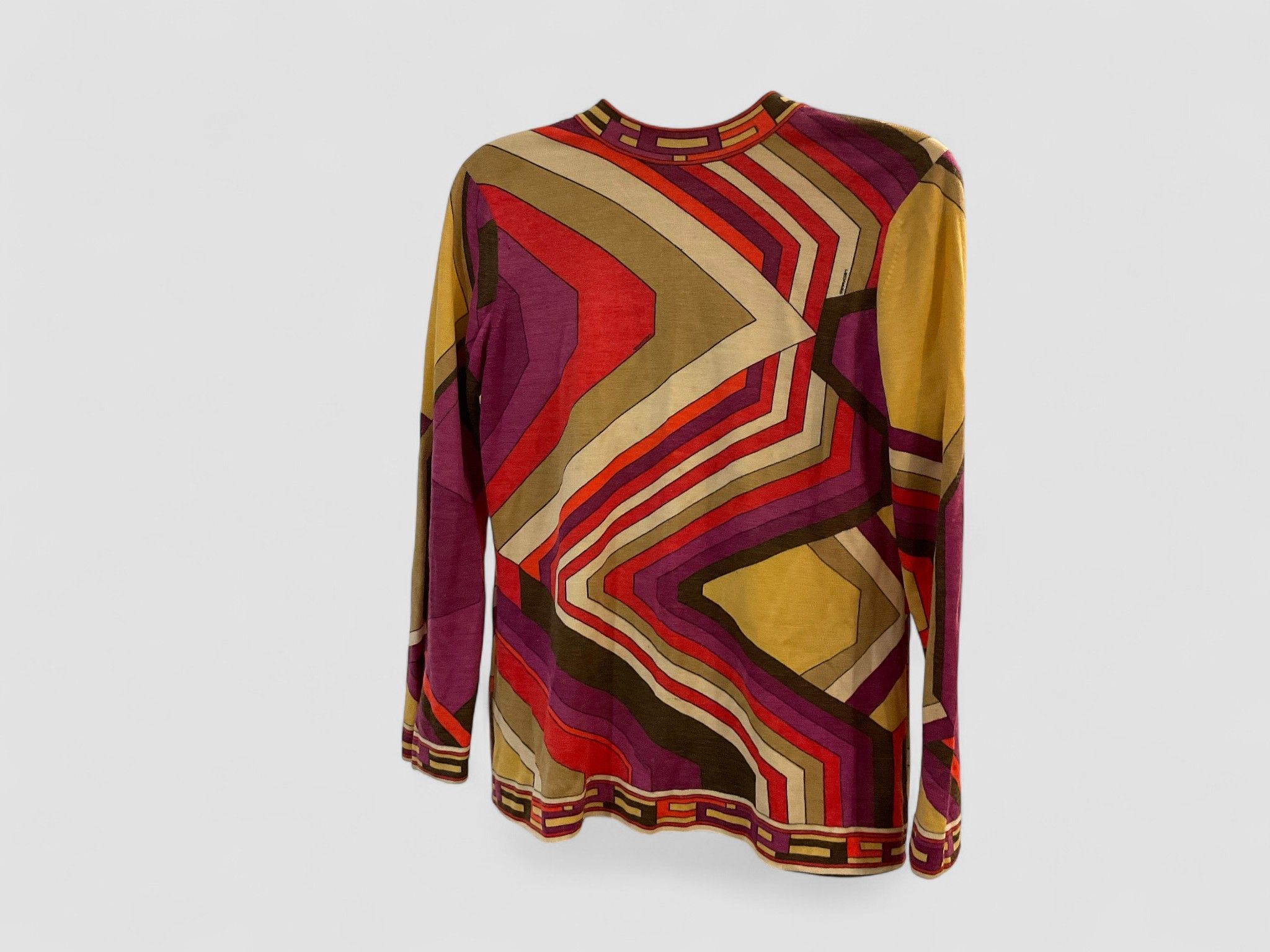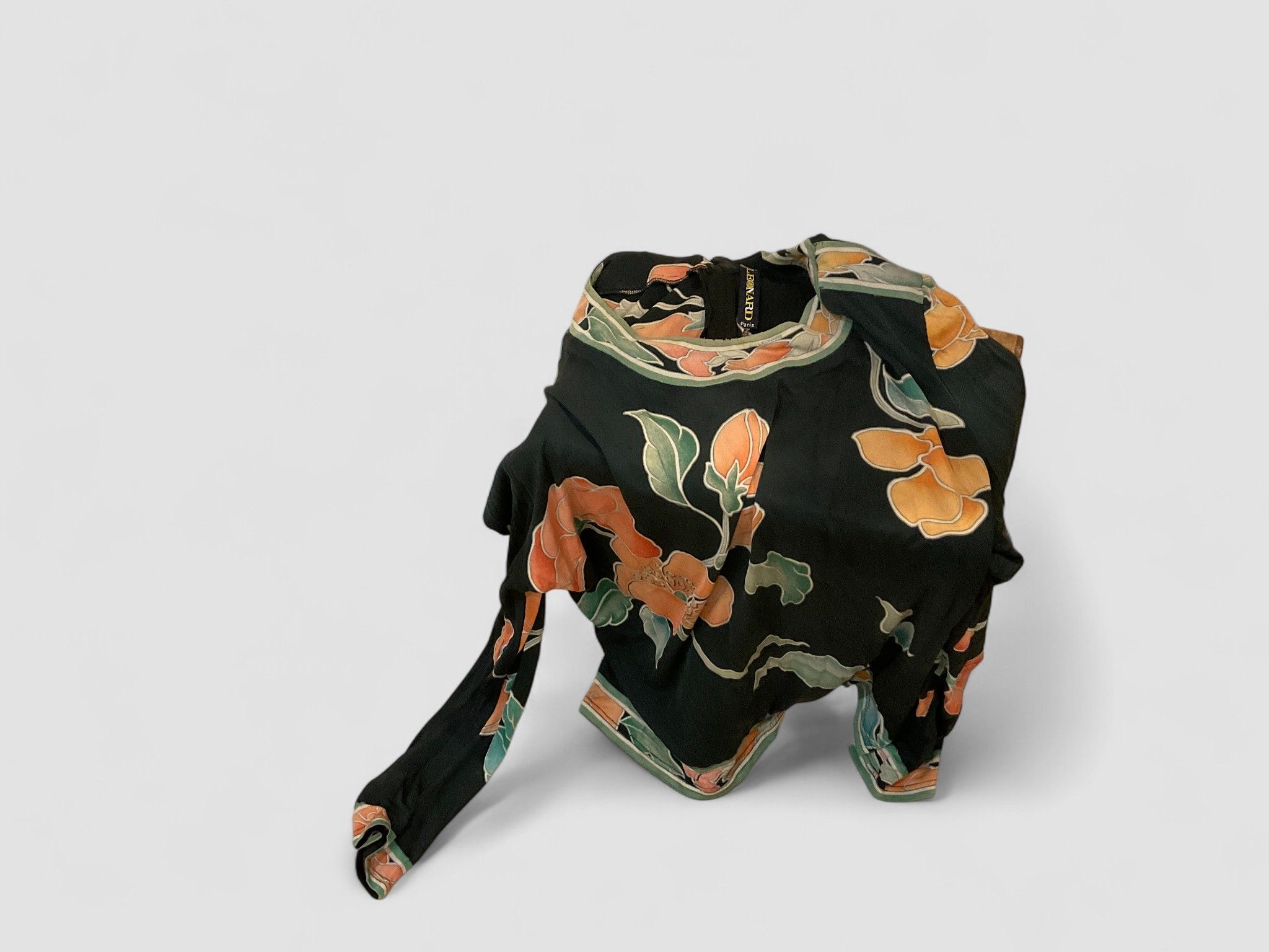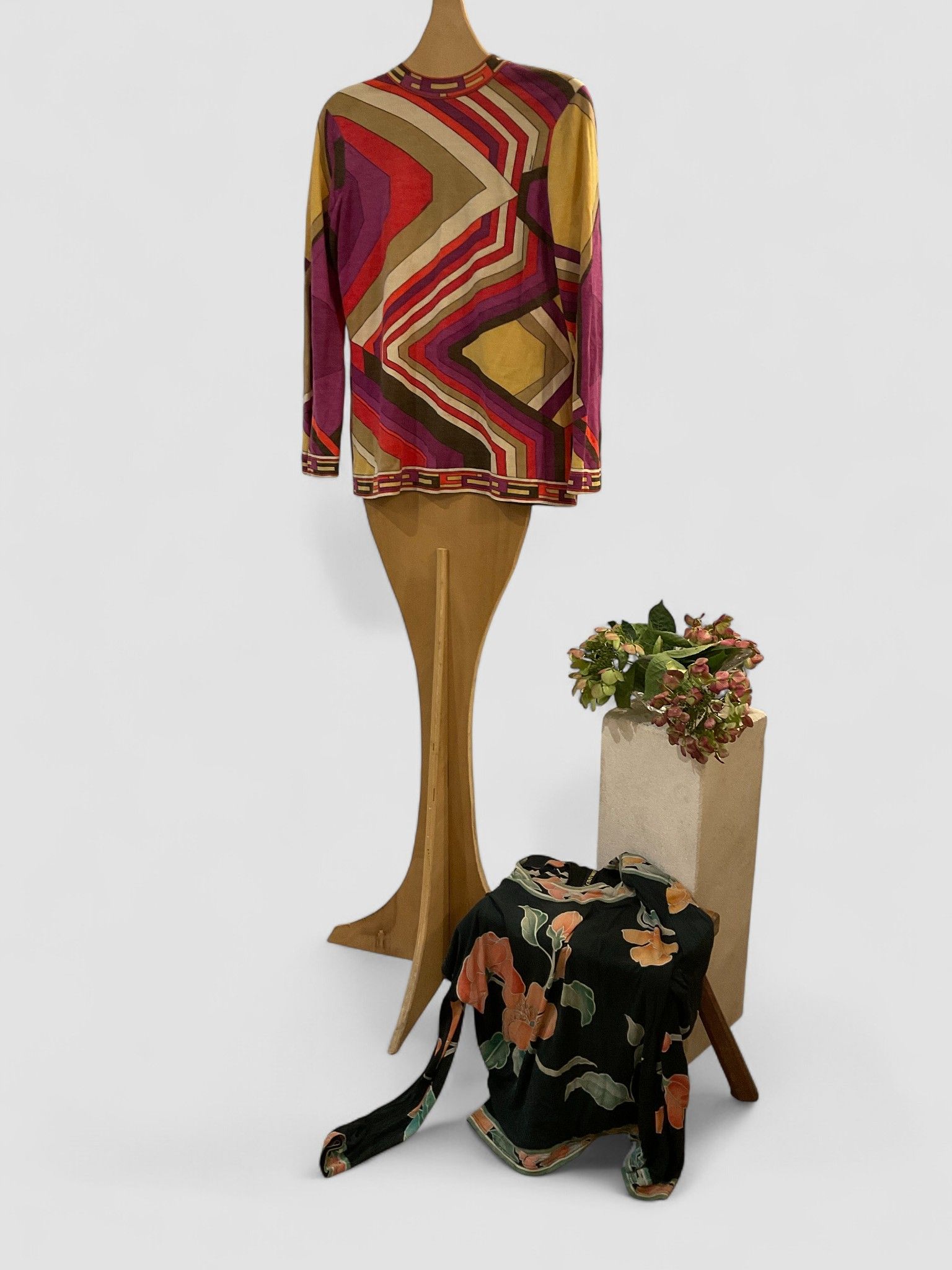 Léonard, vers 1970 Pull en maille, encolure ronde, motifs rayés à manches longues (Petits Acc.) On y joint une blouse « fleurs orangés » sur fond vert en viscose.