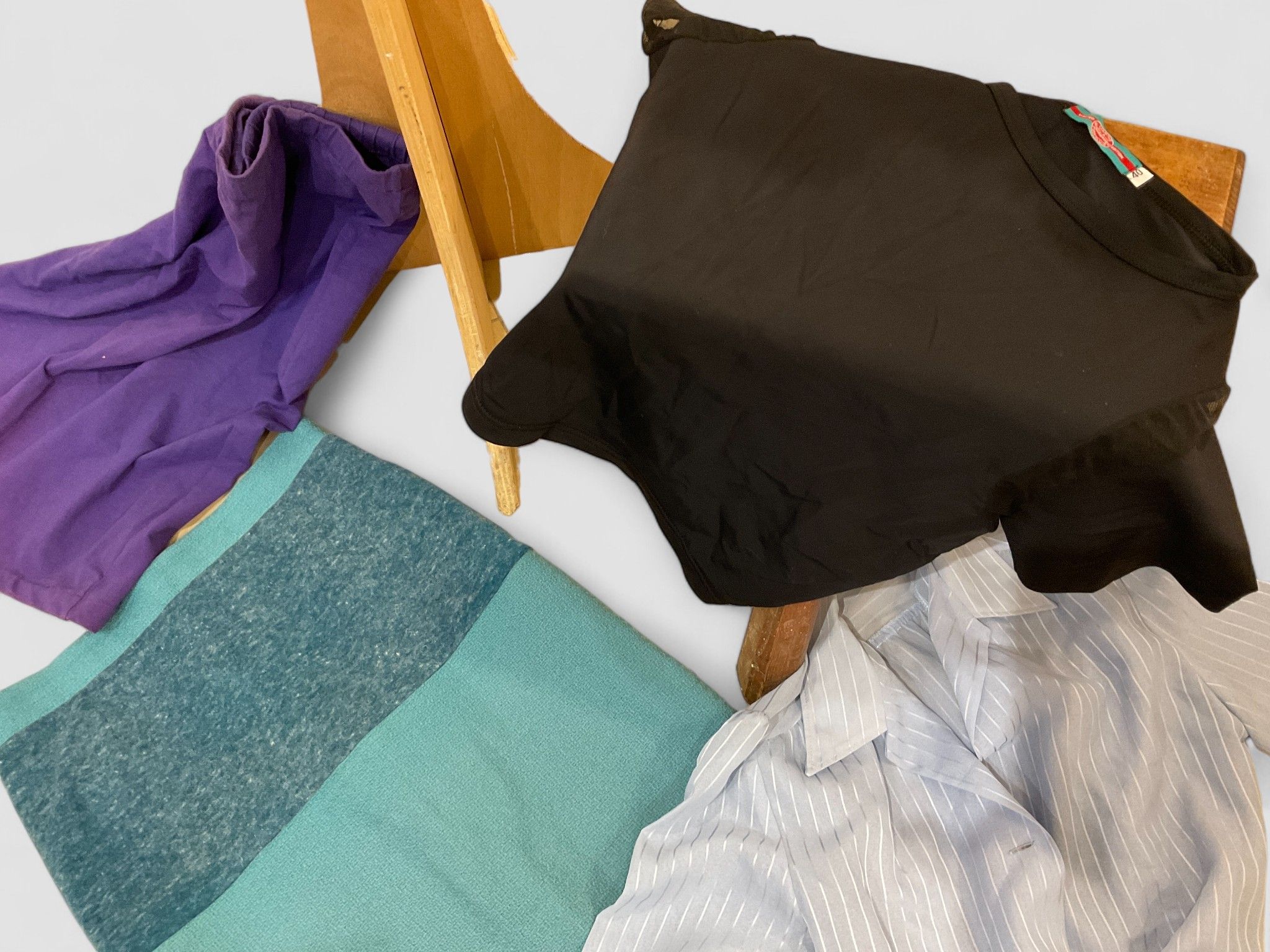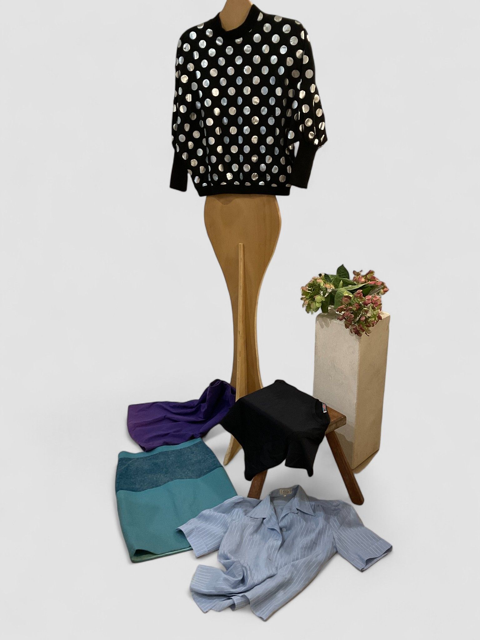 Cardin, Kenzo, Beneton, Girbaud Lot divers de vêtements, dont : Pierre Cardin : Une blouse tee-shirt en coton noir à pastilles argentées, manches bouffantes et chaussettes (tâches) ; Pierre Cardin Création : Un chemisier synthétique bleu ; Kenzo : Une jupe tee-shirt violette ; Benetton : Une jupe droite en laine bleue ; Marithé + François Girbaud : Un tee-shirt en lycra noir Taille 38
