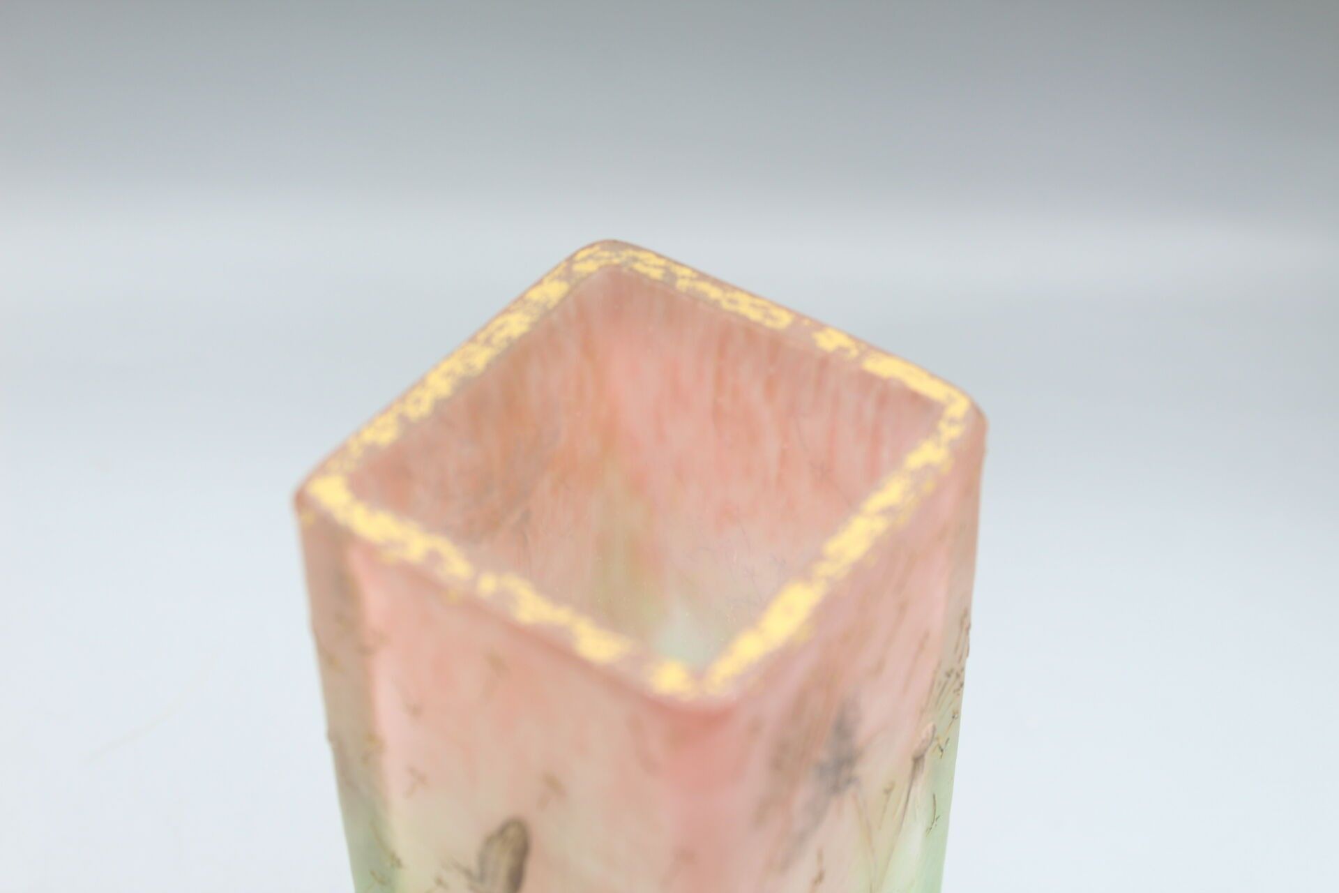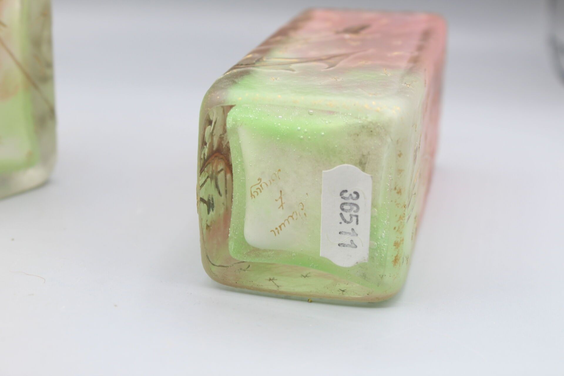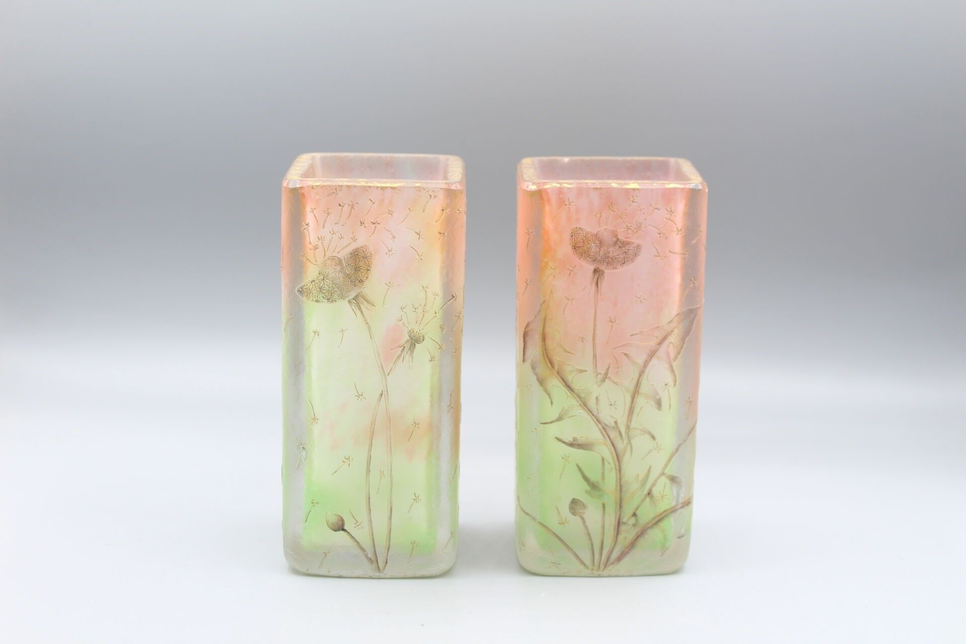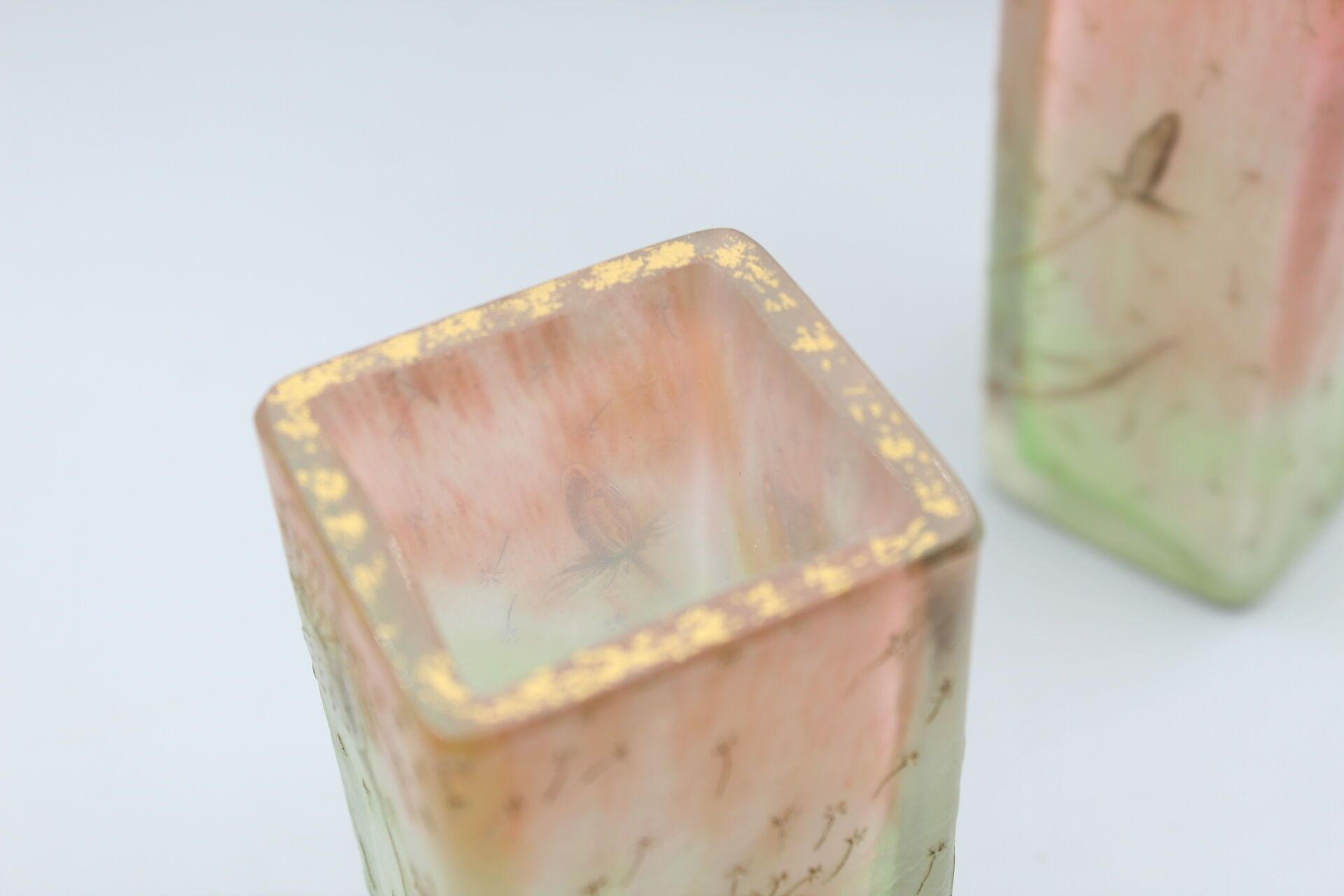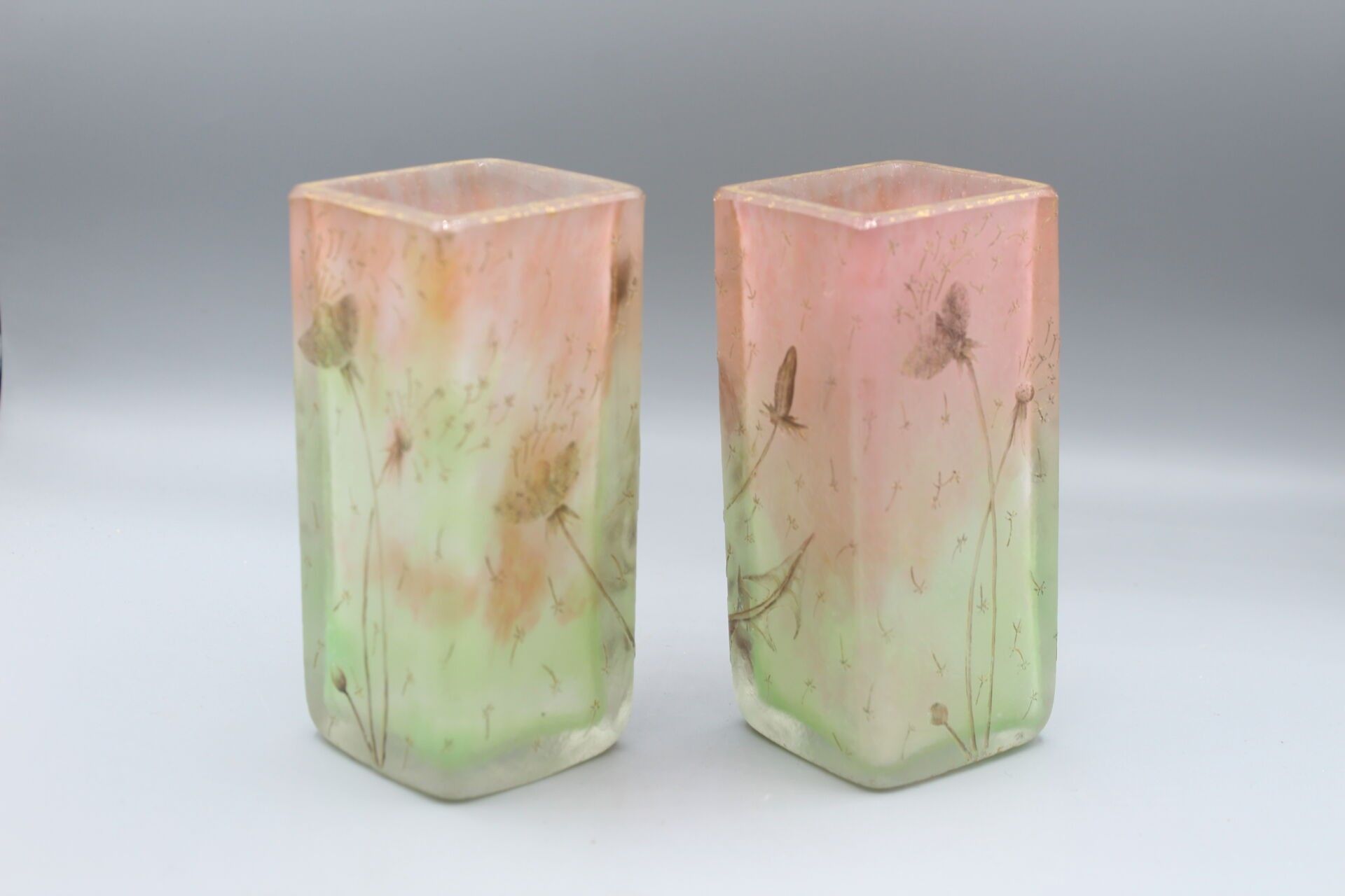 DAUM NANCY Paire de vases de section carrée à fond vert et rose à décor dégagé à l'acide émaillé doré de pissenlits H. 12 cm signé sous la base