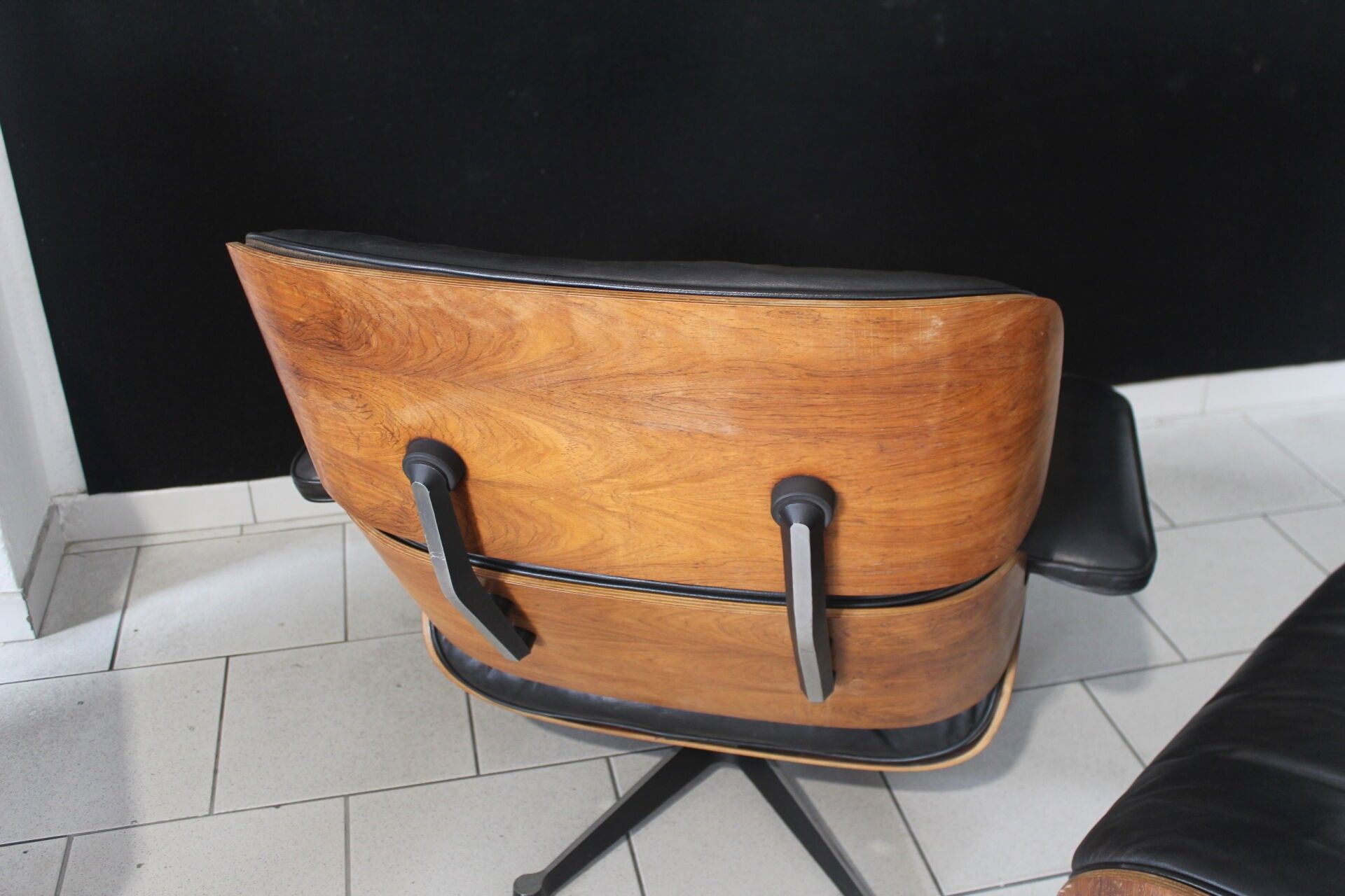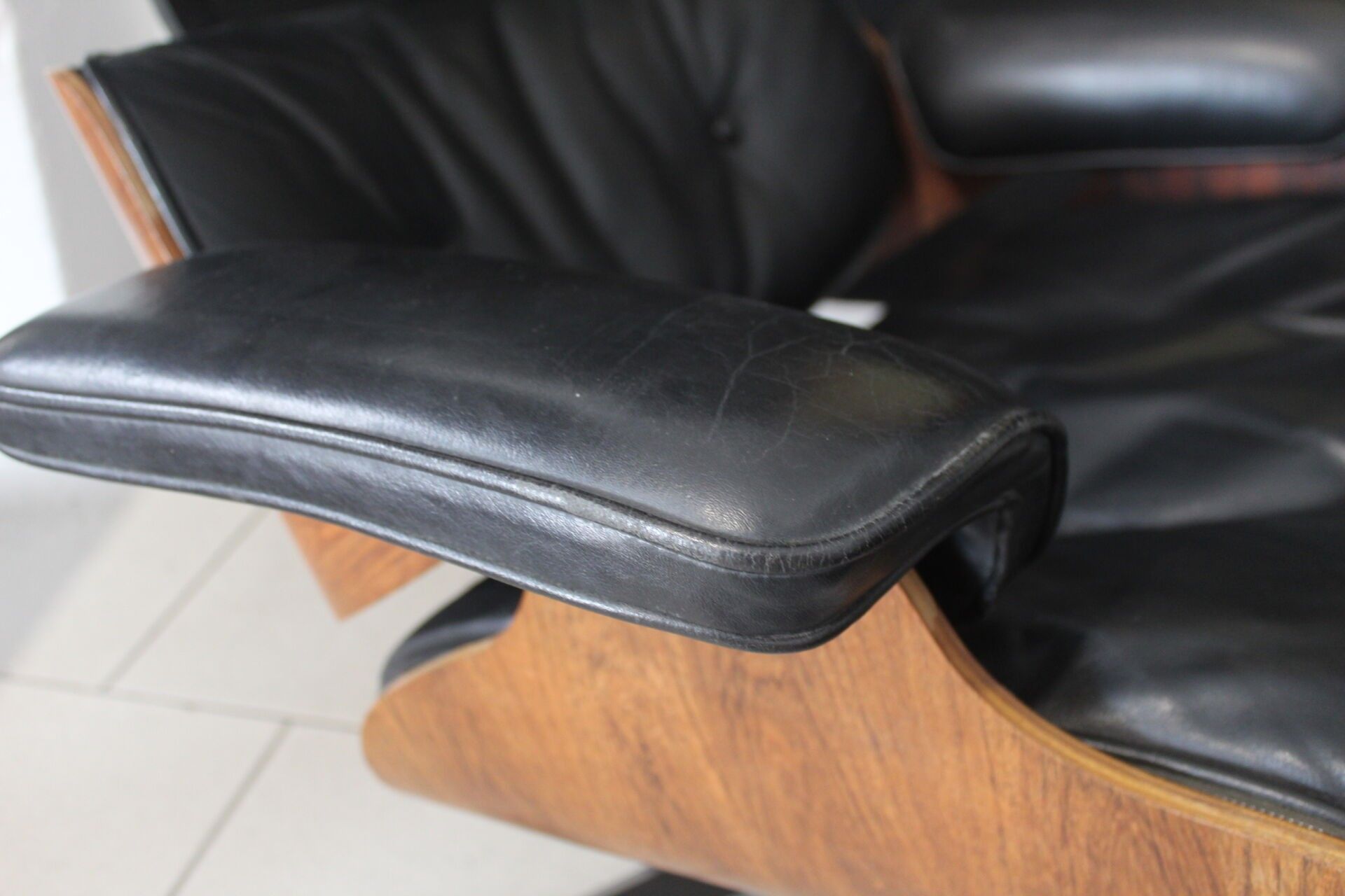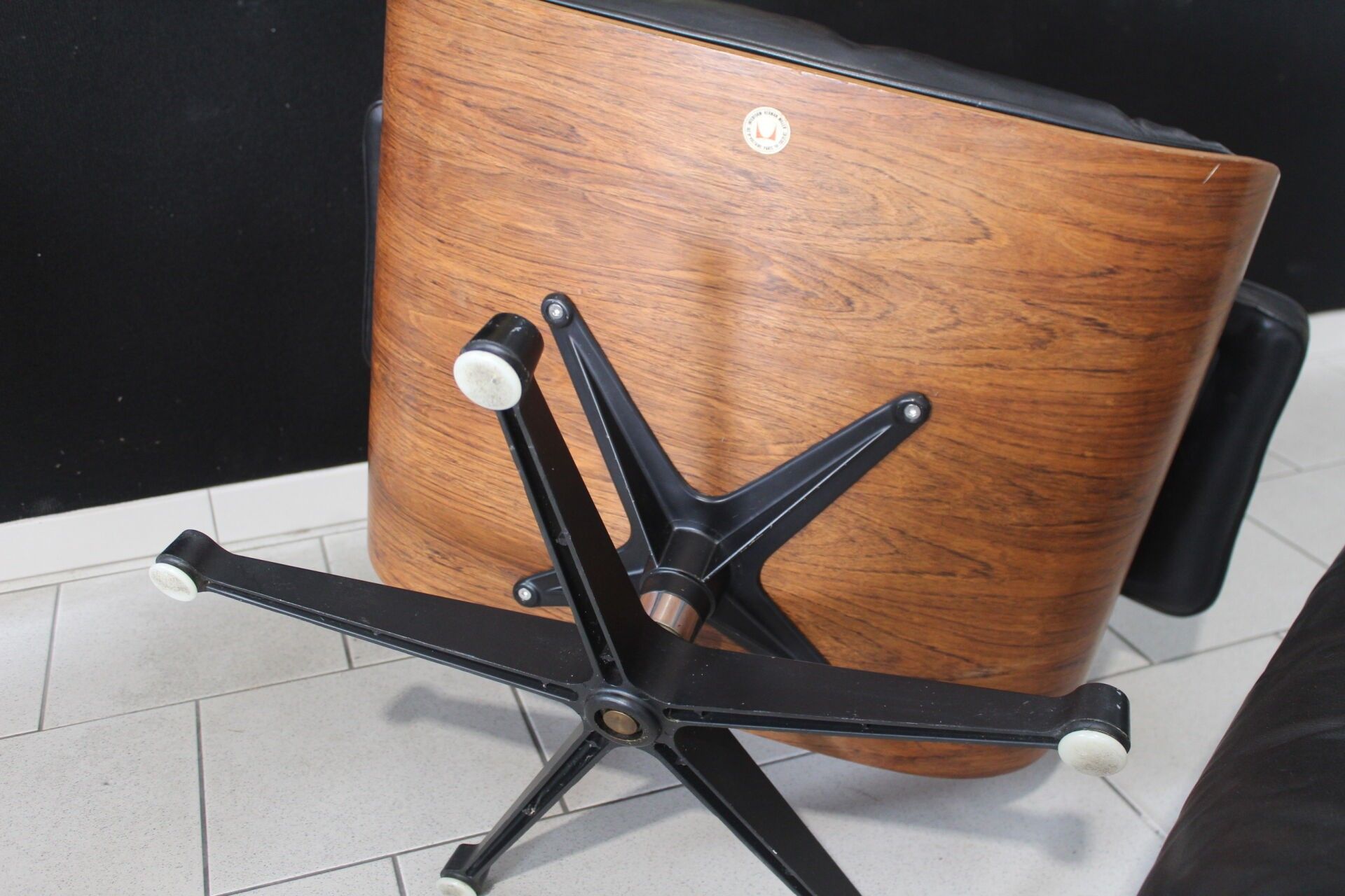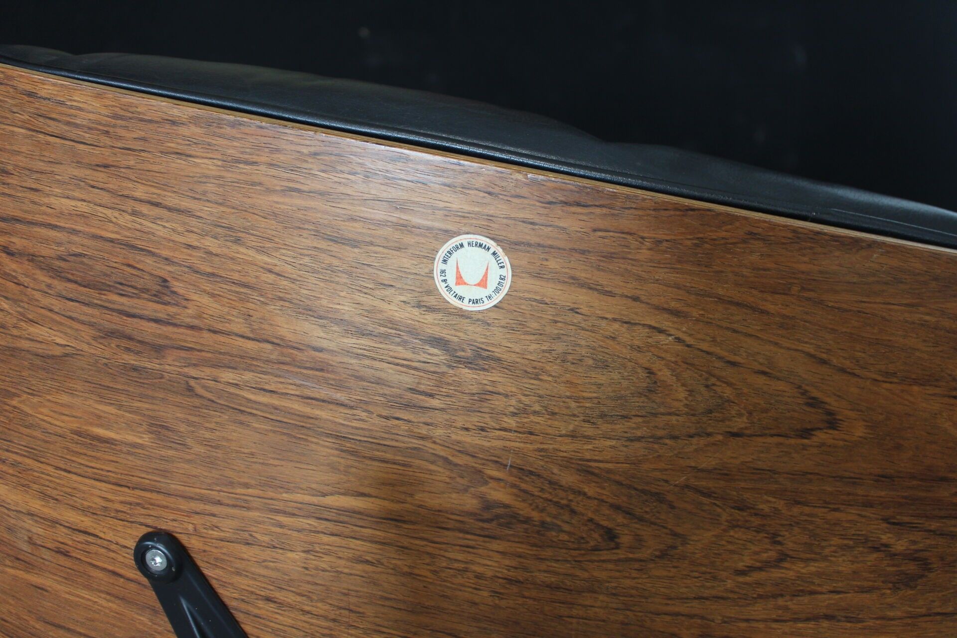 Charles (1907-1978) & Ray EAMES (1912-1988). Editeur Interform Herman Miller Paris. « Lounge chair » modèles 670 671 créés en 1956. Fauteuil et son ottoman, coque en palissandre lamellé-collé, garniture de cuir noir capitonné, siège porte la pastille circulaire d'éditeur INTERFORM Hermann MILLER, trace de la pastille sous l'ottoman, état d'usage.