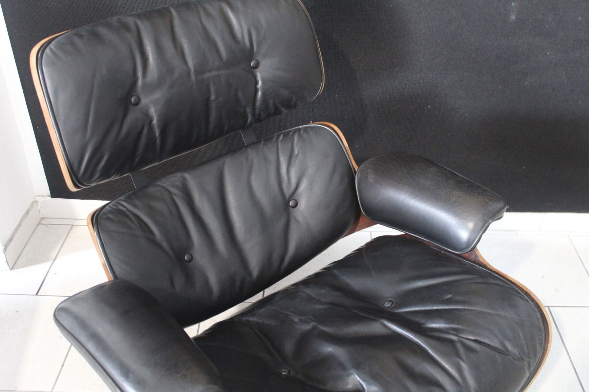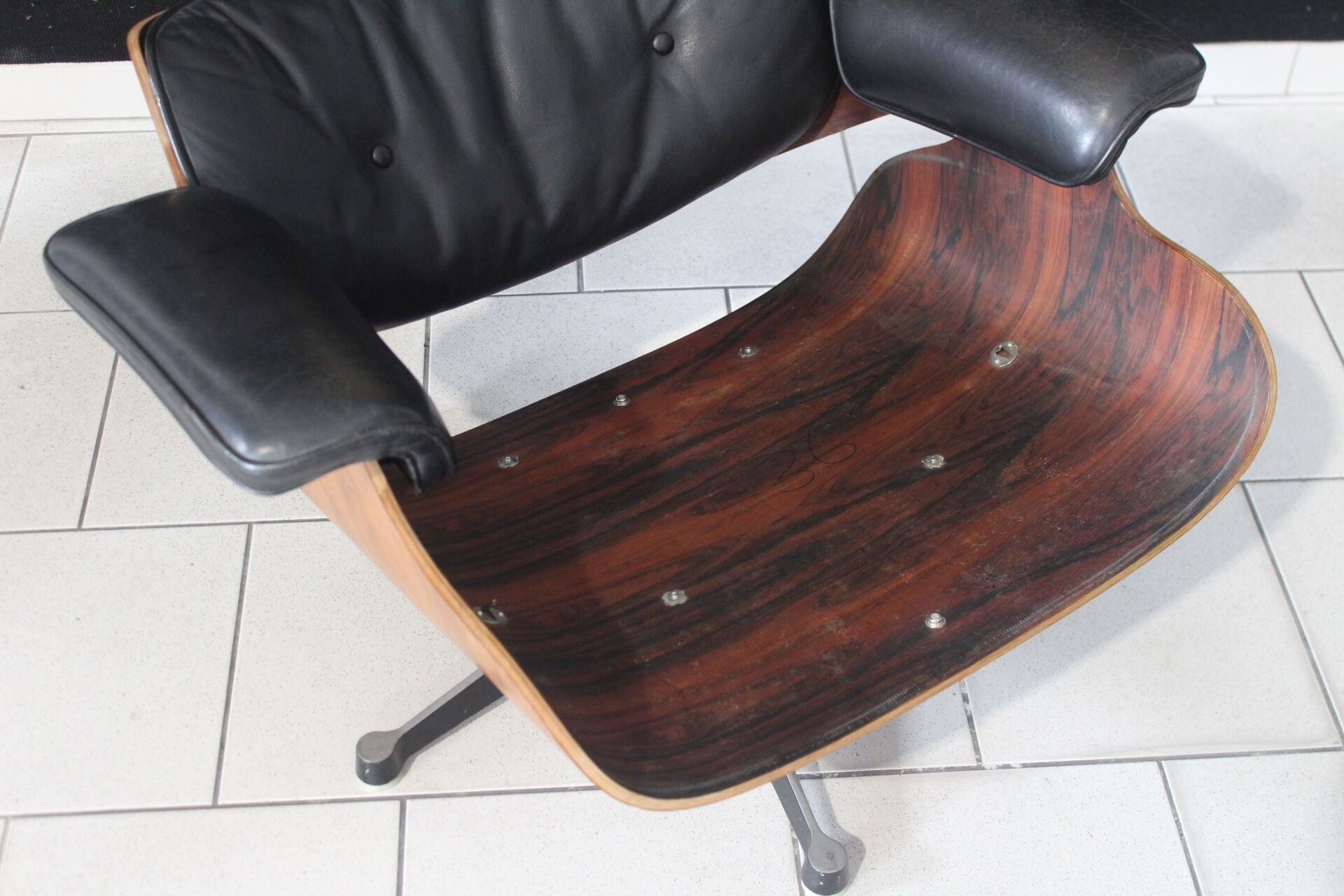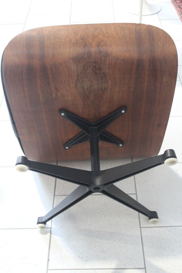 Charles (1907-1978) & Ray EAMES (1912-1988). Editeur Interform Herman Miller Paris. « Lounge chair » modèles 670 671 créés en 1956. Fauteuil et son ottoman, coque en palissandre lamellé-collé, garniture de cuir noir capitonné, siège porte la pastille circulaire d'éditeur INTERFORM Hermann MILLER, trace de la pastille sous l'ottoman, état d'usage.