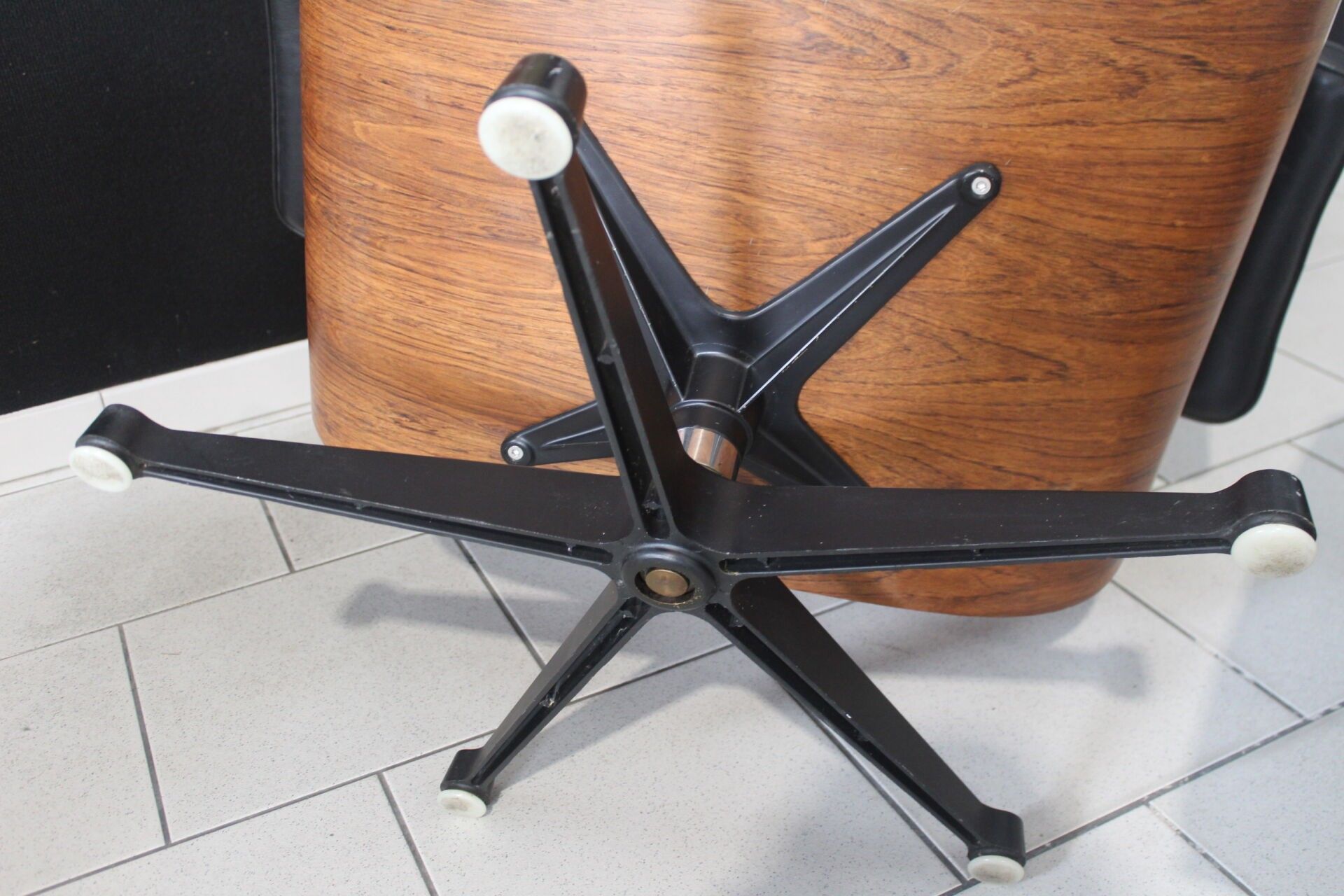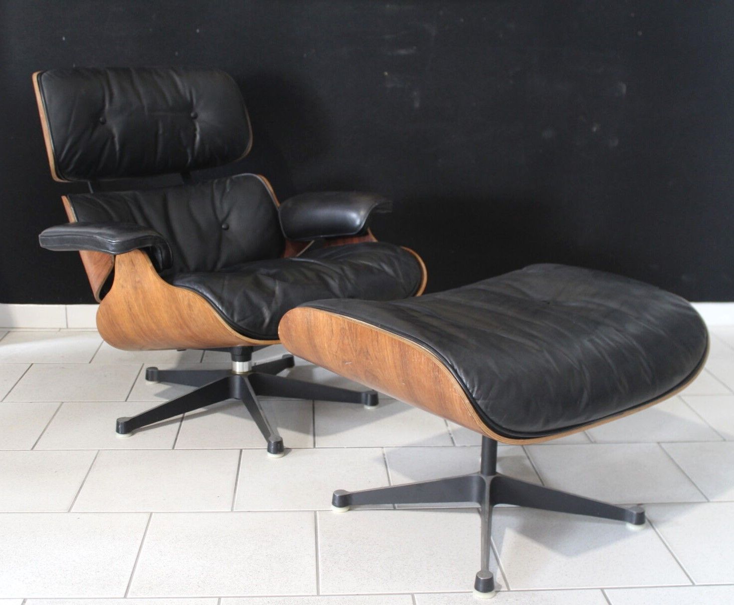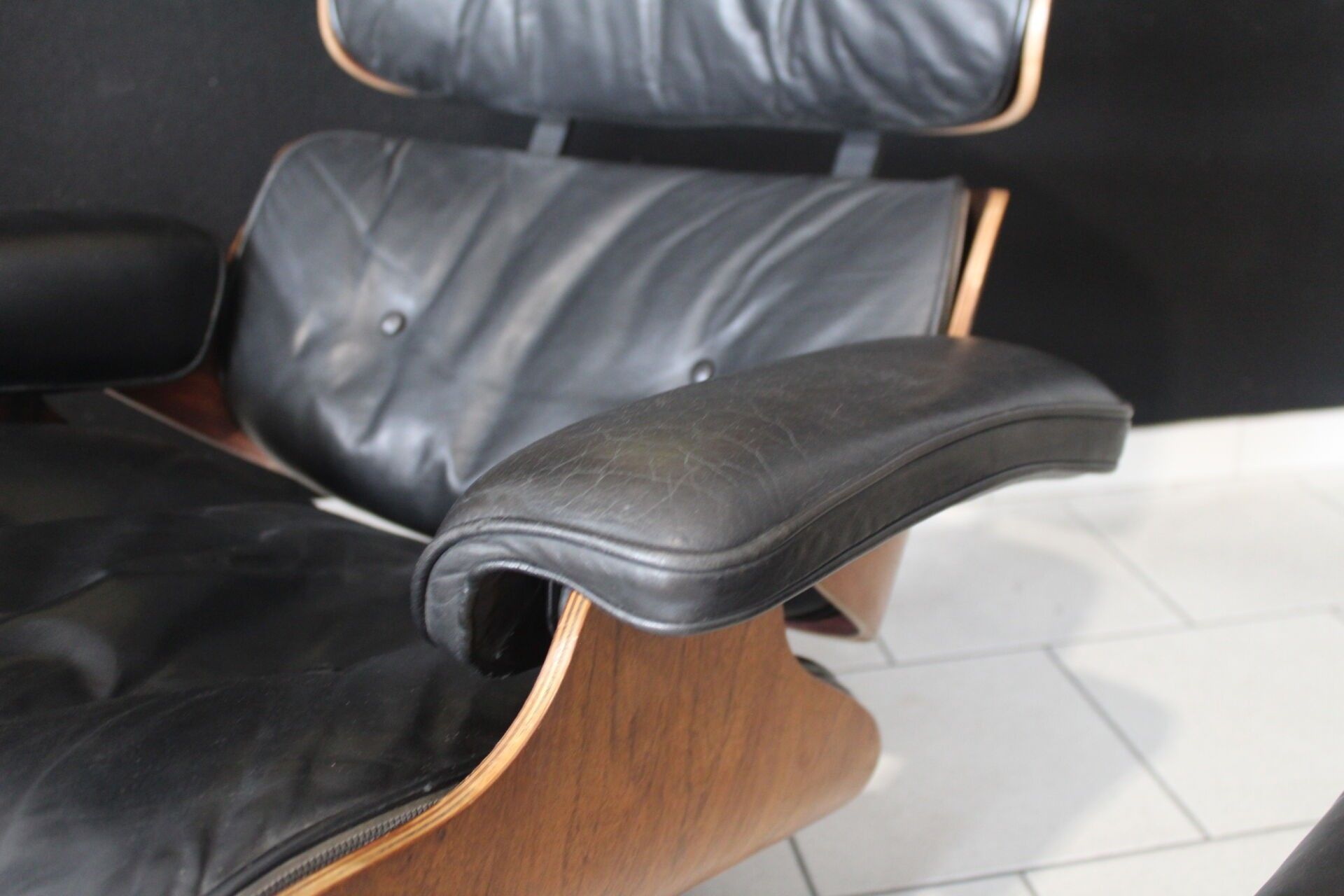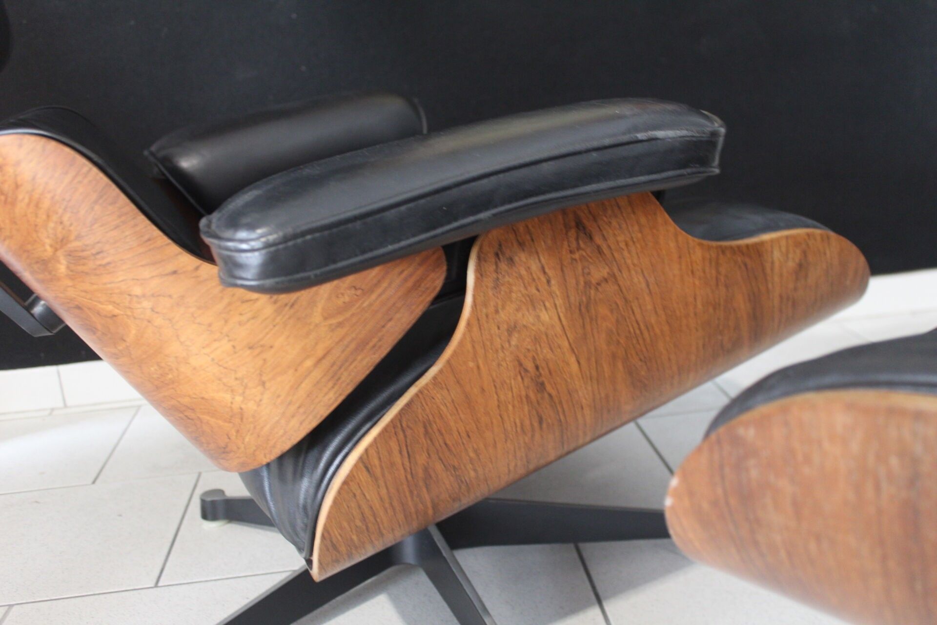 Charles (1907-1978) & Ray EAMES (1912-1988). Editeur Interform Herman Miller Paris. « Lounge chair » modèles 670 671 créés en 1956. Fauteuil et son ottoman, coque en palissandre lamellé-collé, garniture de cuir noir capitonné, siège porte la pastille circulaire d'éditeur INTERFORM Hermann MILLER, trace de la pastille sous l'ottoman, état d'usage.