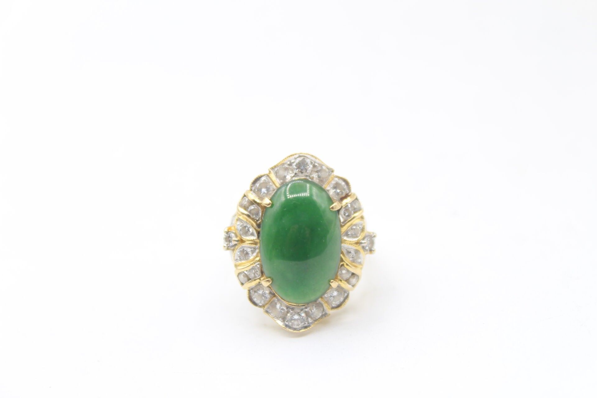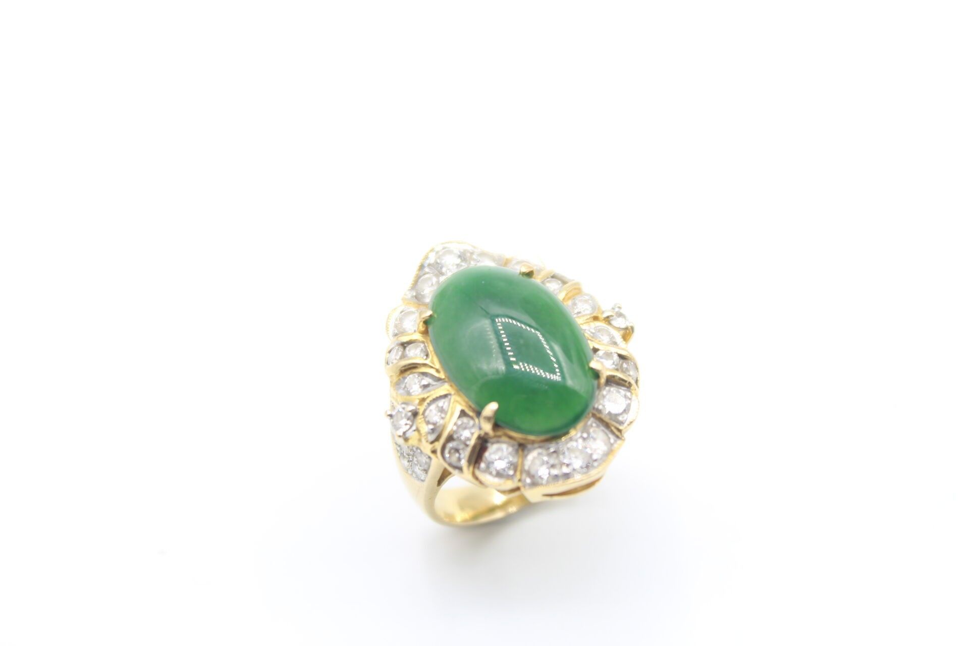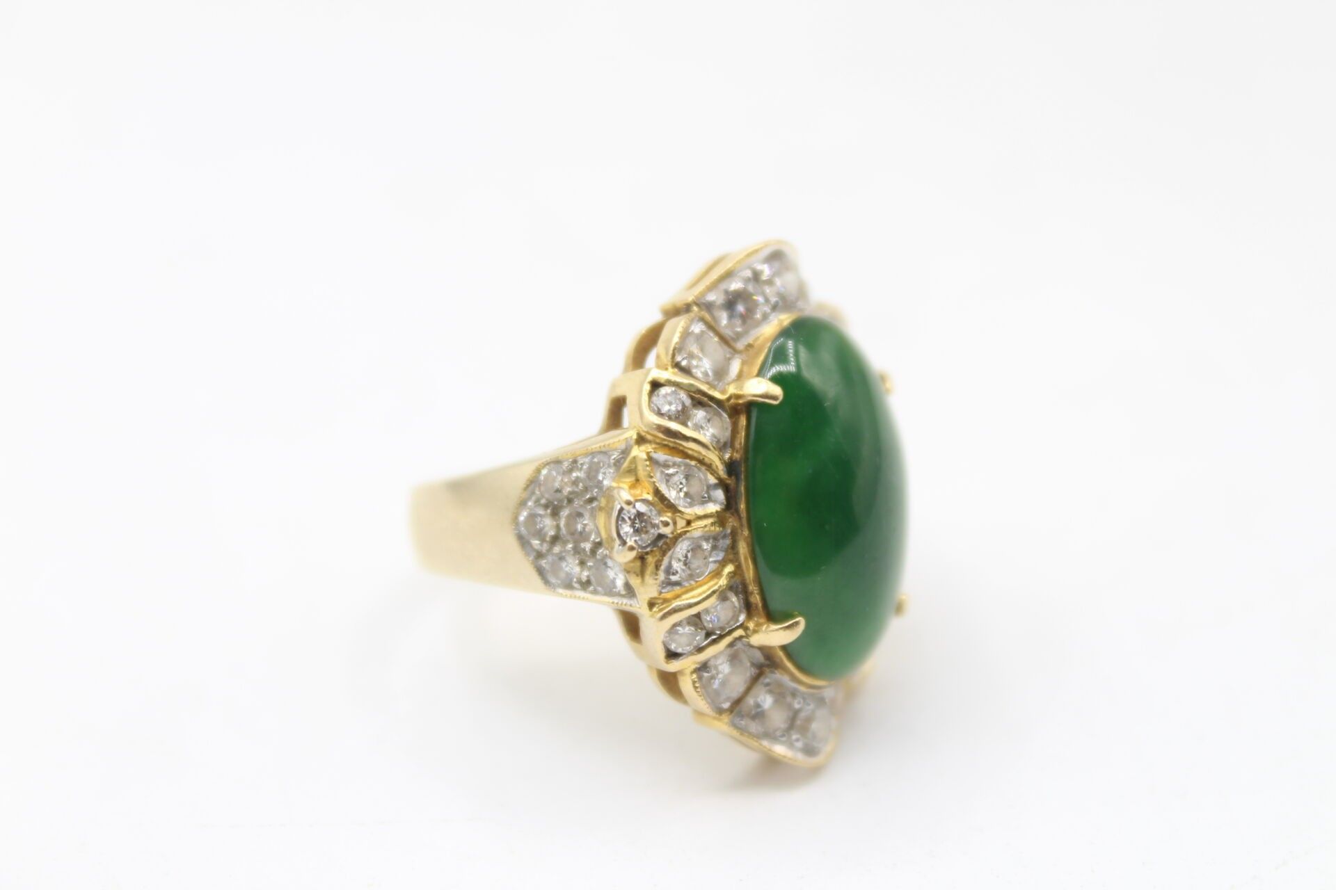 Importante bague en or jaune 750°°° ornée d'un jade en cabochon (16.9 x 10.8m) entourage de diamants poids brut: 10.62g Marque LS et numéroté 150670 TDD 53 - LES BIJOUX, OBJETS ET EFFETS PRECIEUX NE SONT JAMAIS CONSERVES A L'ETUDE MAIS DANS DES COFFRES BANCAIRES
