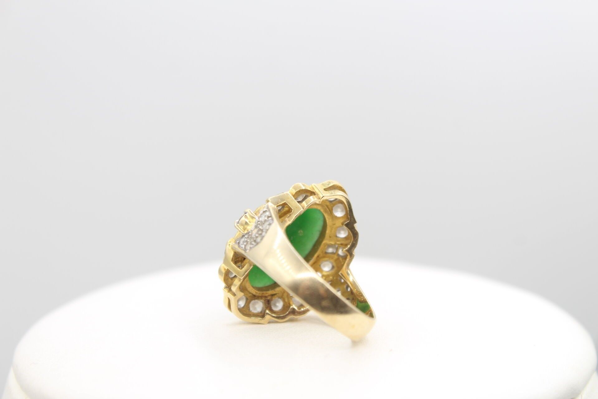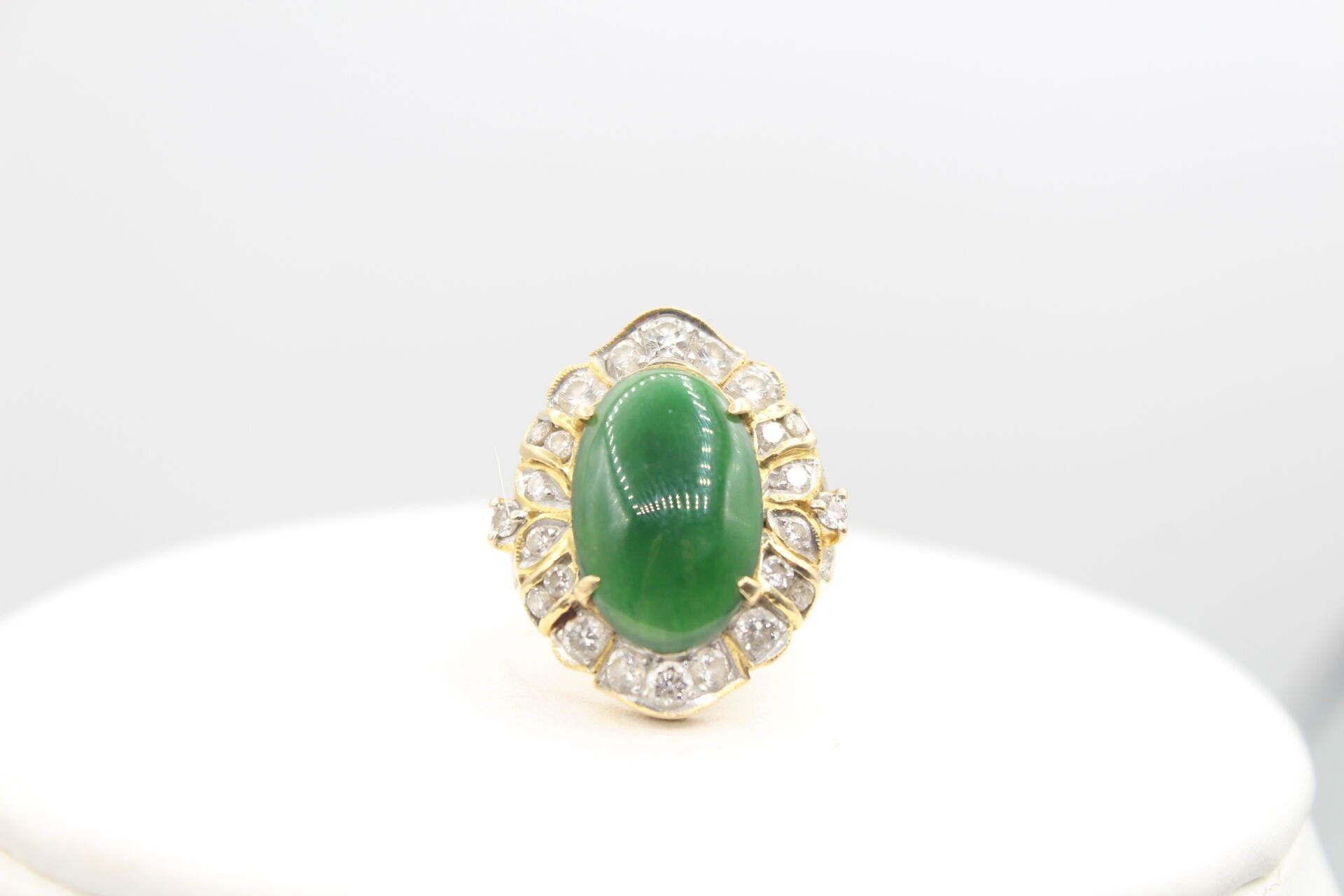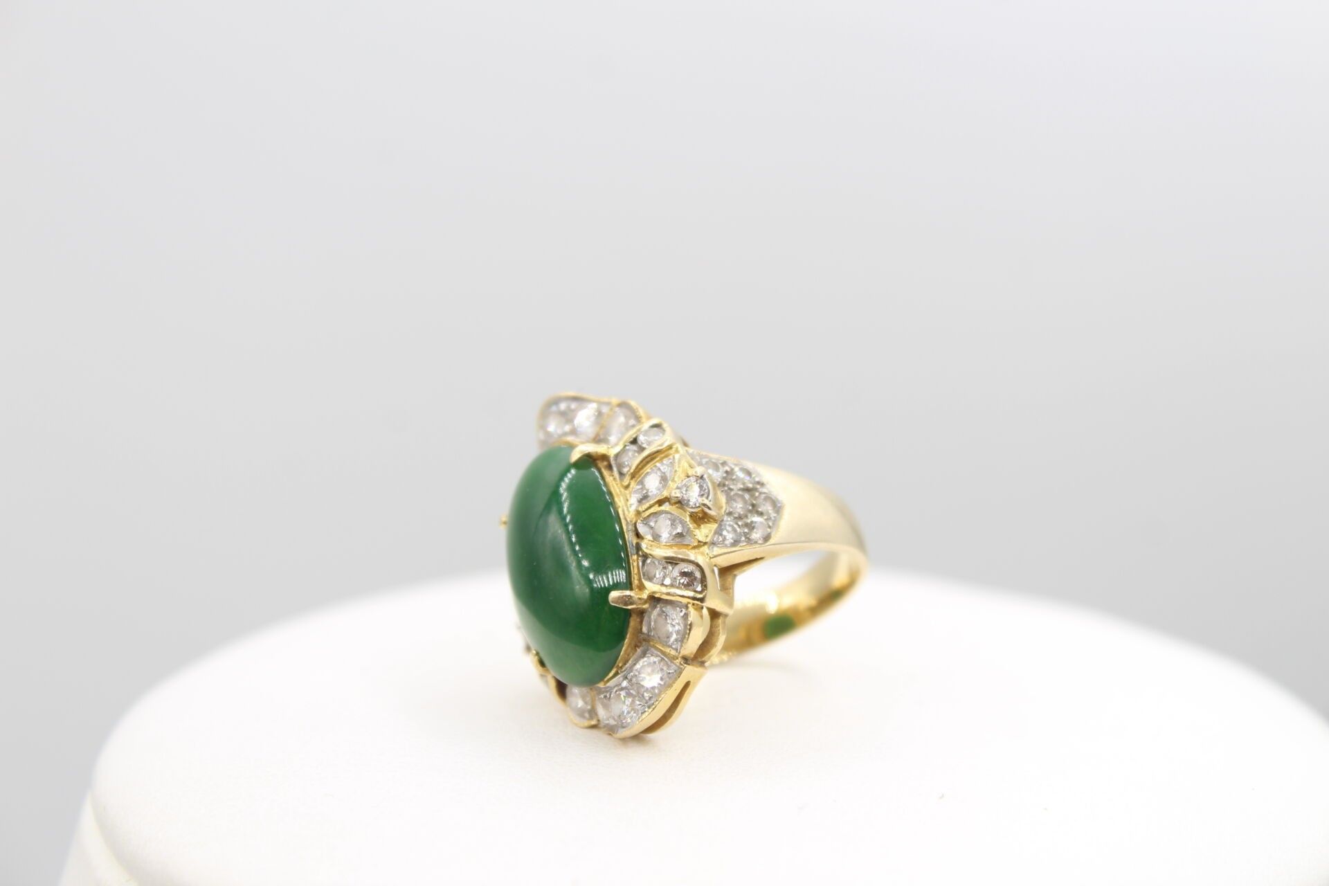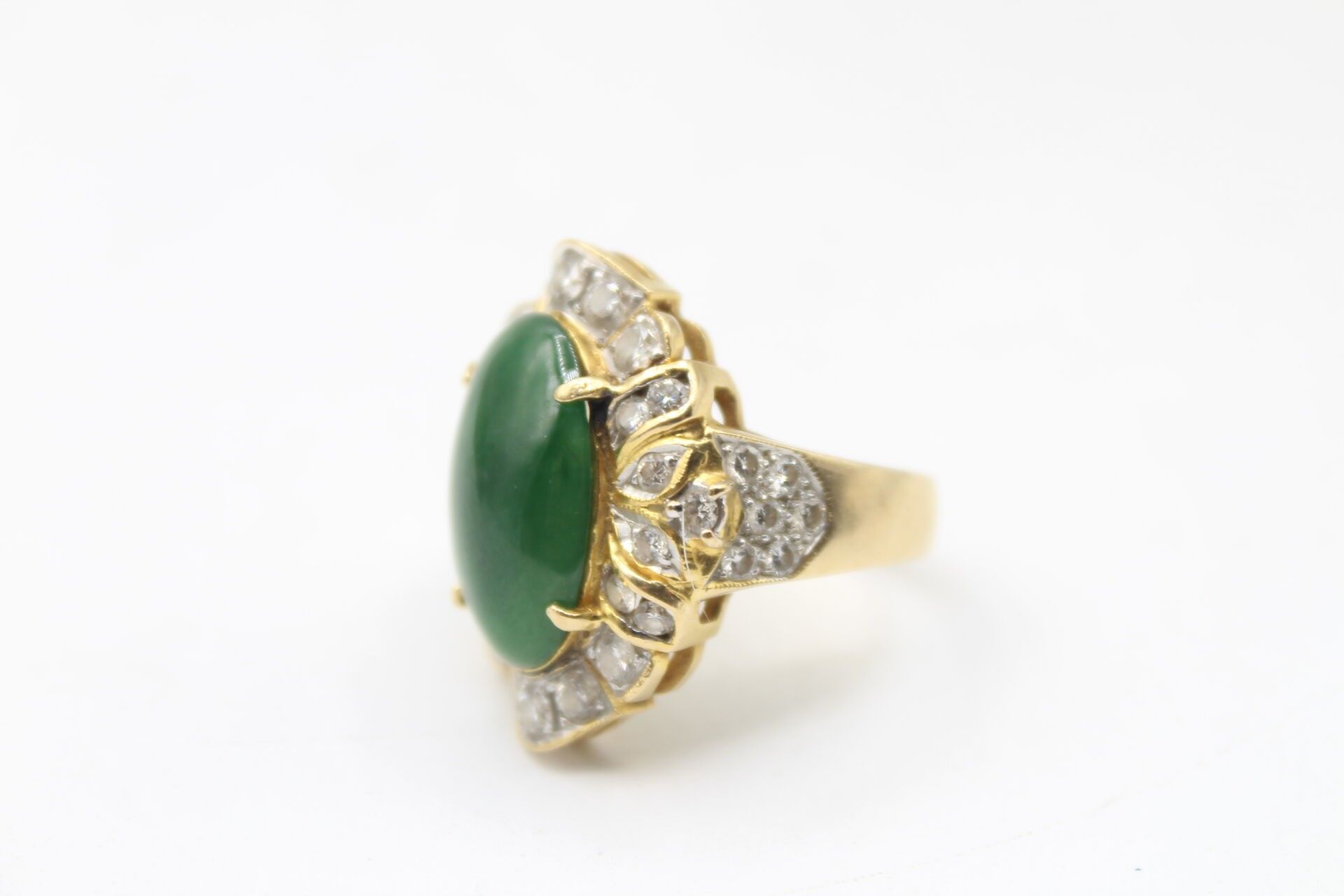 Importante bague en or jaune 750°°° ornée d'un jade en cabochon (16.9 x 10.8m) entourage de diamants poids brut: 10.62g Marque LS et numéroté 150670 TDD 53 - LES BIJOUX, OBJETS ET EFFETS PRECIEUX NE SONT JAMAIS CONSERVES A L'ETUDE MAIS DANS DES COFFRES BANCAIRES