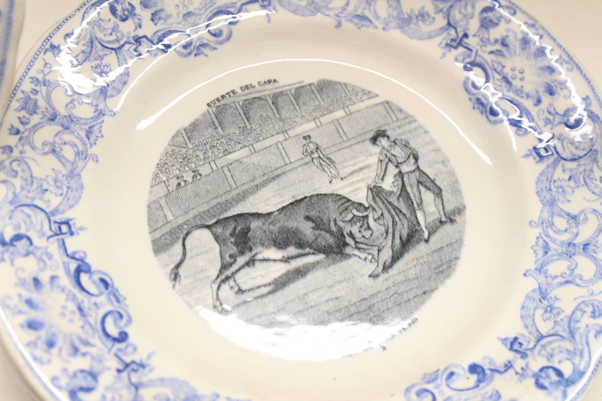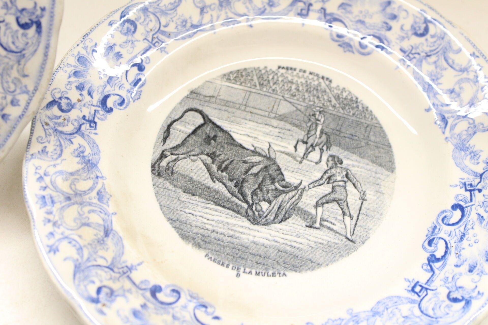 Suite de 6 assiettes à message sur le thème de la Tauromachie en faïence fine