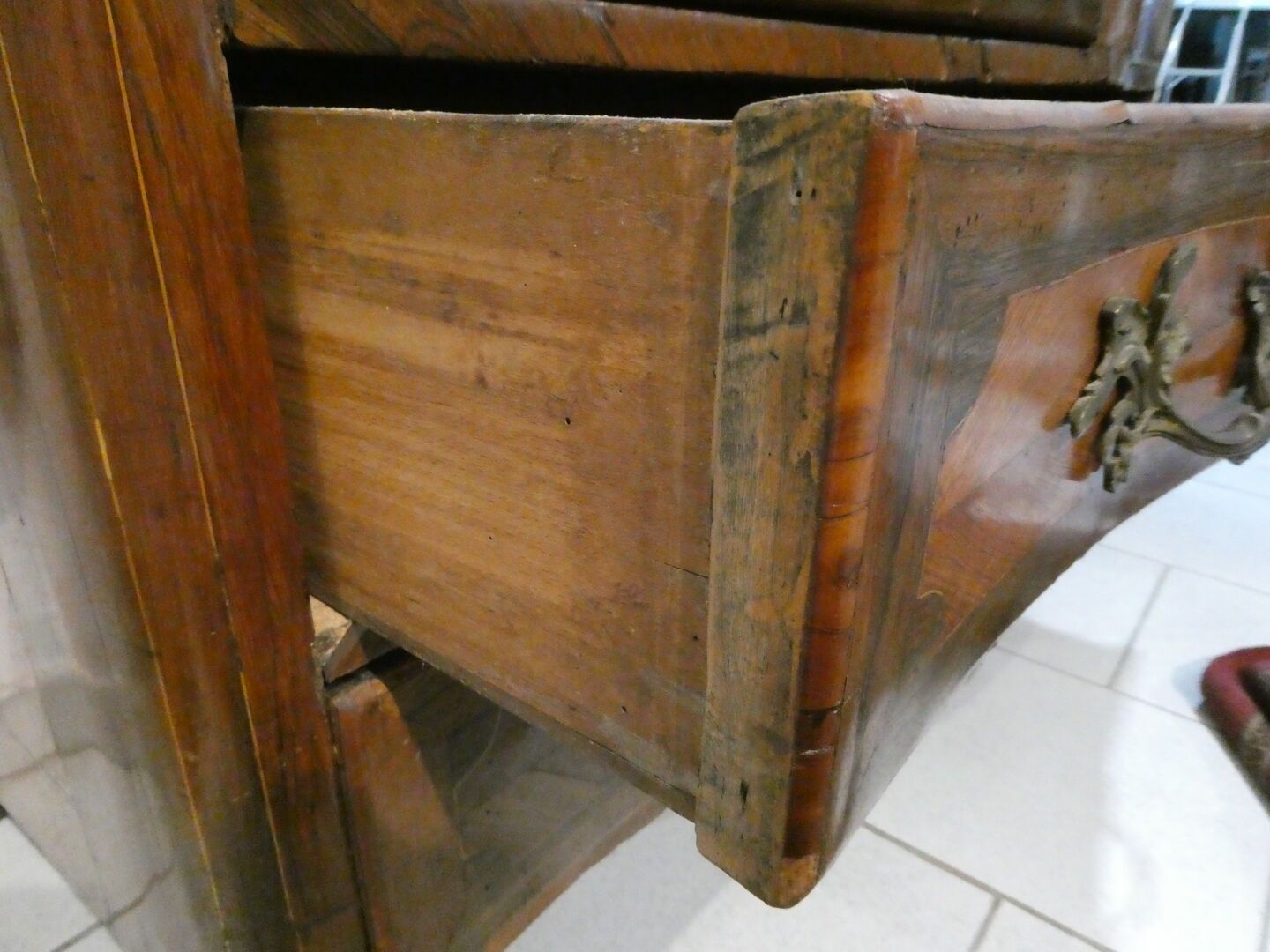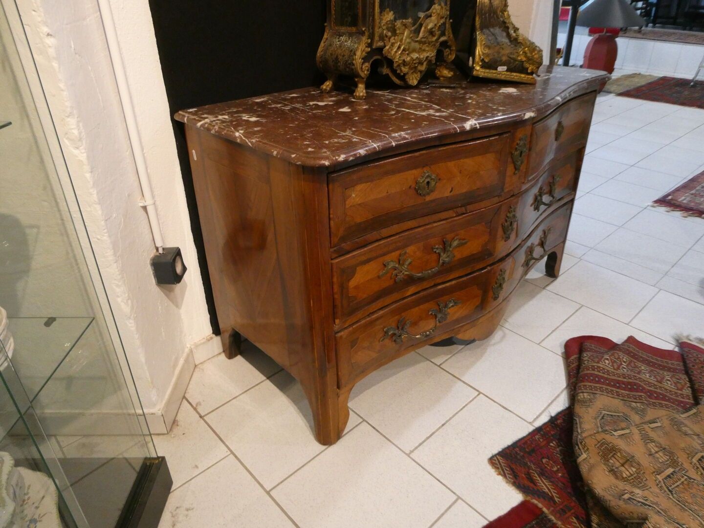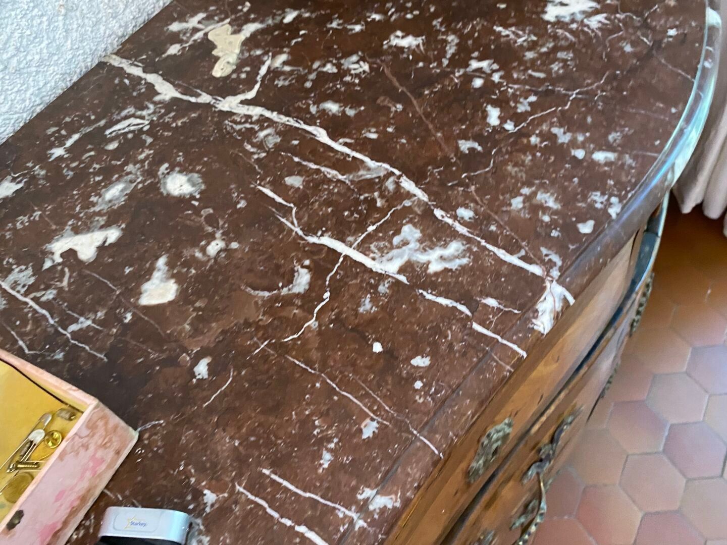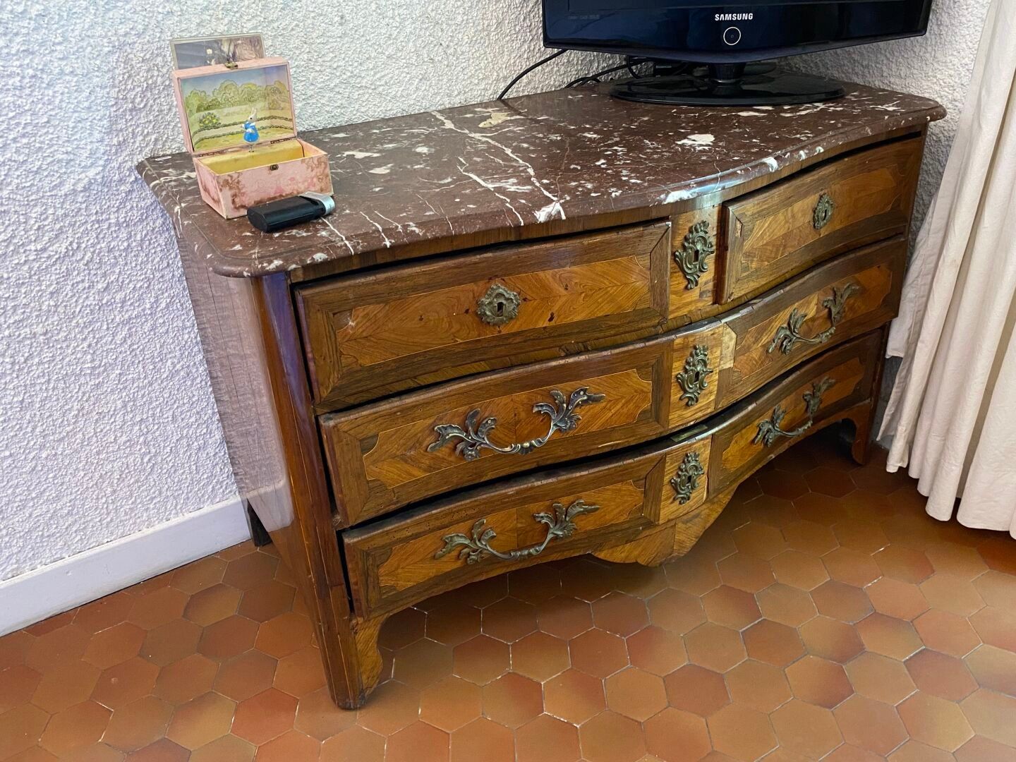 Commode début XVIII en placage ouvrant par quatre tiroirs, plateau de marbre rouge du Languedoc, garnitures de bronze (garnitures manquantes), 80 x 127 x 62, restaurations anciennes et accidents, éclats, trous d'envol