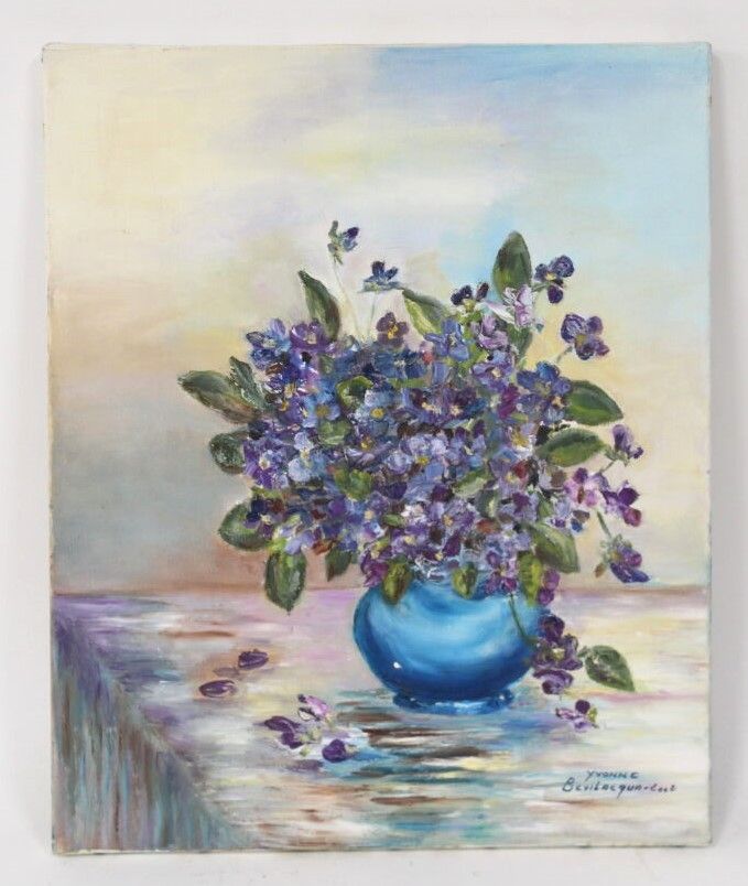 Yvonne BEVILACQUA (1924-2013) Bouquet de violettes Elève du Professeur MARKOOF durant 5 ans à Tunis Huile sur toile Signé en bas à droite Yvonne BEVILACQUA - 2002 38 x 46 cm