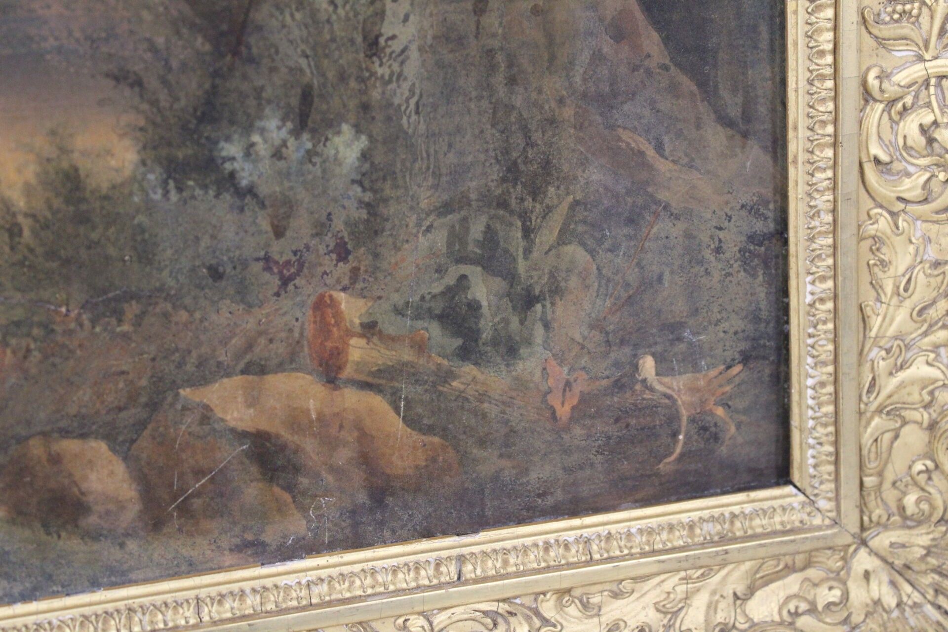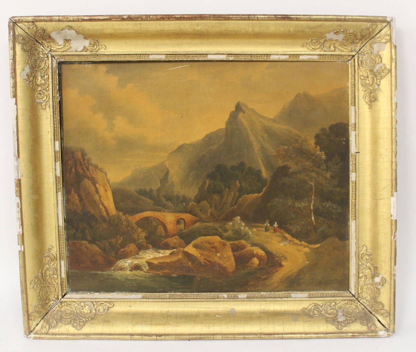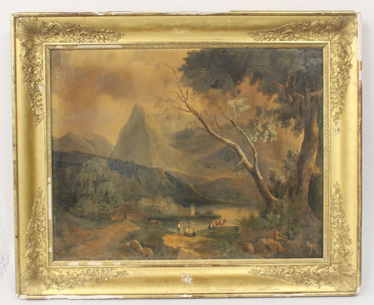 Ecole française XIXe. Scène animée de personnages au bord de lac de montagne. Deux huiles sur toiles. 50 x 64 cm et 46 x 57 cm. Non signée. Ancien vernis jauni, manques au stuc du cadre
