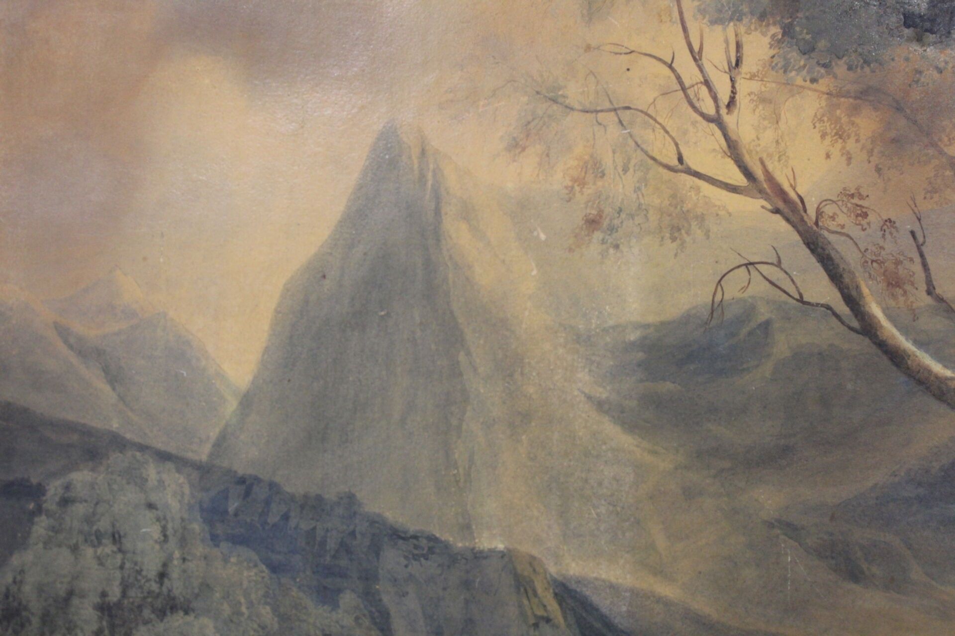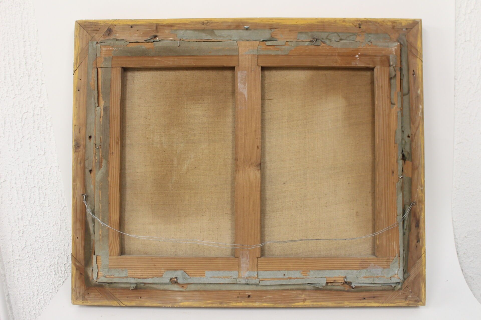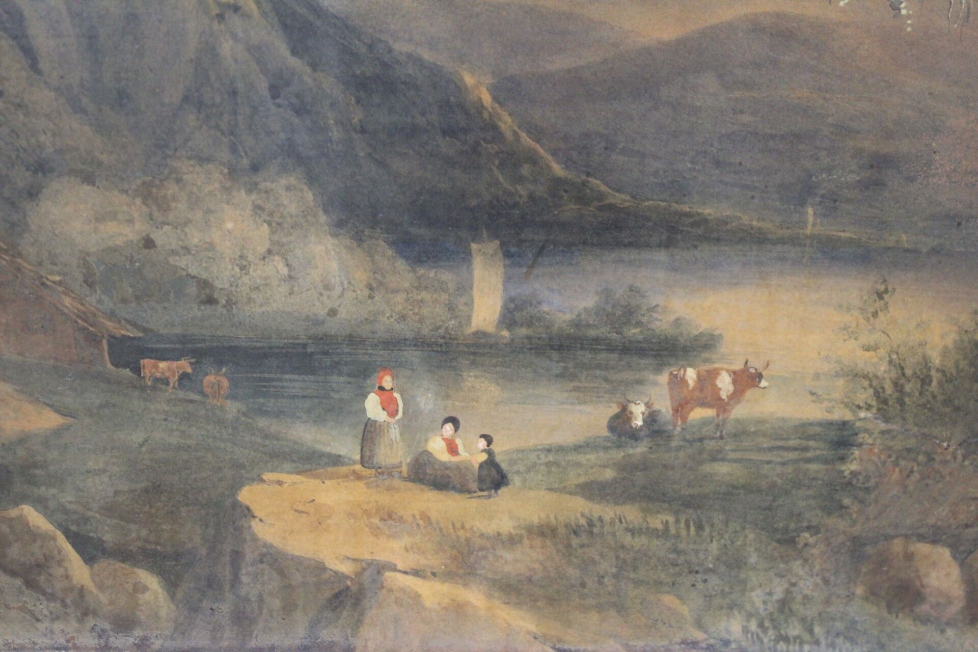 Ecole française XIXe. Scène animée de personnages au bord de lac de montagne. Deux huiles sur toiles. 50 x 64 cm et 46 x 57 cm. Non signée. Ancien vernis jauni, manques au stuc du cadre