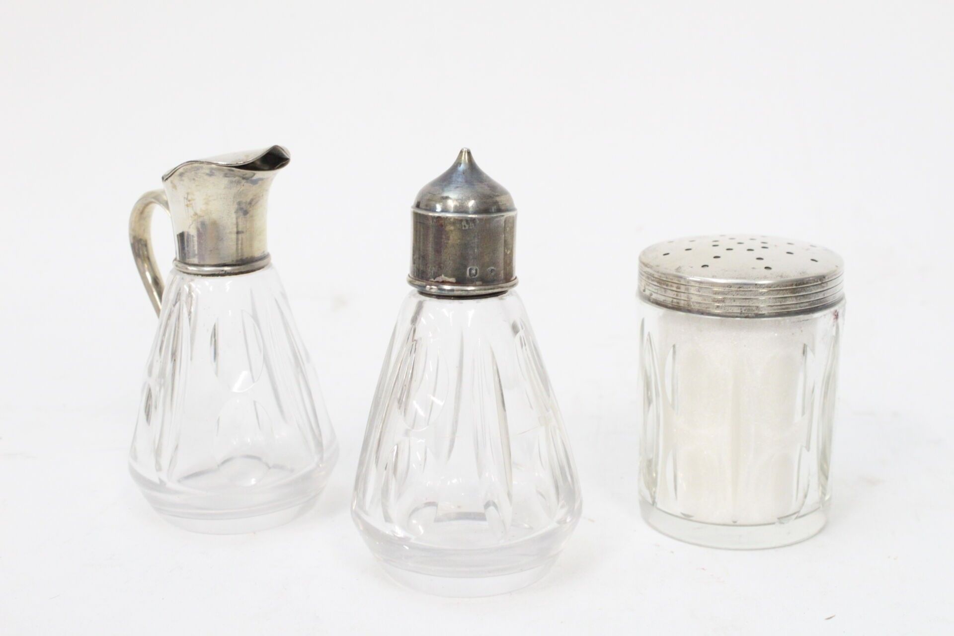 Réunion d'un huilier vinaigrier, saupoudoir en cristal taillé à monture en argent poinçon Minerve PB: 784 g