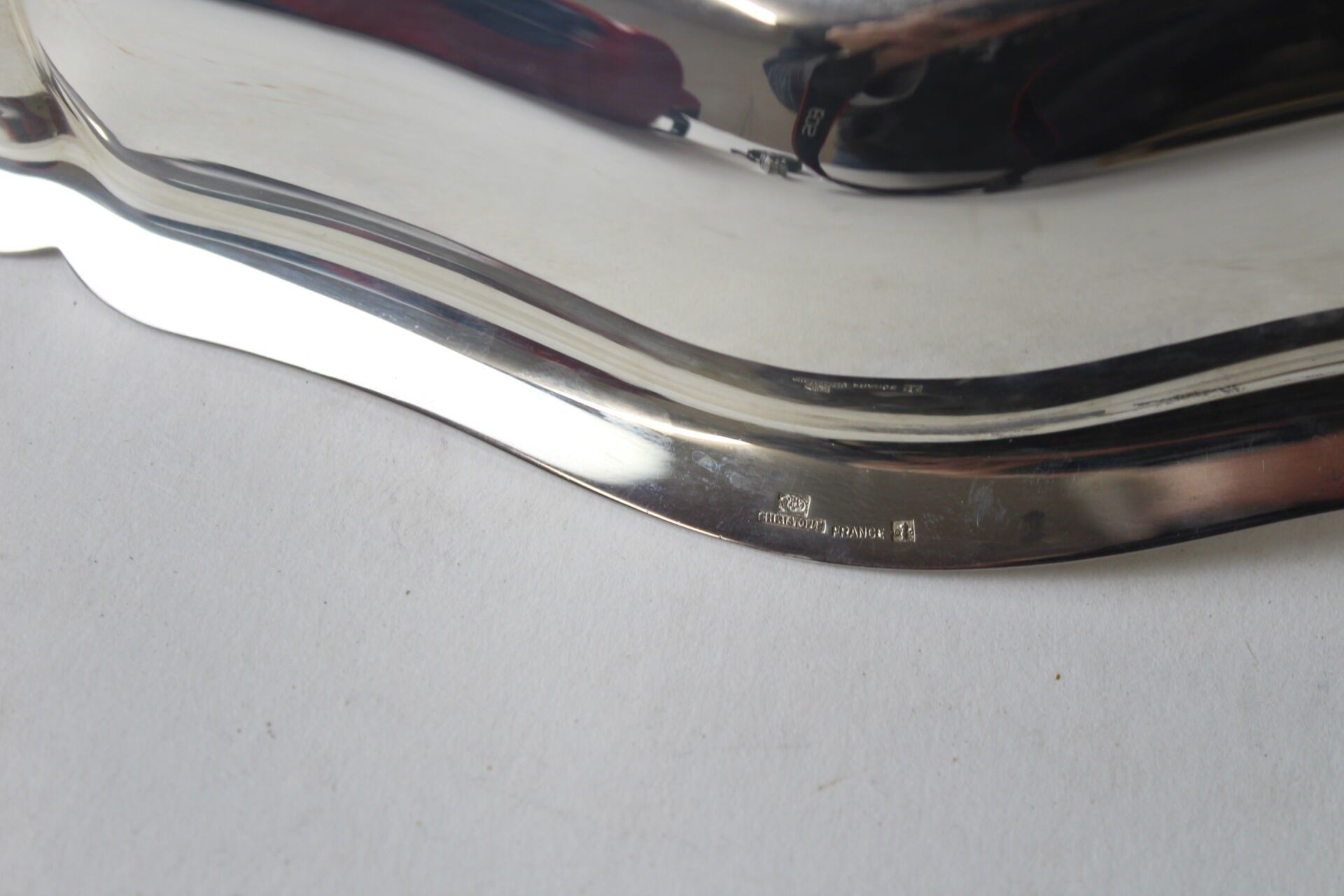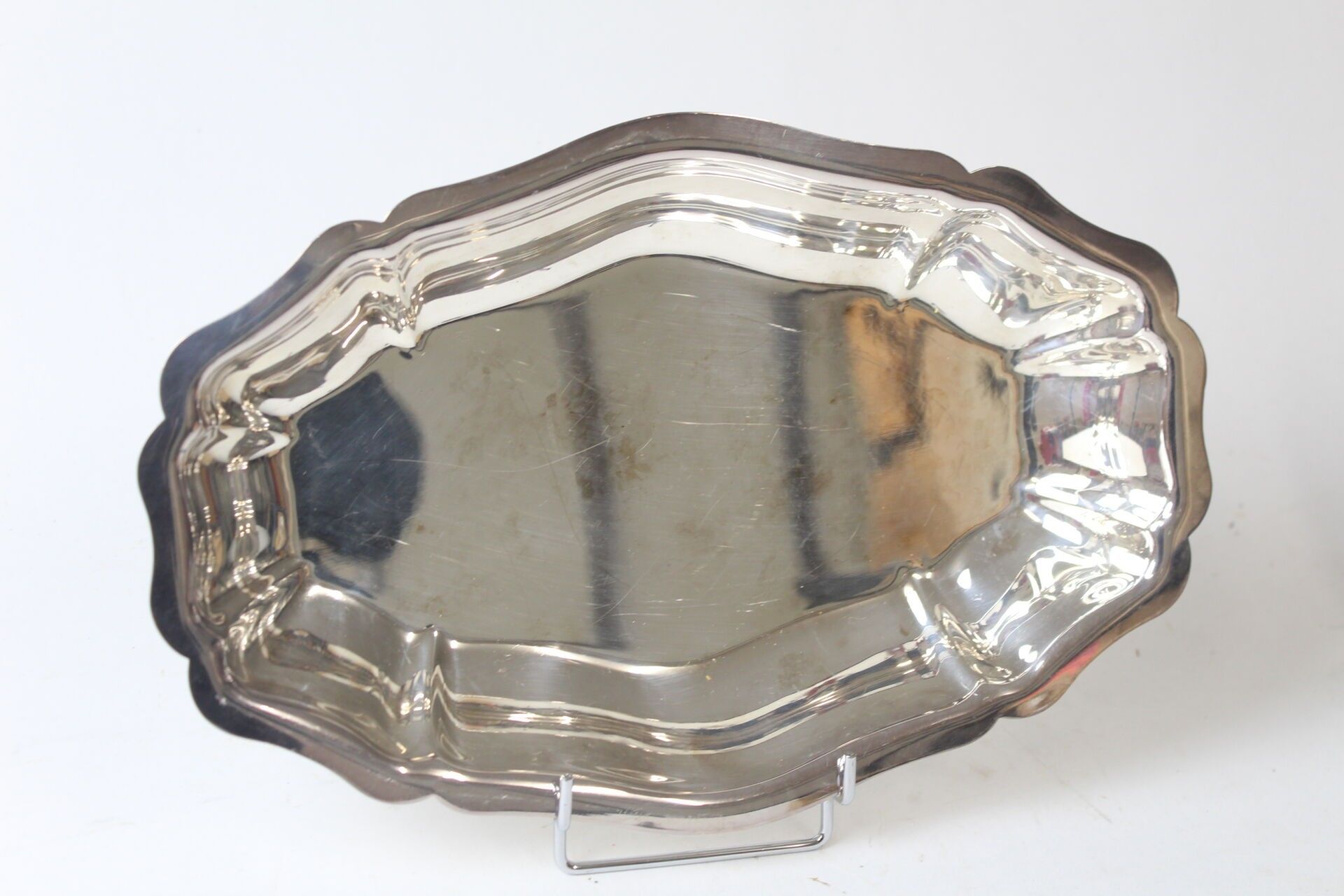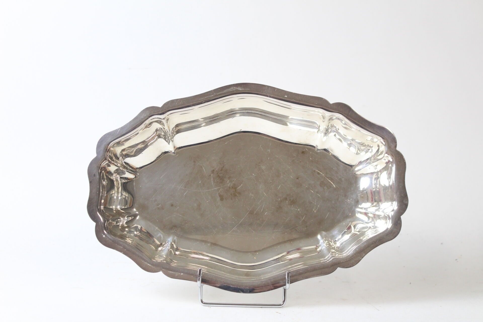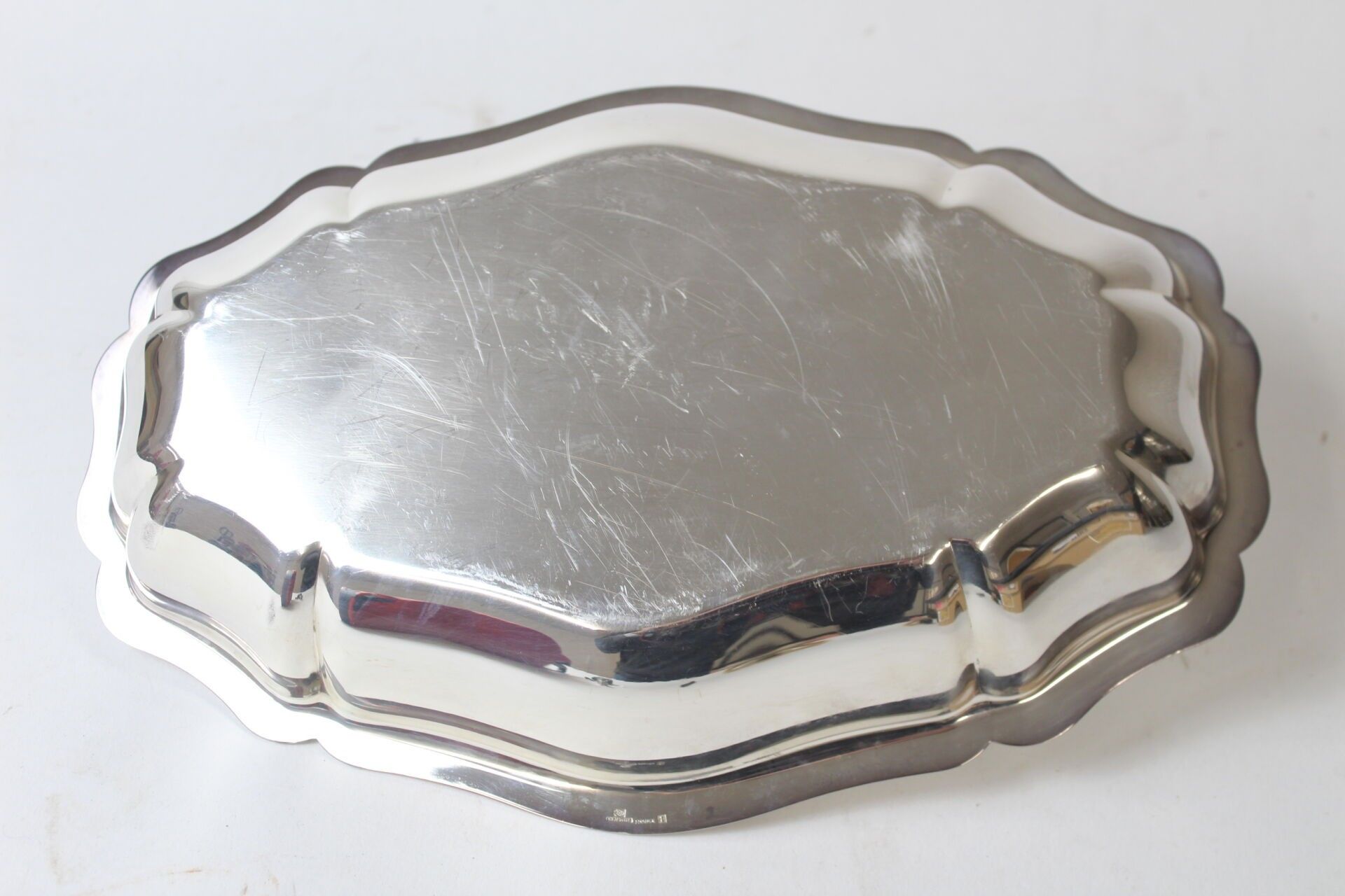 CHRISTOFLE plat creux ovale en métal argenté à bords chantournés L. 34 cm (rayures)